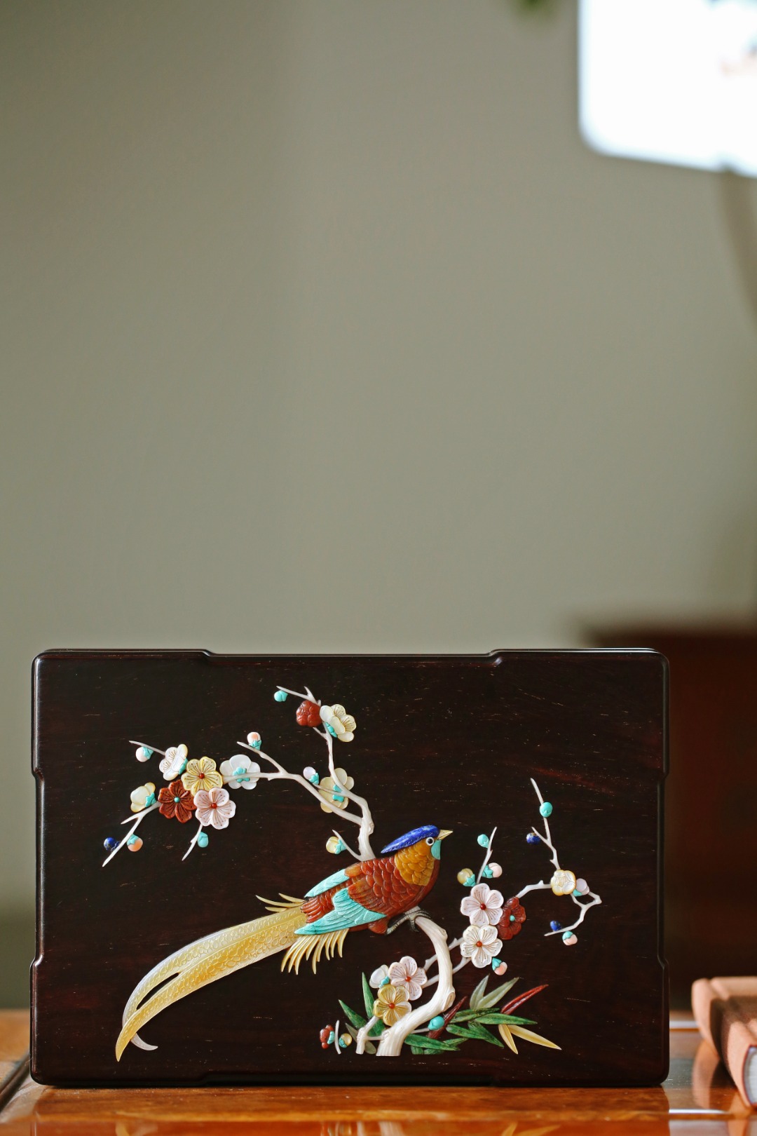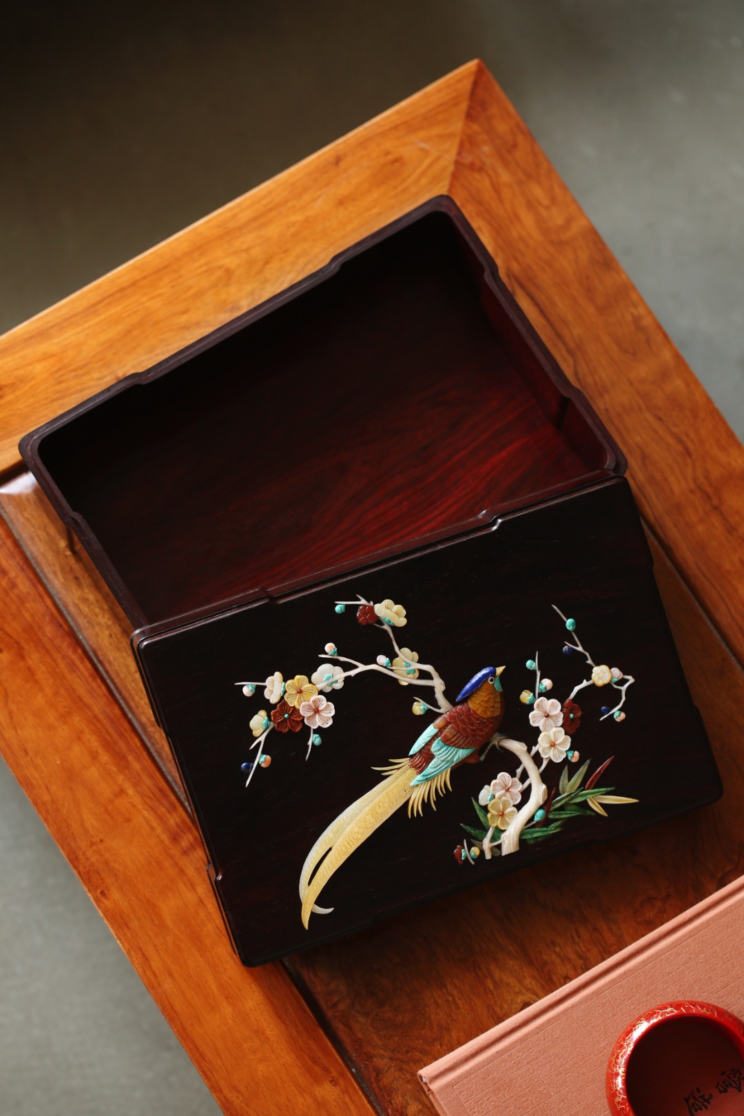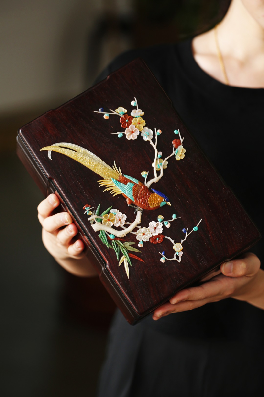 盒盖以百宝镶嵌,寓意祥瑞,