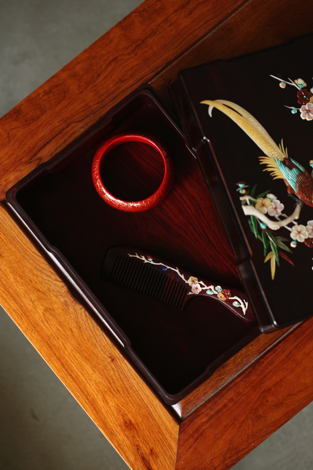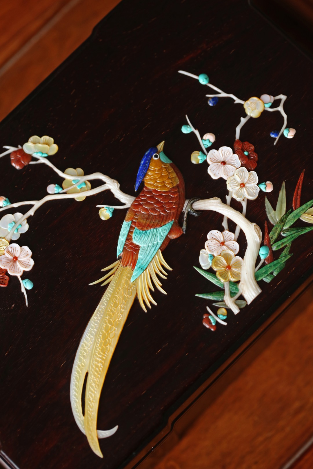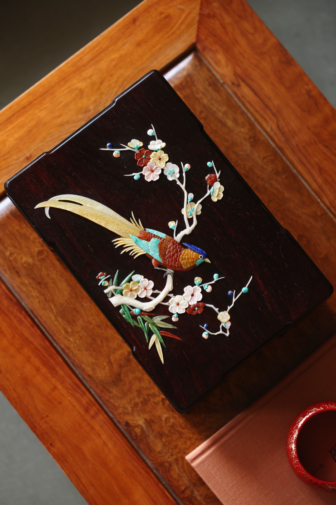 盒盖以百宝镶嵌,寓意祥瑞,
