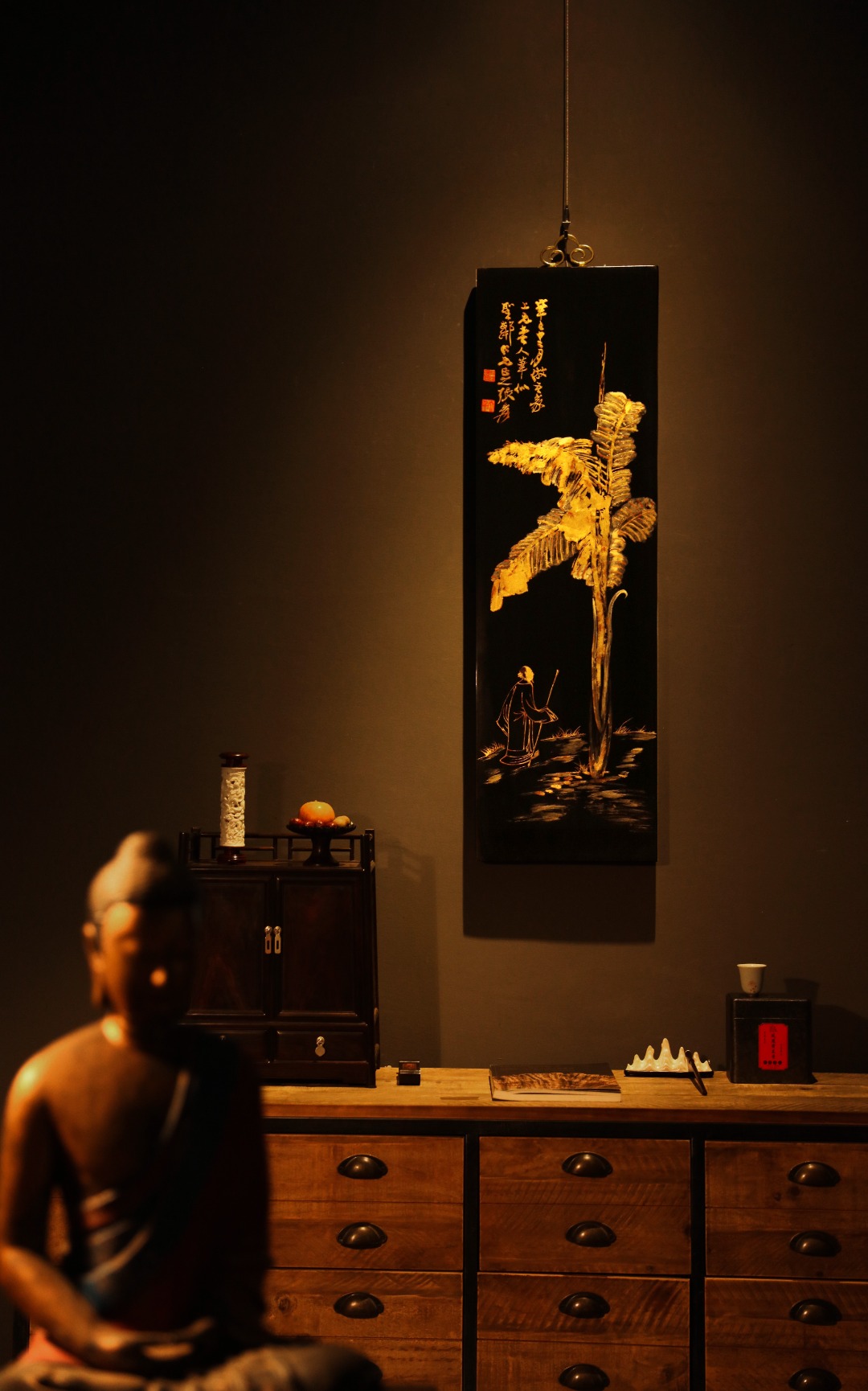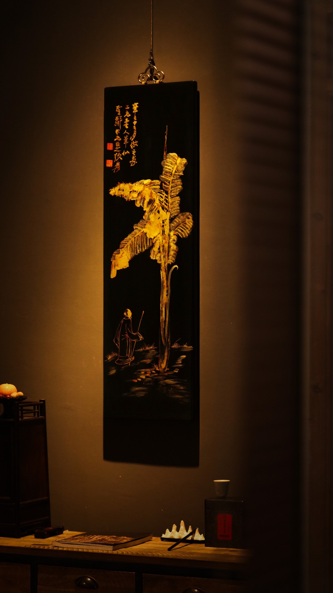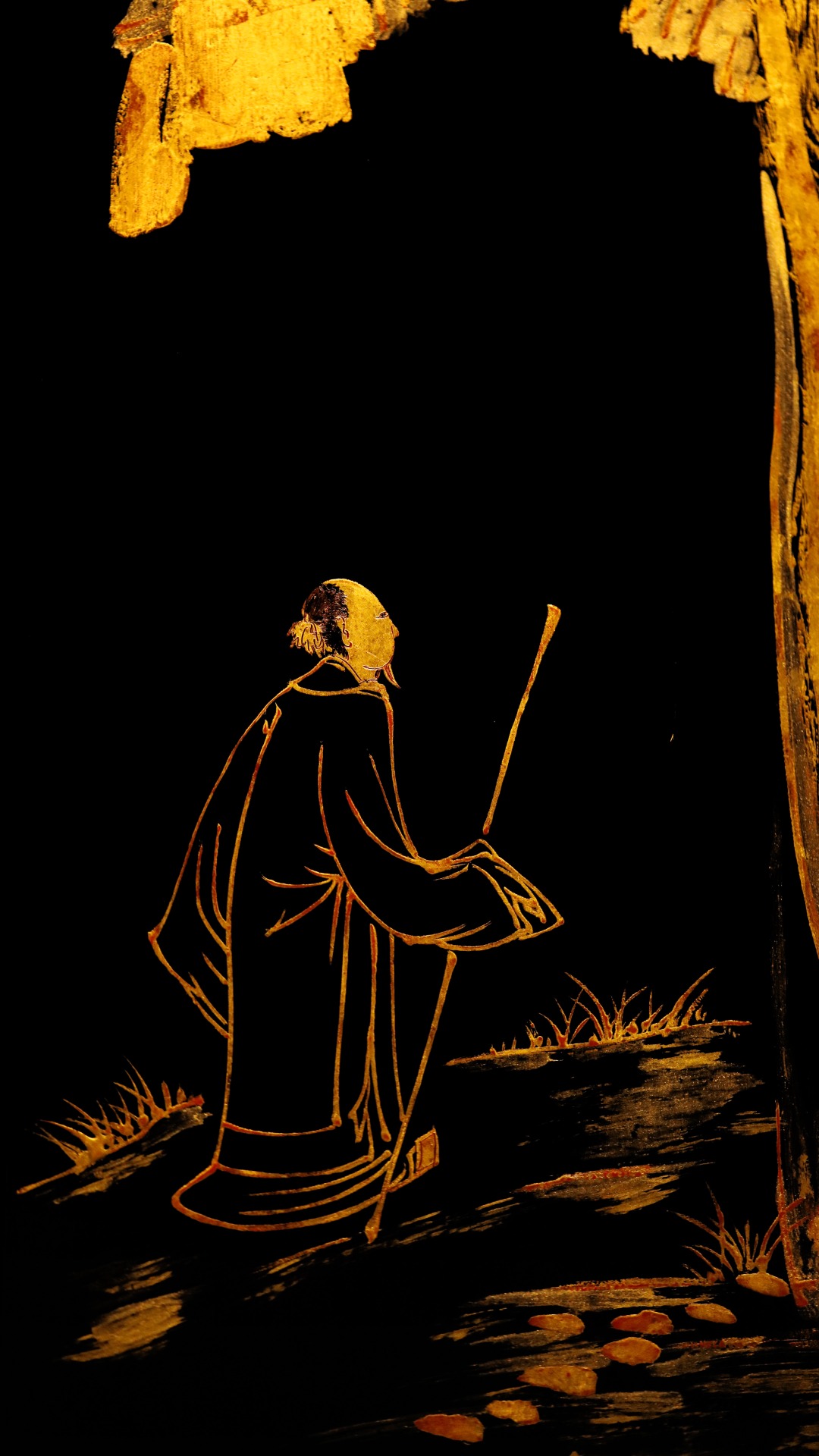 裱布刮灰,面髹黑漆,后又真金漆绘图;
