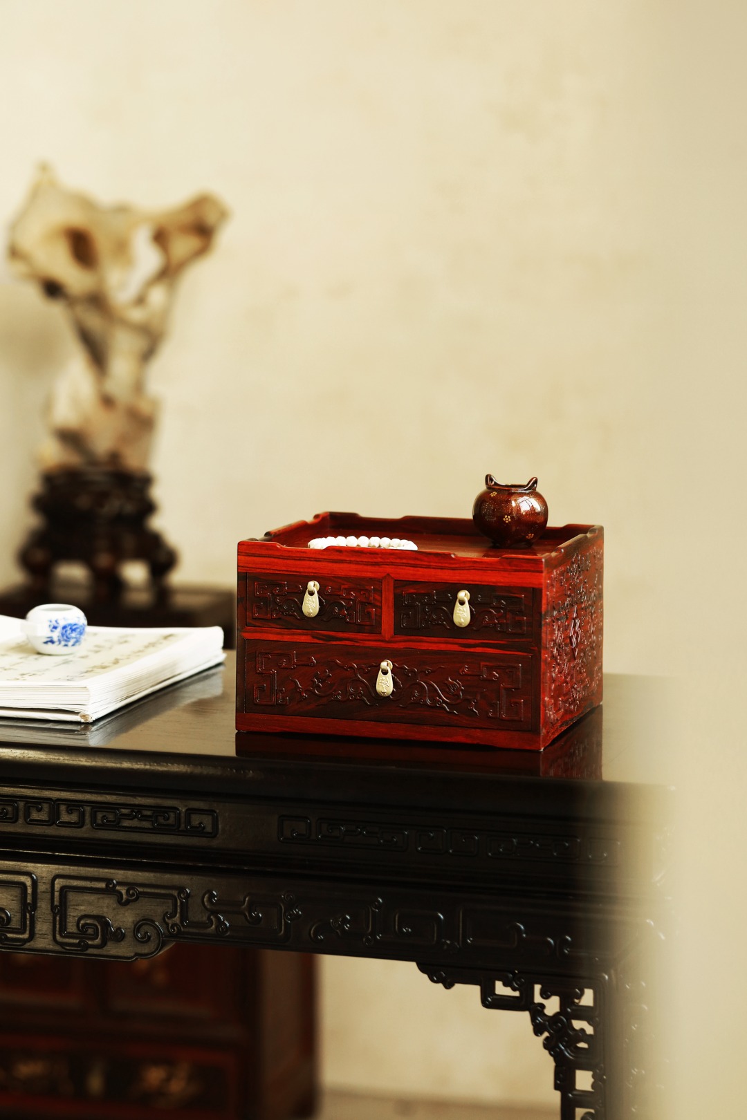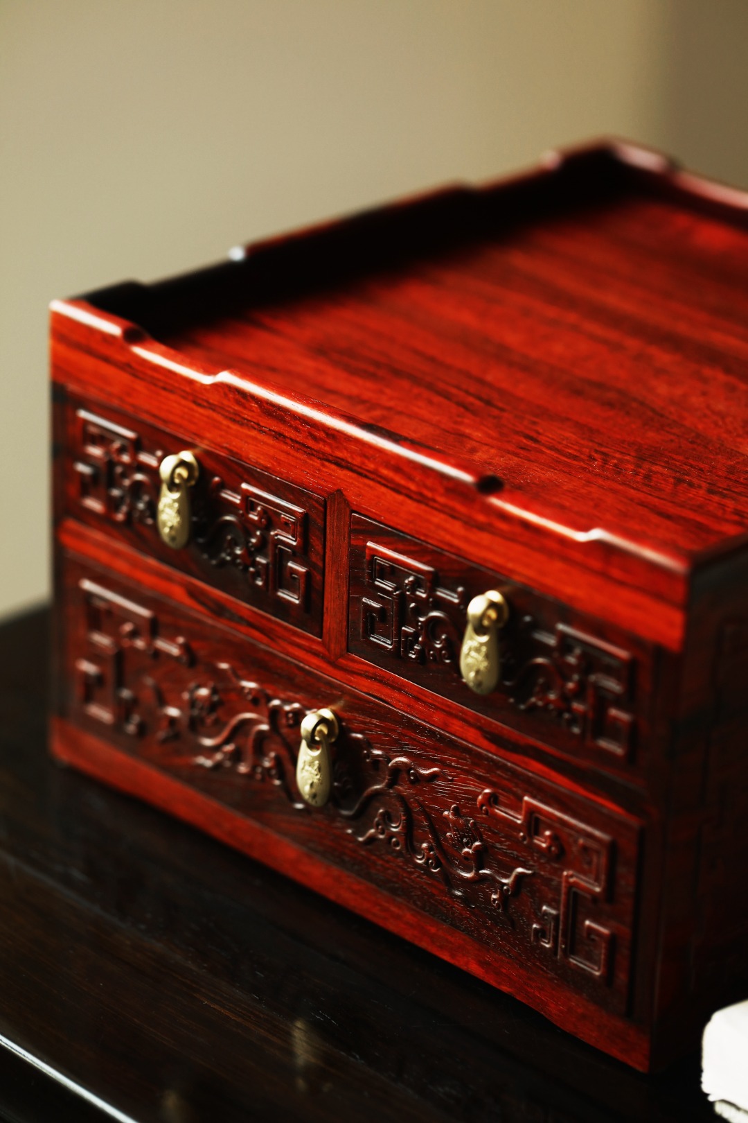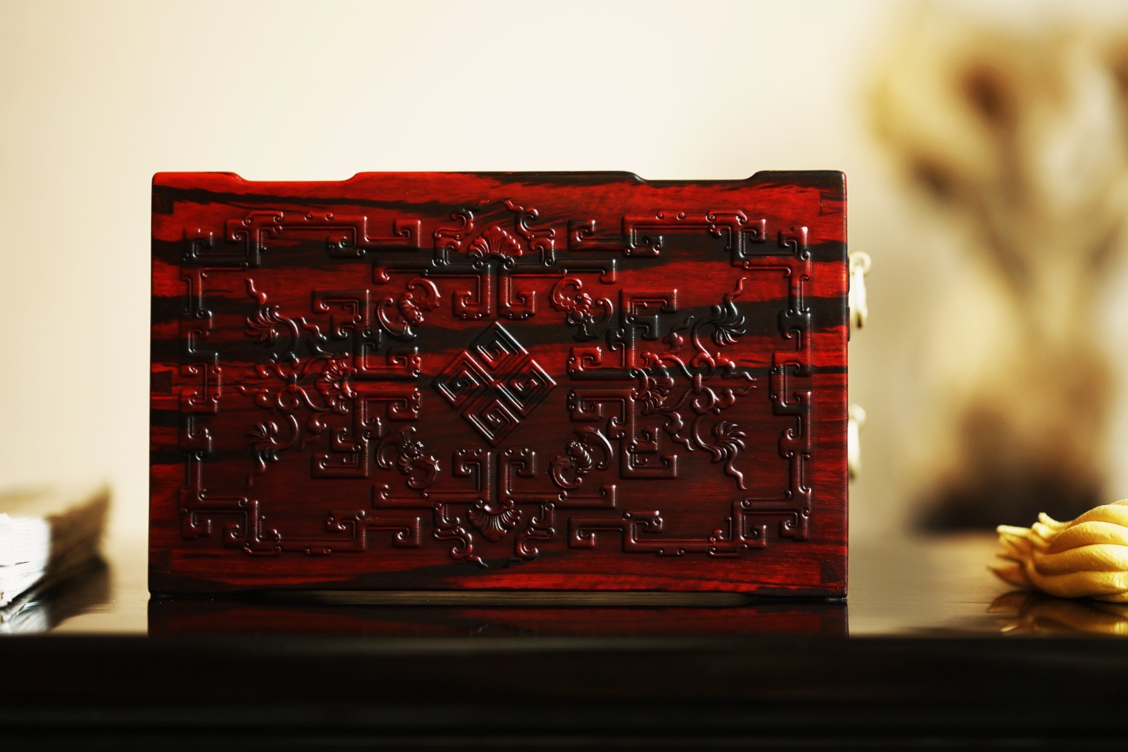 造型端庄方正,满雕卷草、蝙蝠、拐子龙饰