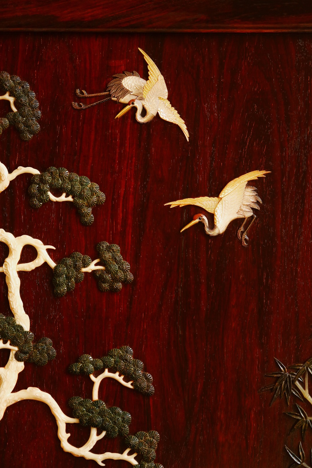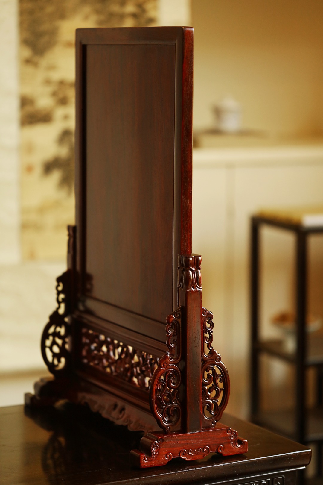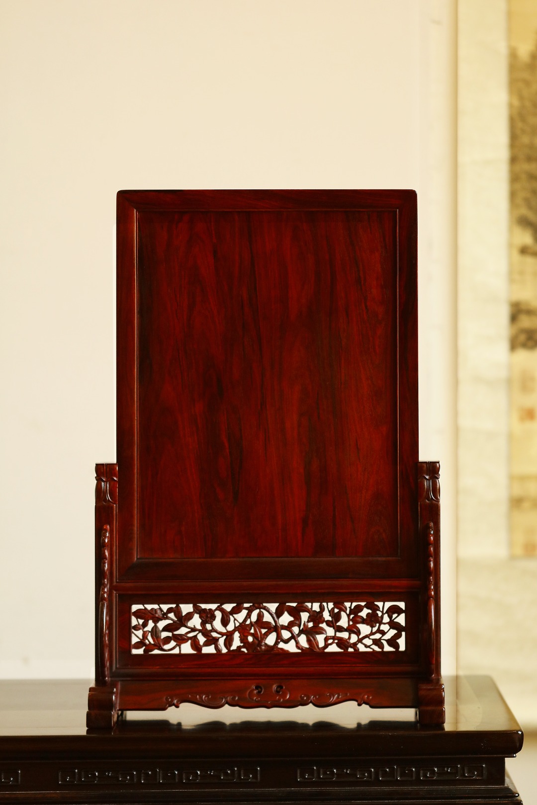 小叶紫檀老料制器,屏心百宝巧嵌鹤鹿同春图纹,古雅隽丽之韵,屏座镂空、雕工细致严谨,置于书斋桌案,悦目消乏,堪称文房妙物。