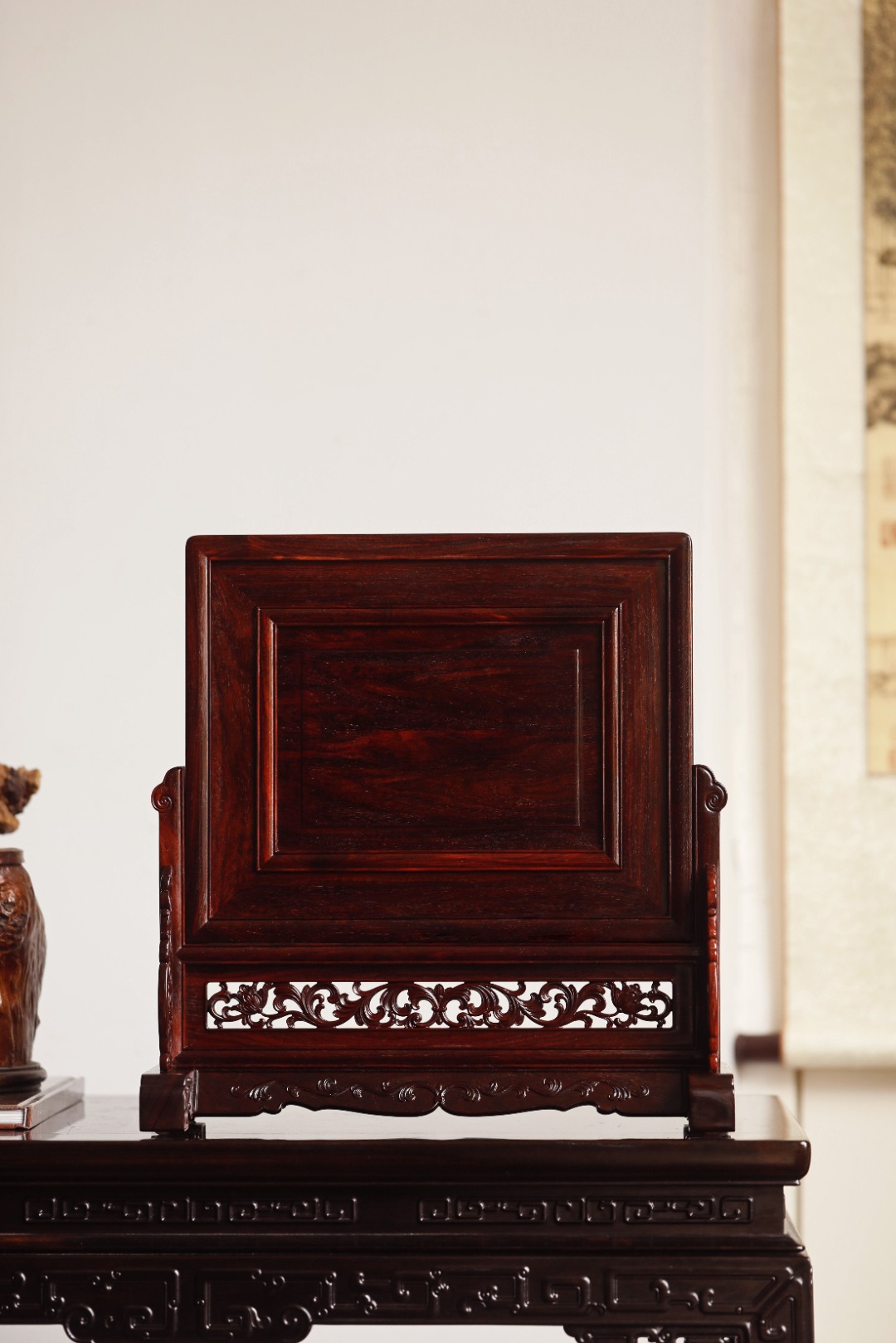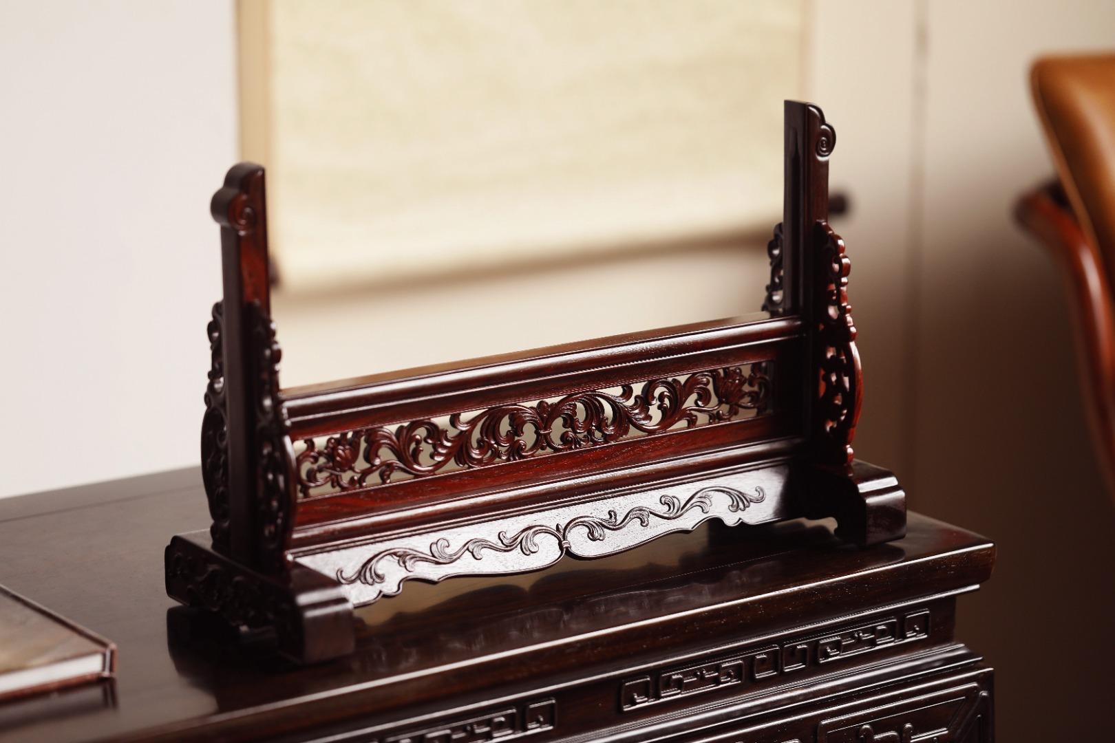 底座雕刻雷云纹、卷草纹和番莲纹,