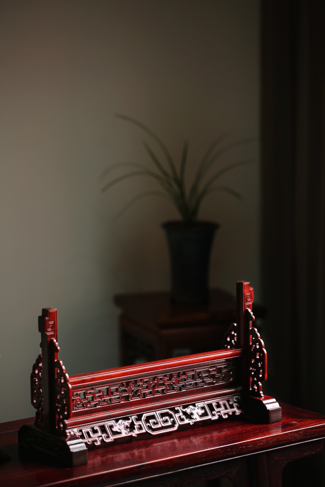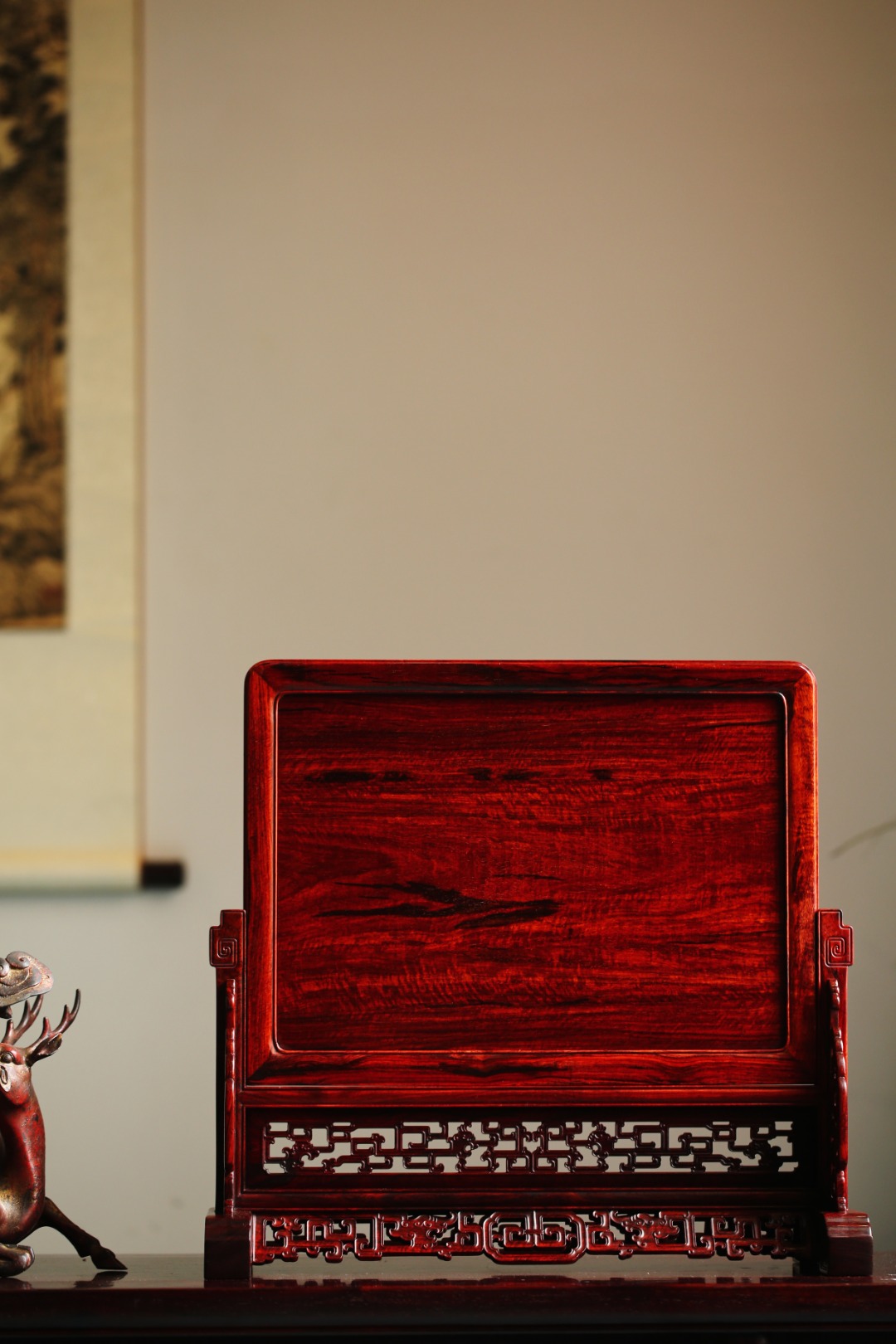 屏座镂雕螭龙纹,雕工细致严谨,