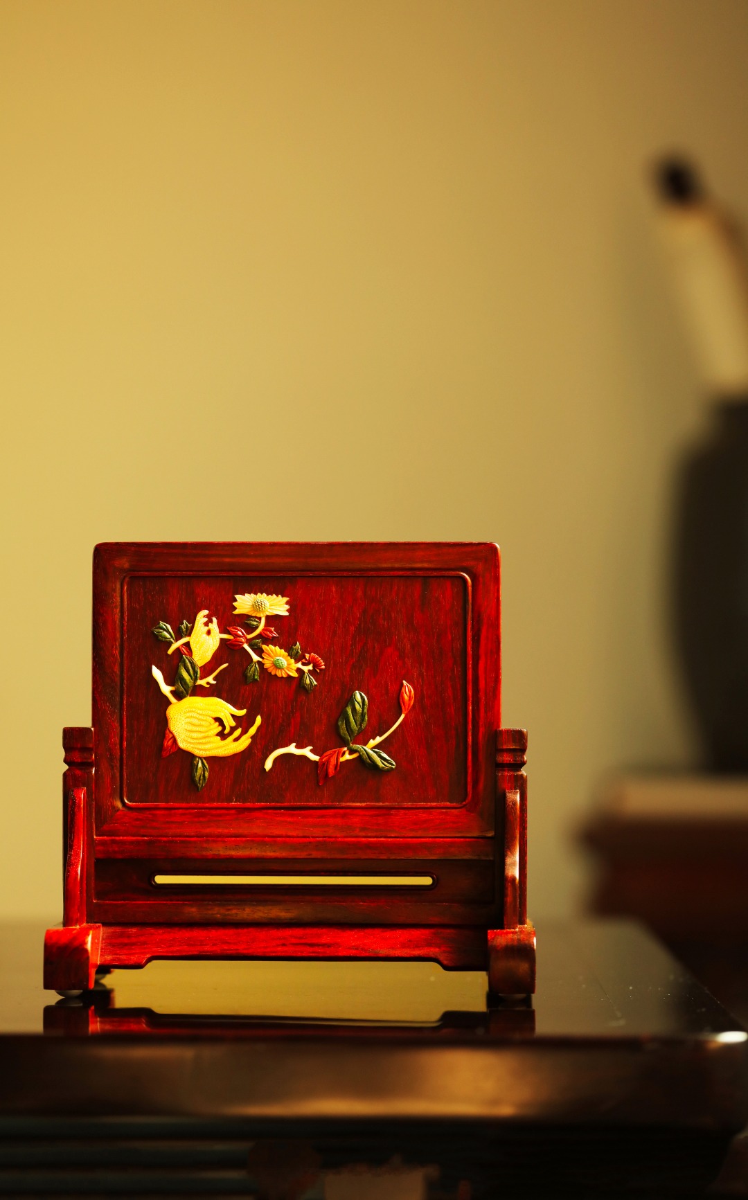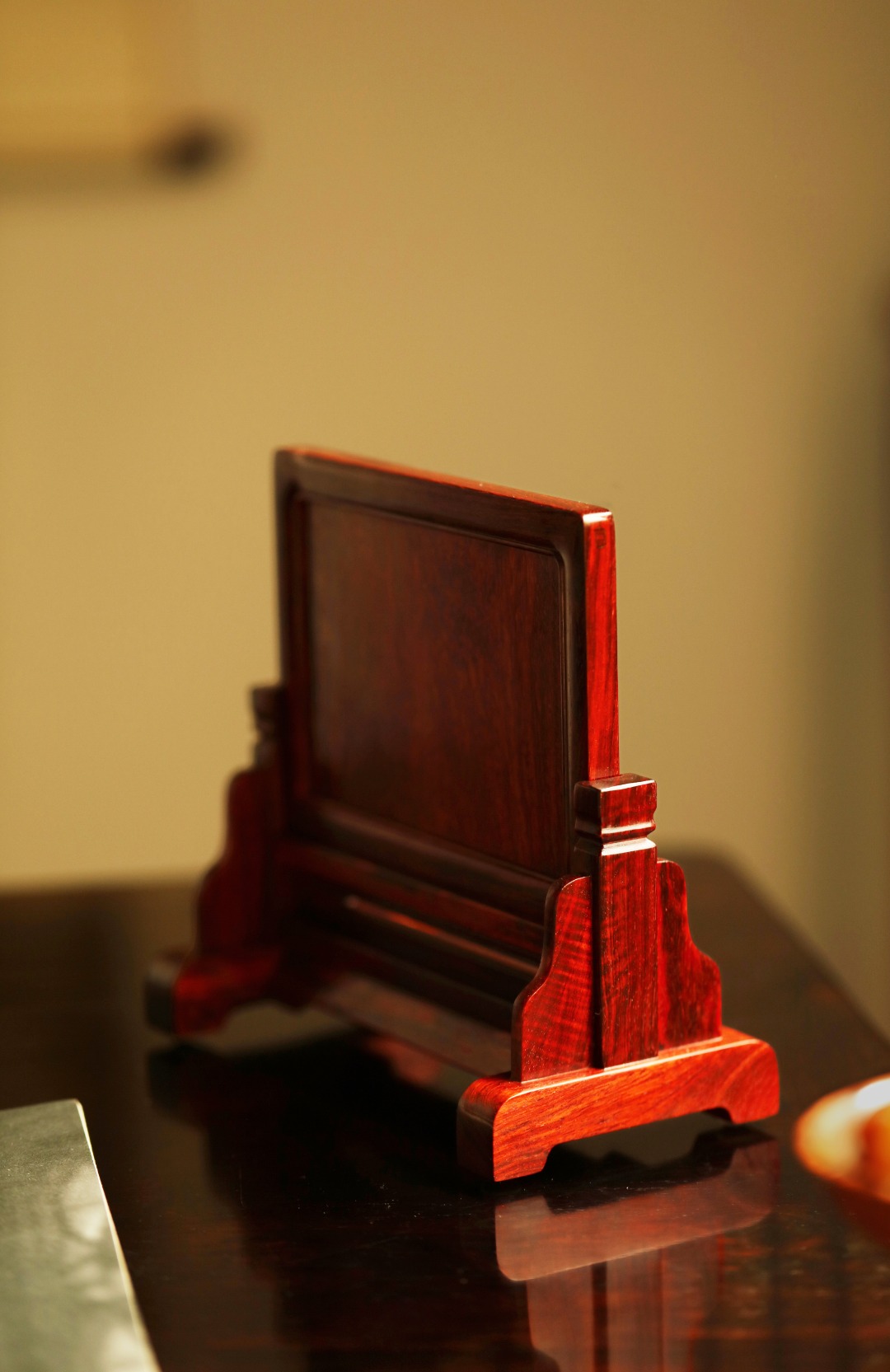 紫檀油润老料制,经典器型百宝嵌作清供图,琳琅满目,置于书房案桌,自有一番“文房案头砚有屏,挡风蔽日笔生花”的情趣。