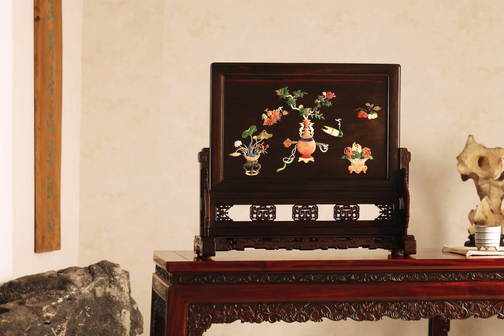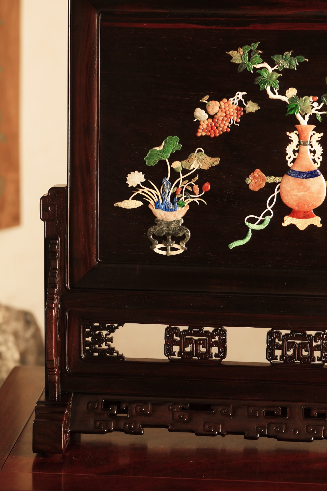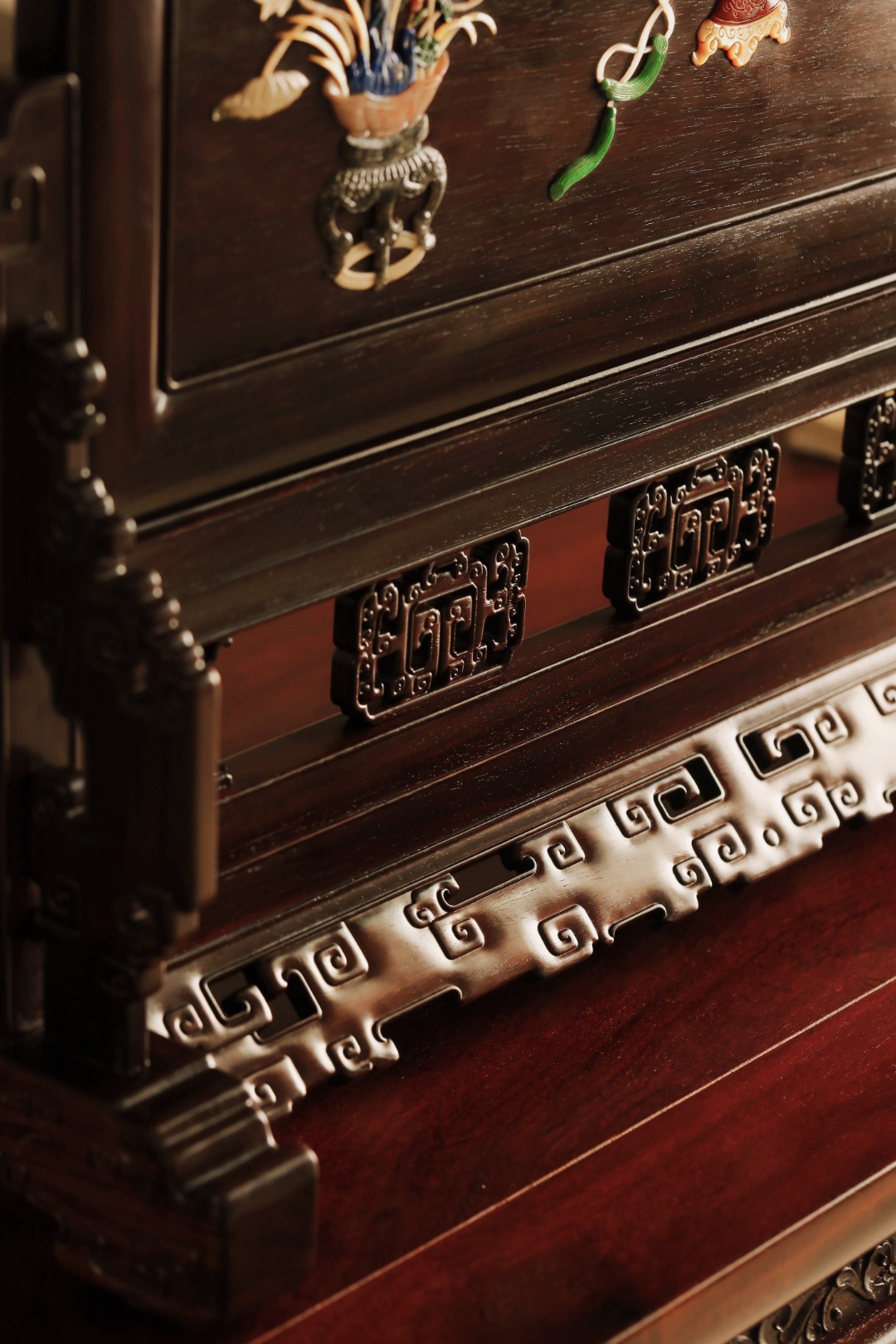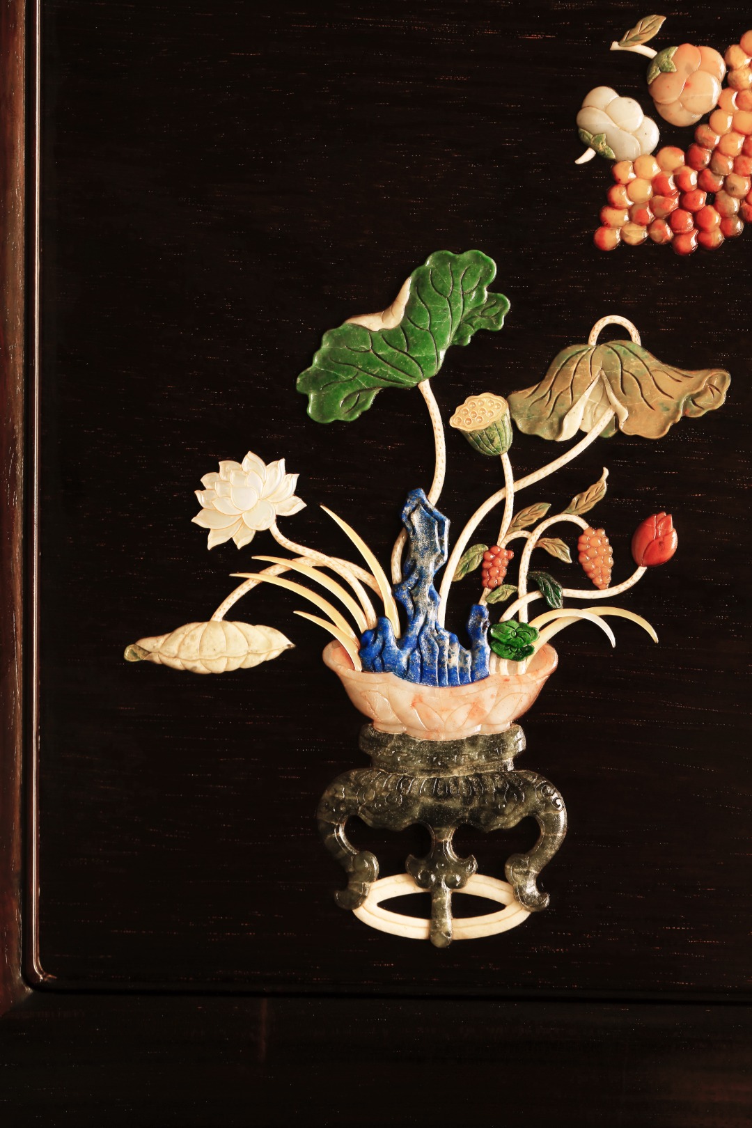 屏心以百宝诸珍镶嵌,寓意吉祥。