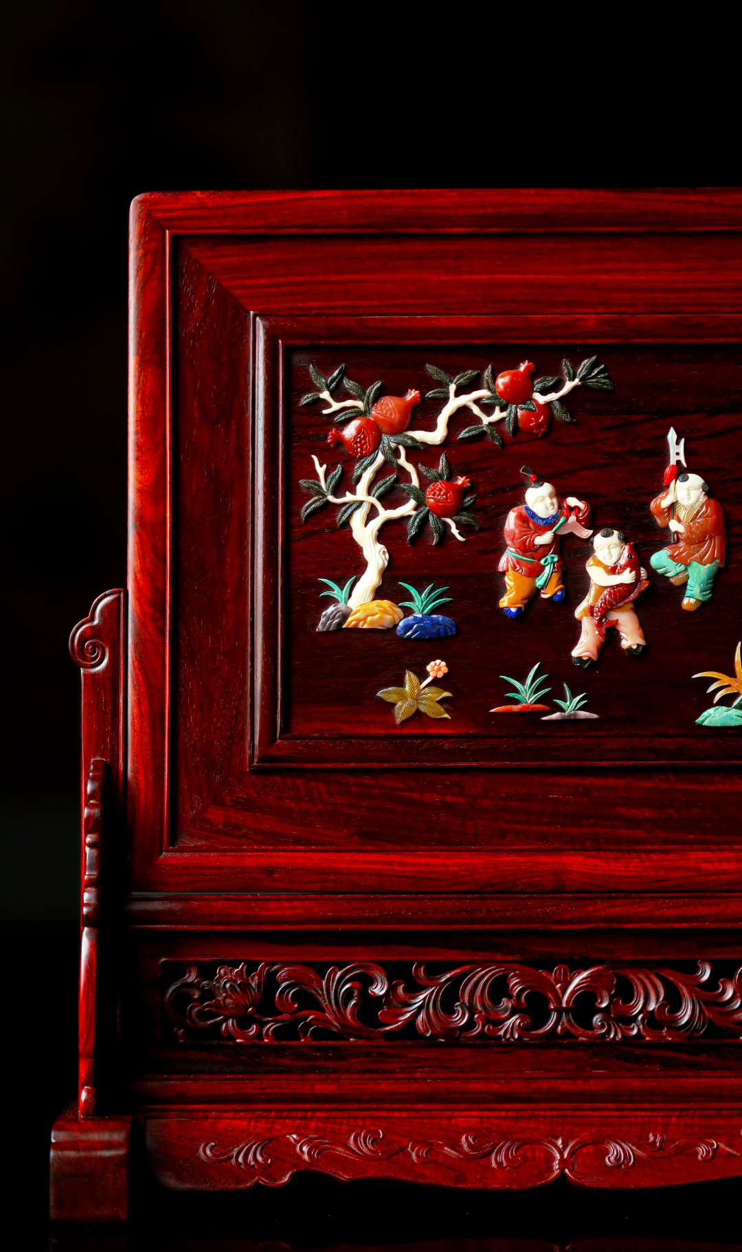 紫檀老料制,榫卯精工,屏心名贵玉石百宝嵌石榴童趣图,榴开百子,喜乐多福,自在悠闲,案头陈设,寓意甚佳,可作馈赠佳礼。