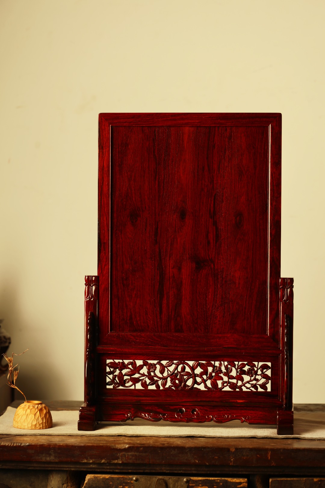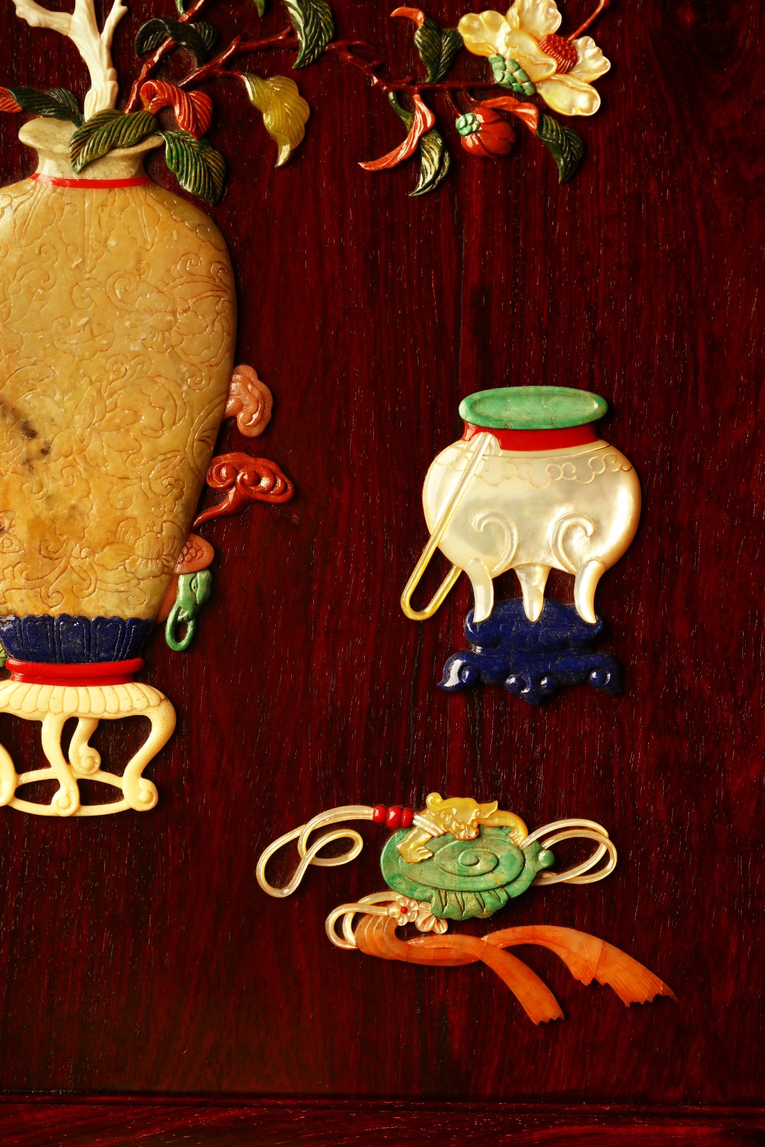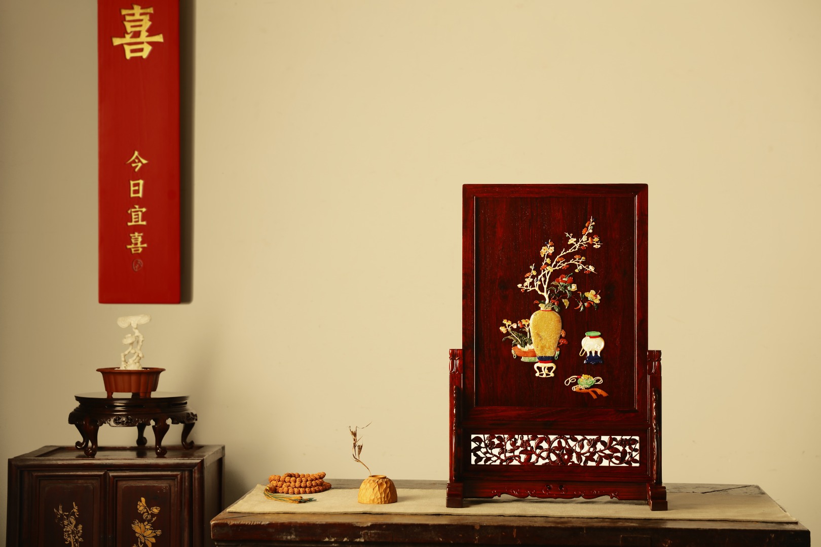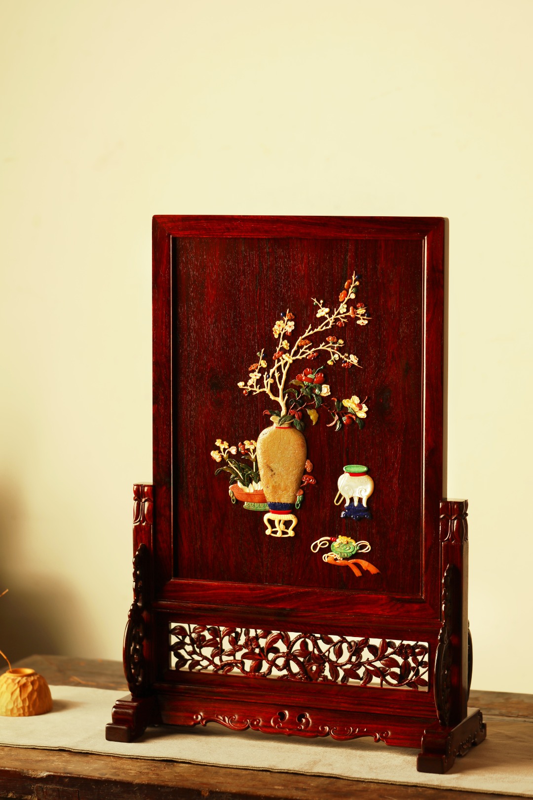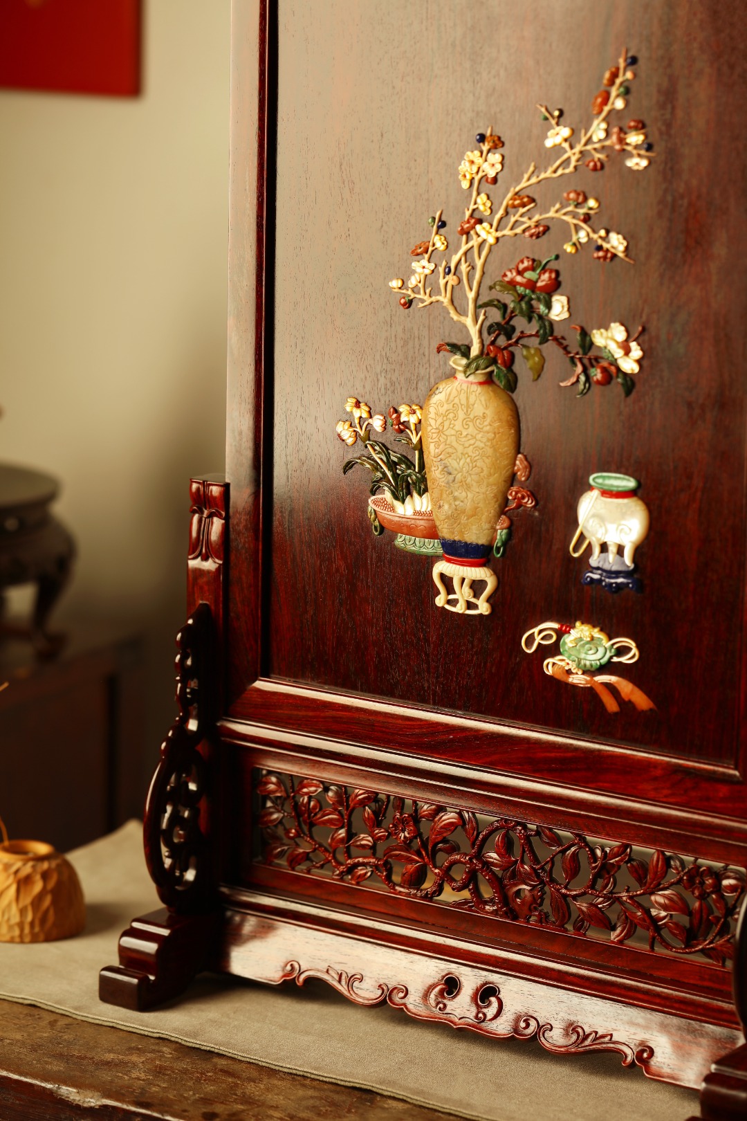 器型典雅,屏心宫廷百宝镶嵌清供·博古图,配色清新通透,屏座透雕纹饰,琢刻精细入微,构图清和。精巧华贵而不张扬,家居陈设,点睛之笔。