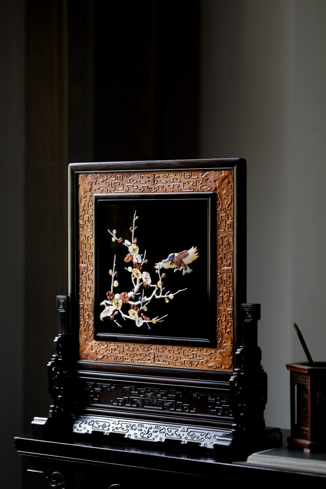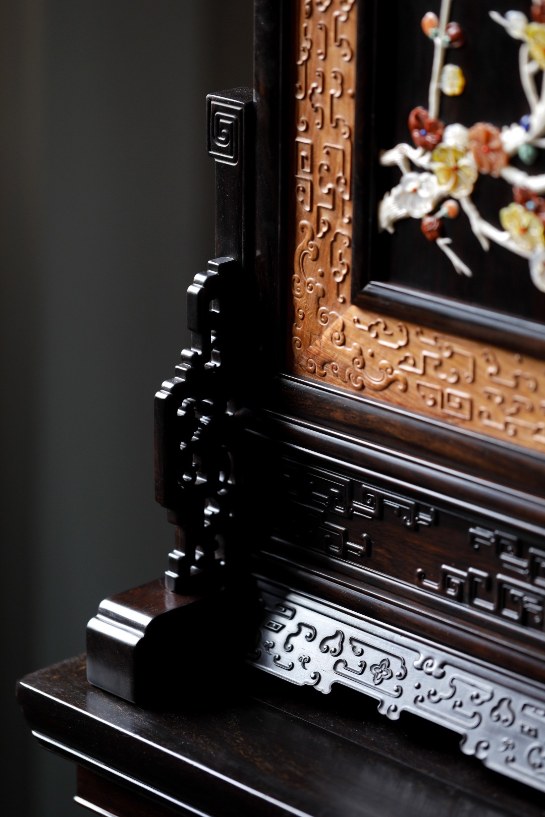 紫光檀攒框镶缅花面板,