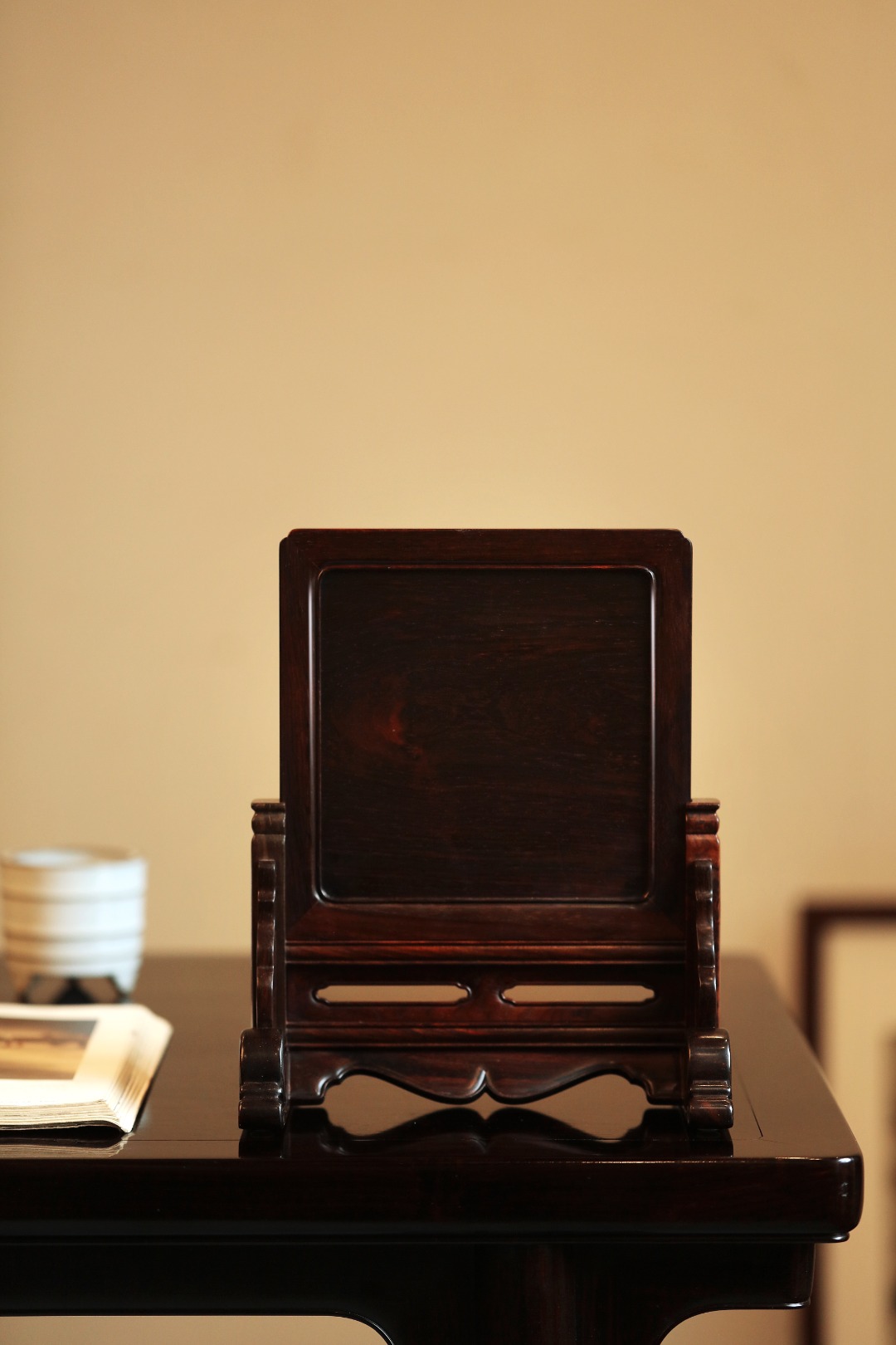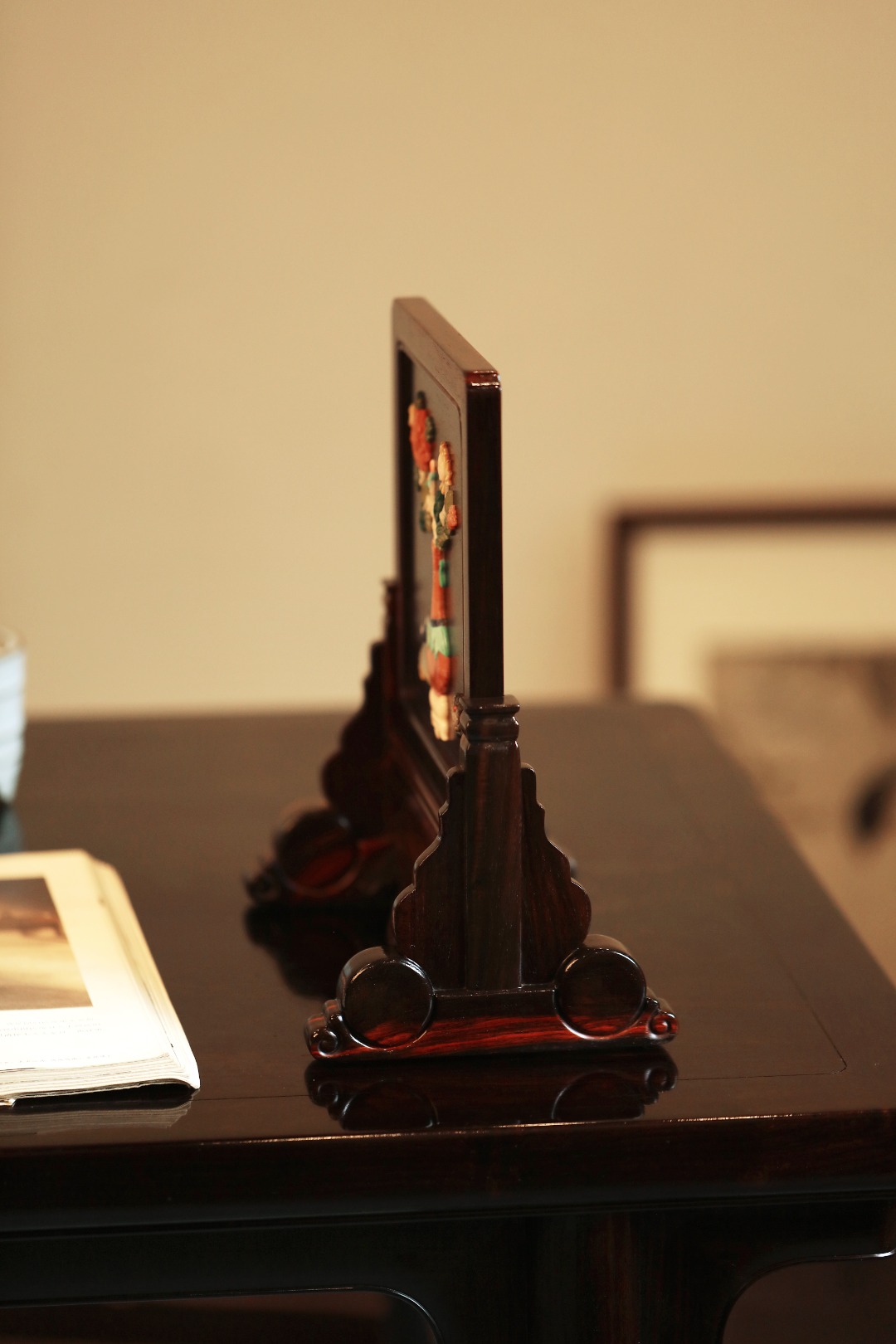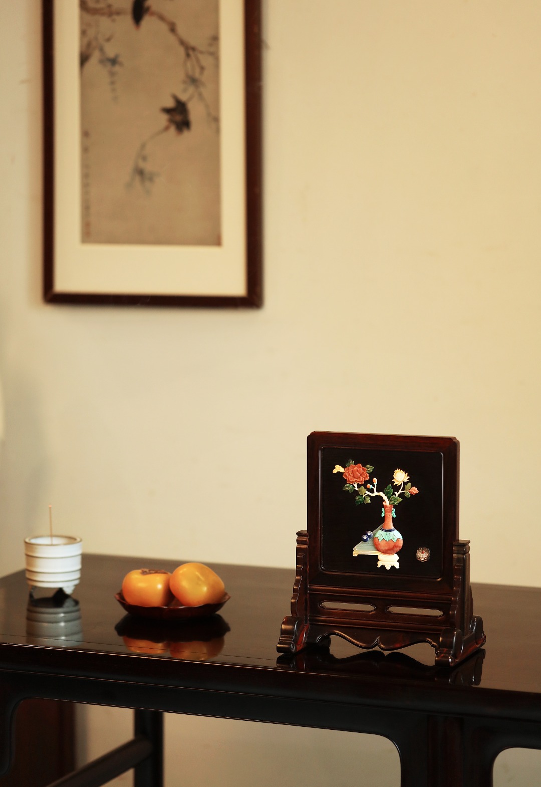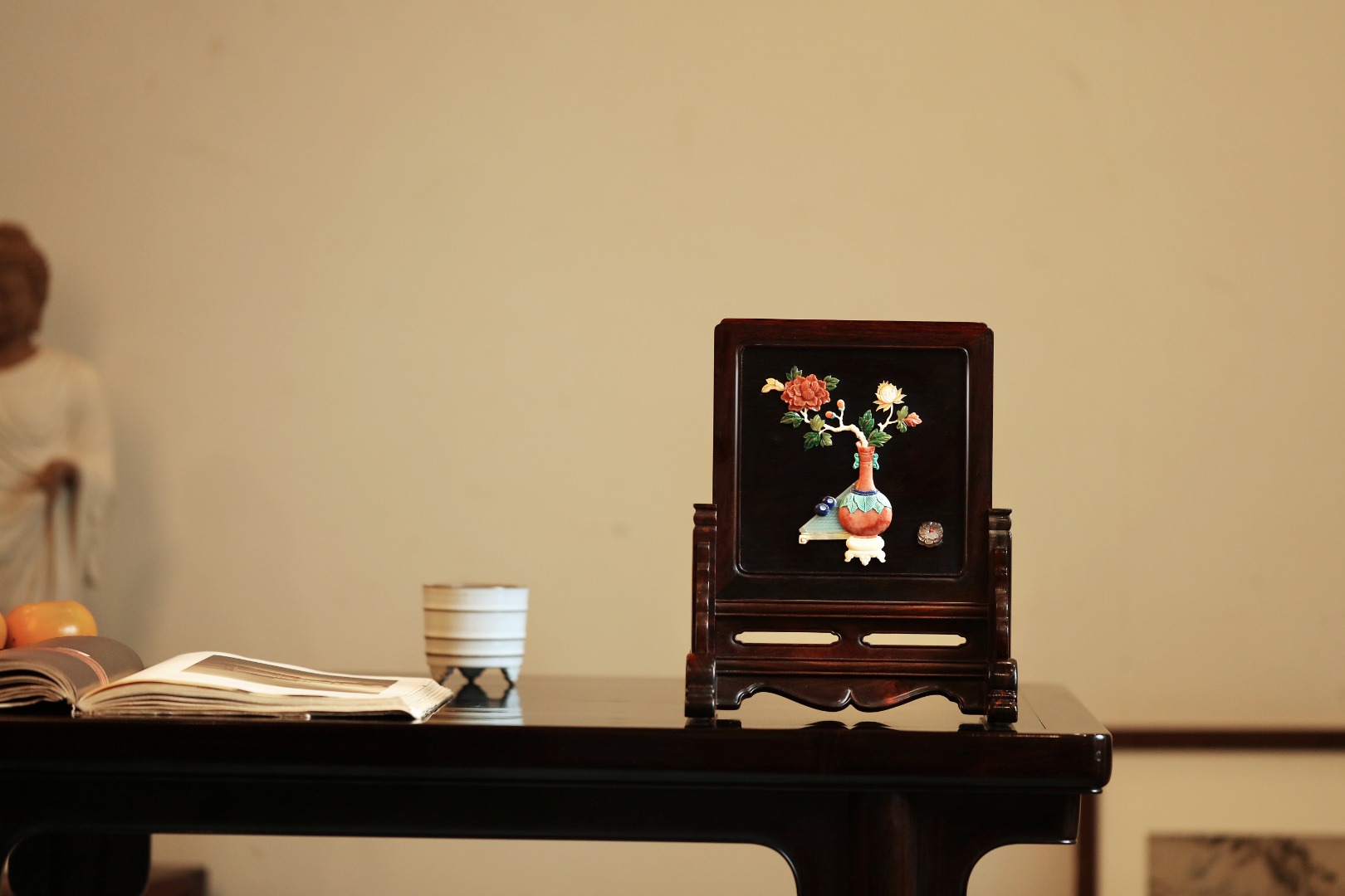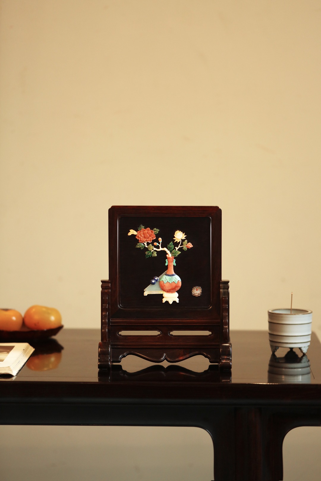 择取酸枝老料所制,百宝嵌“清供图”,整器线条优美空灵,配色清雅,置案清赏,添祥和雅意。