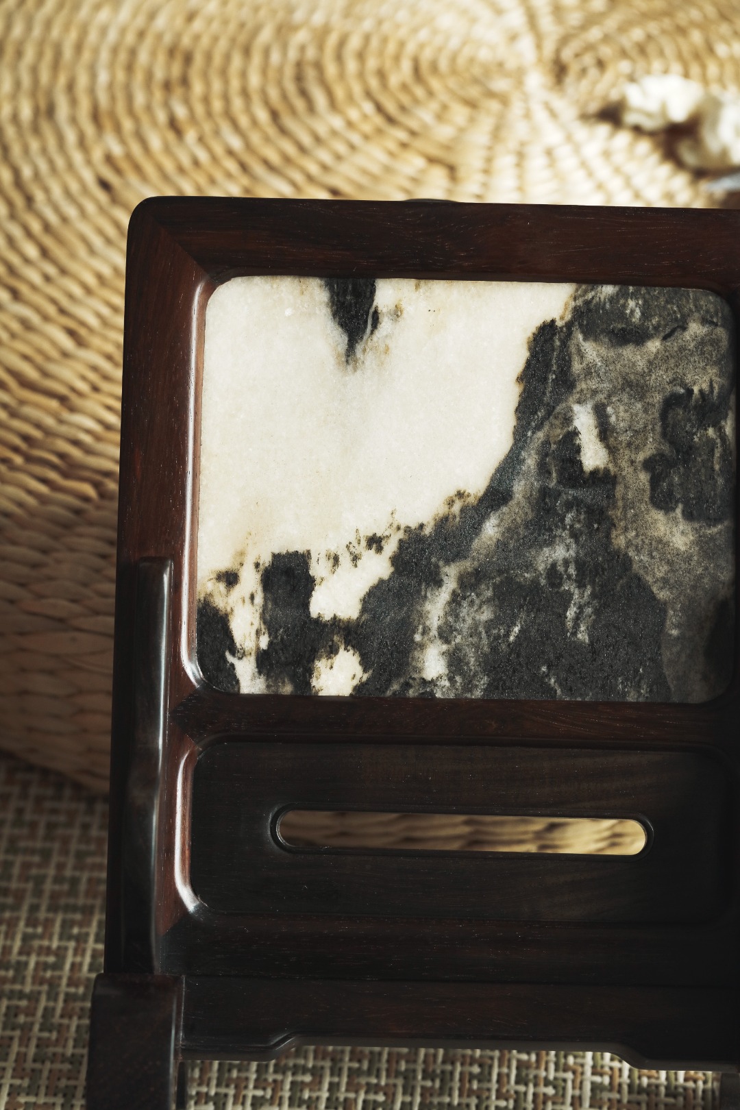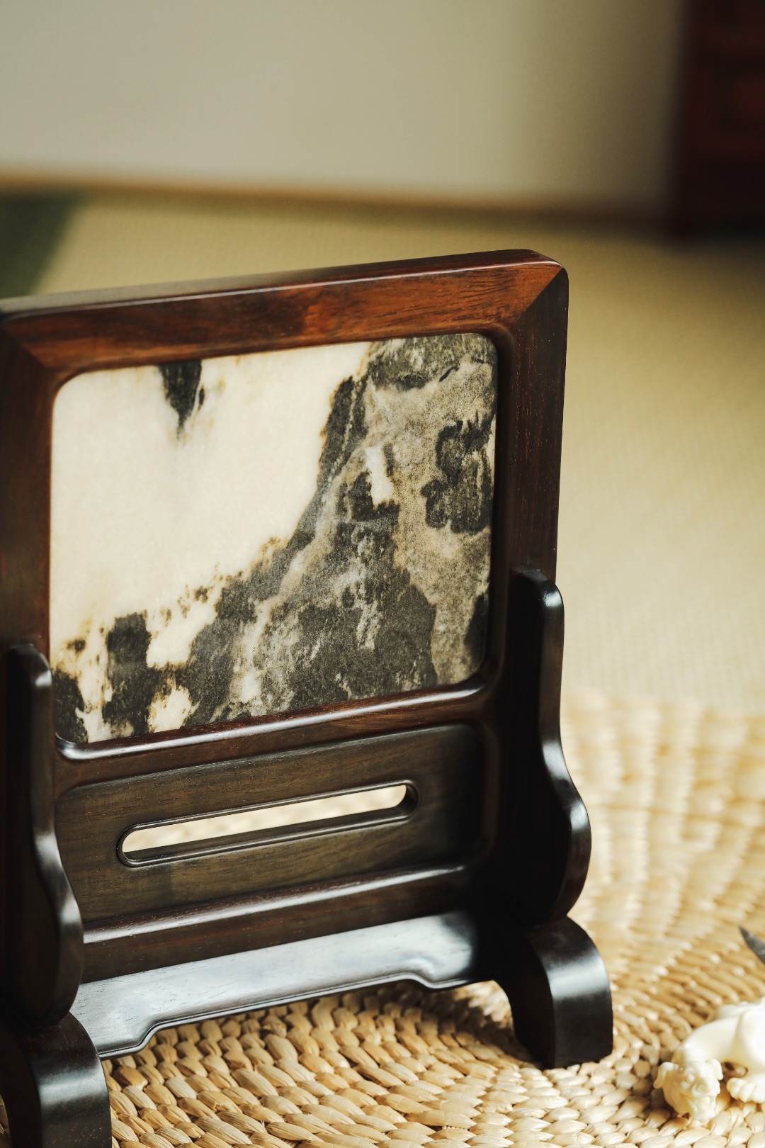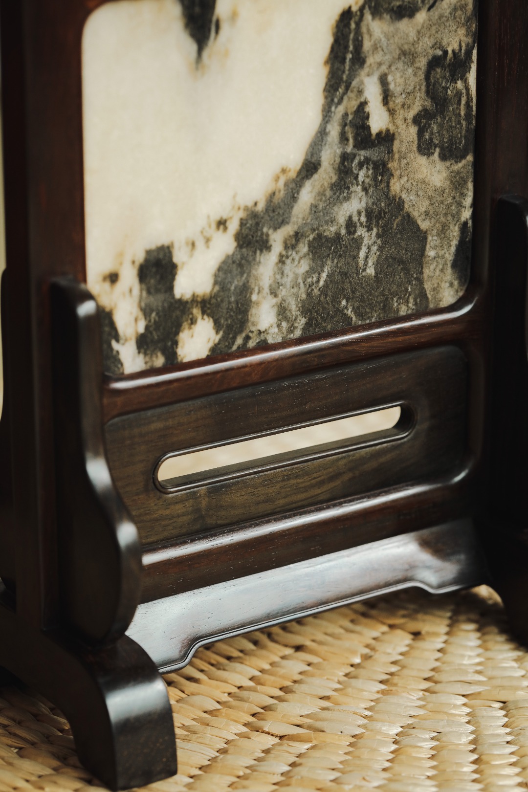 大红酸枝老料制,色泽沉稳,屏镶云石一方,山水并具,云雾奇幻,两侧站牙相抵,士林典藏 同款一比一复刻、器形传统经典。