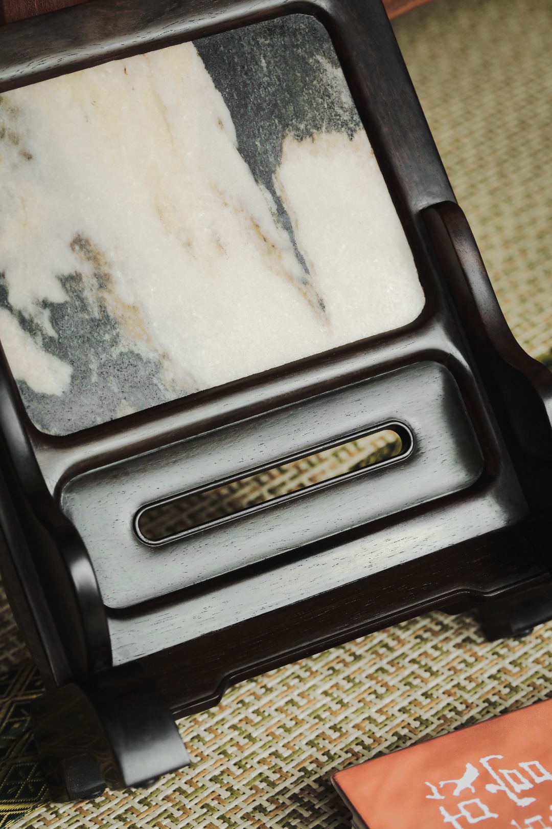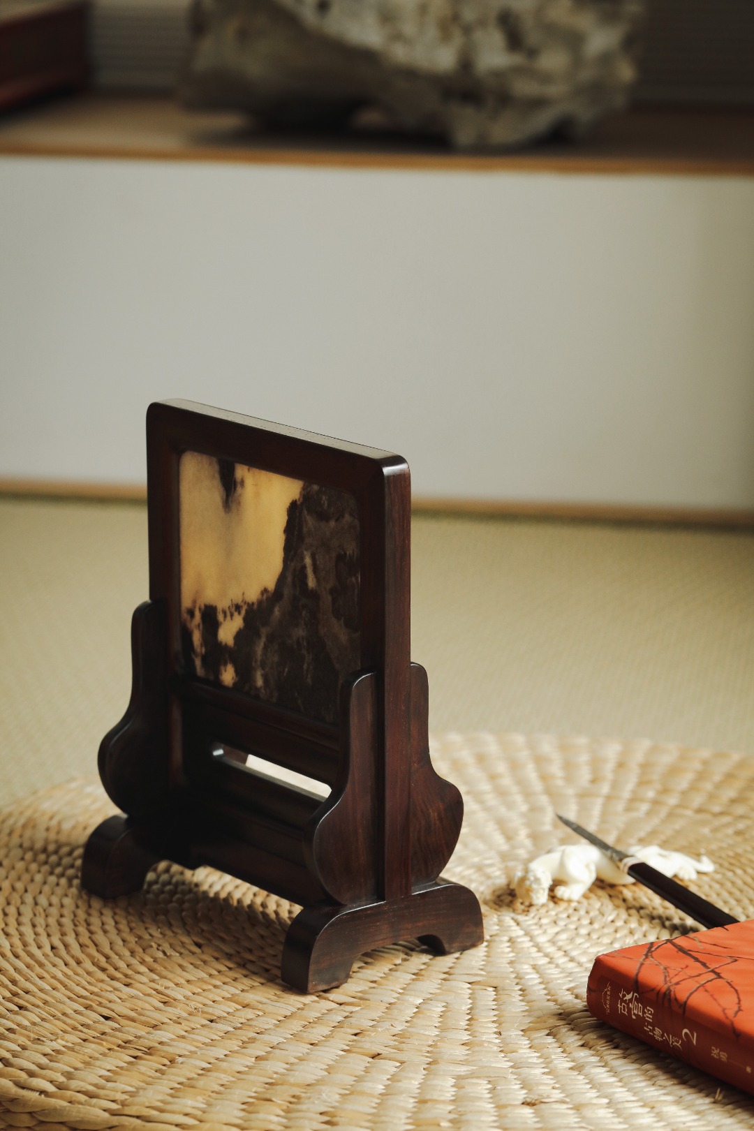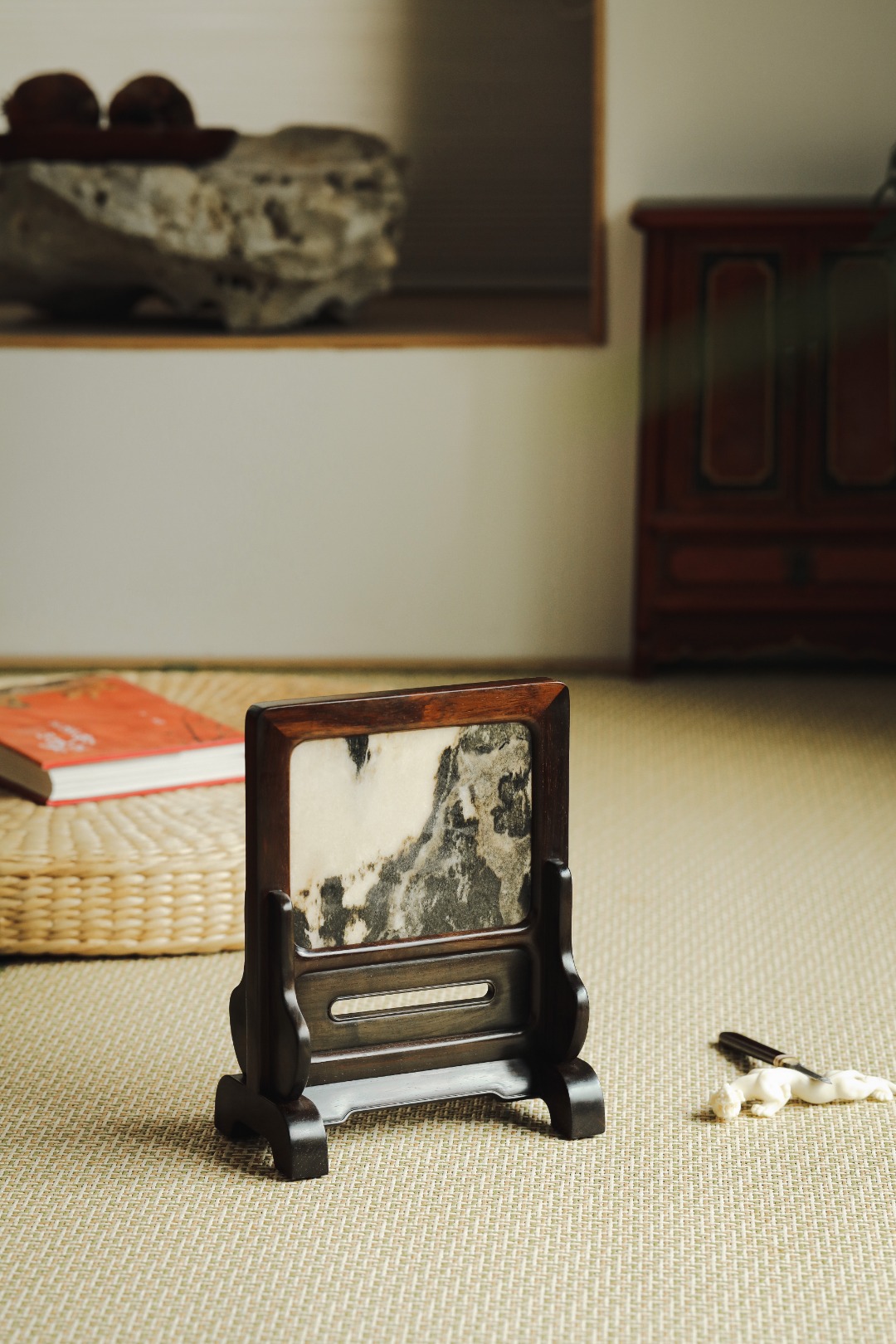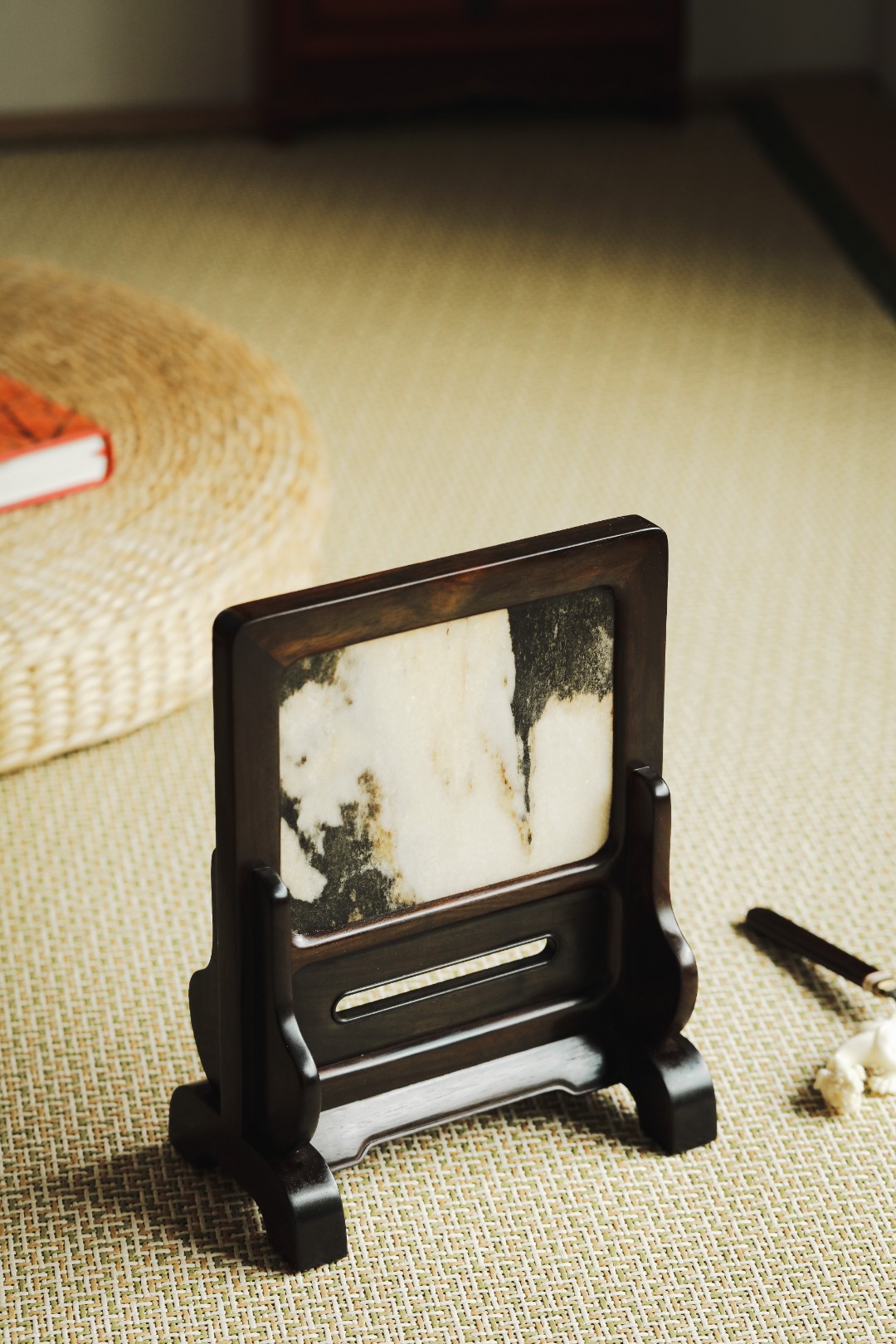 大红酸枝老料制,色泽沉稳,屏镶云石一方,山水并具,云雾奇幻,两侧站牙相抵,士林典藏 同款一比一复刻、器形传统经典。