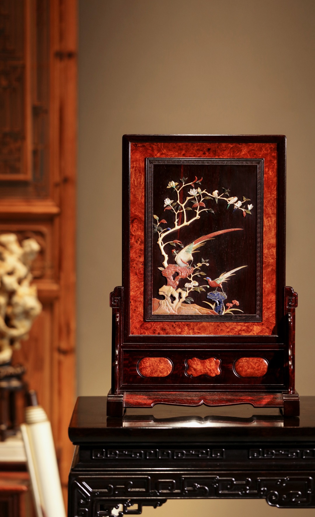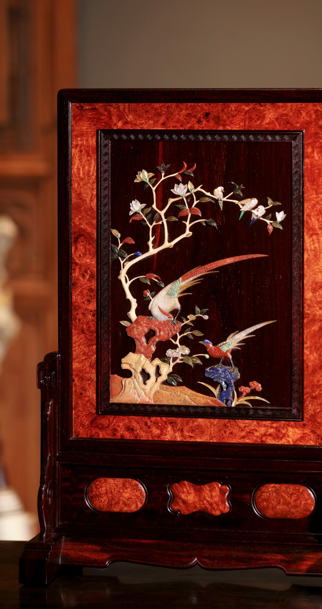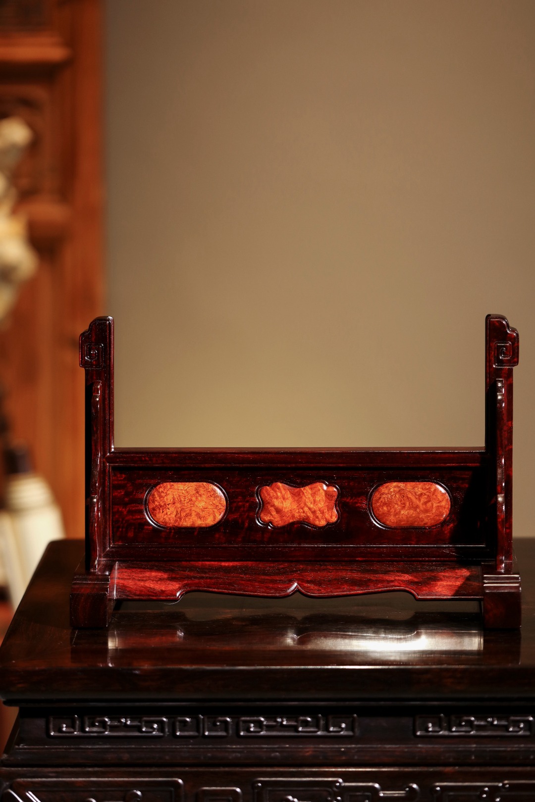 小叶紫檀攒框,镶缅花瘤疤独板。