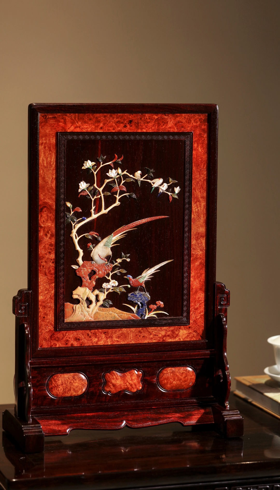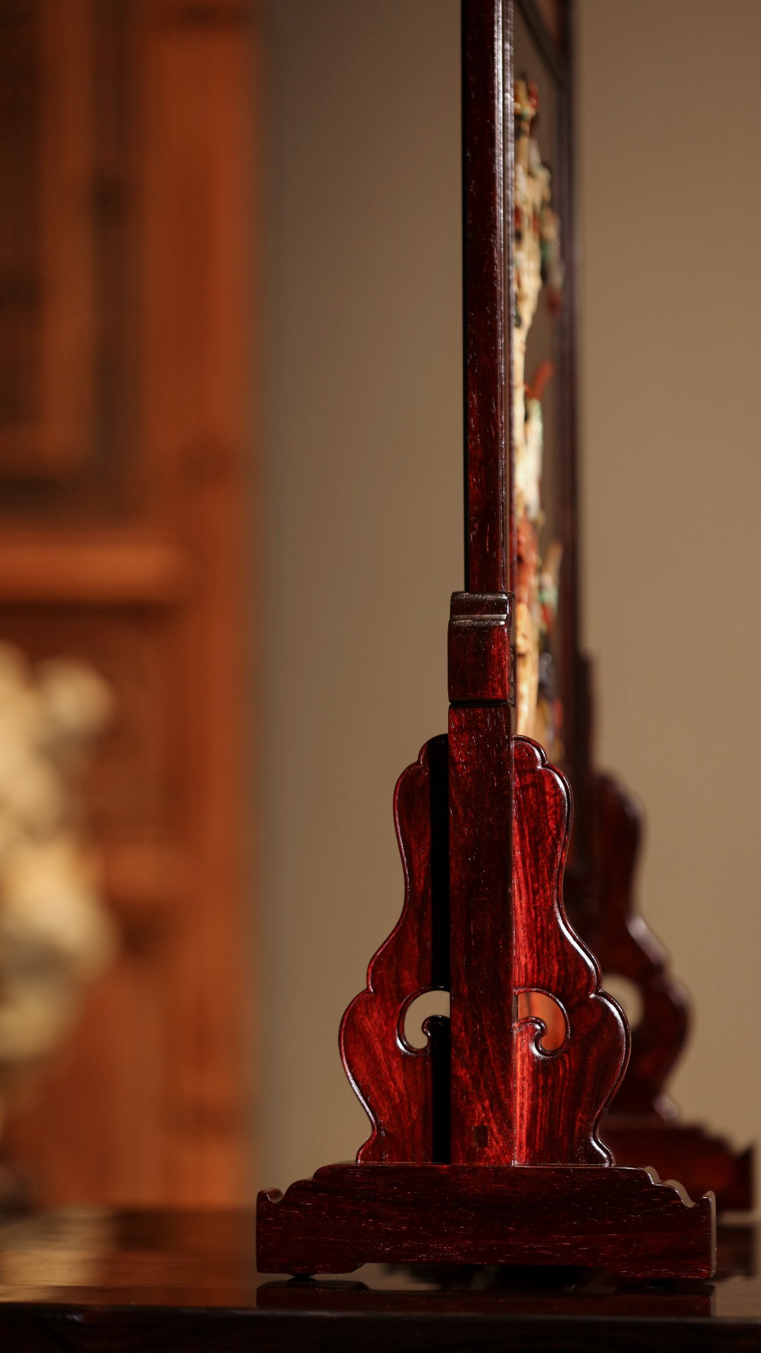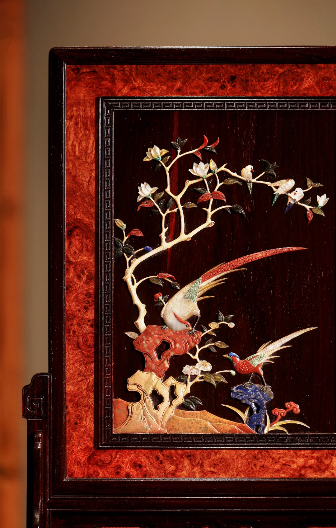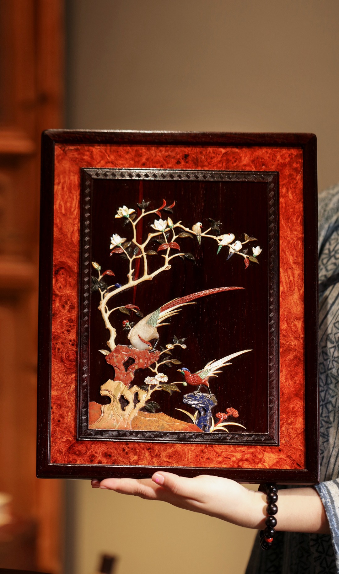 小叶紫檀攒框,镶缅花瘤疤独板。