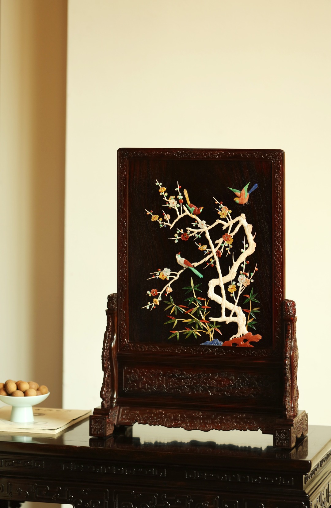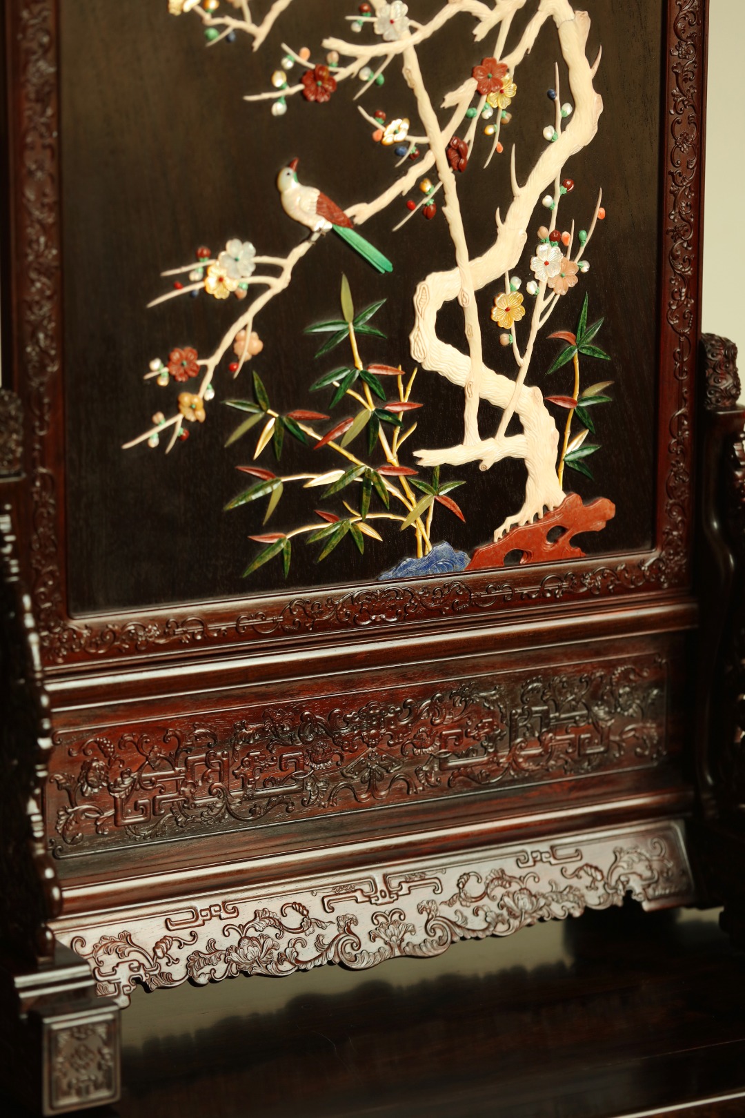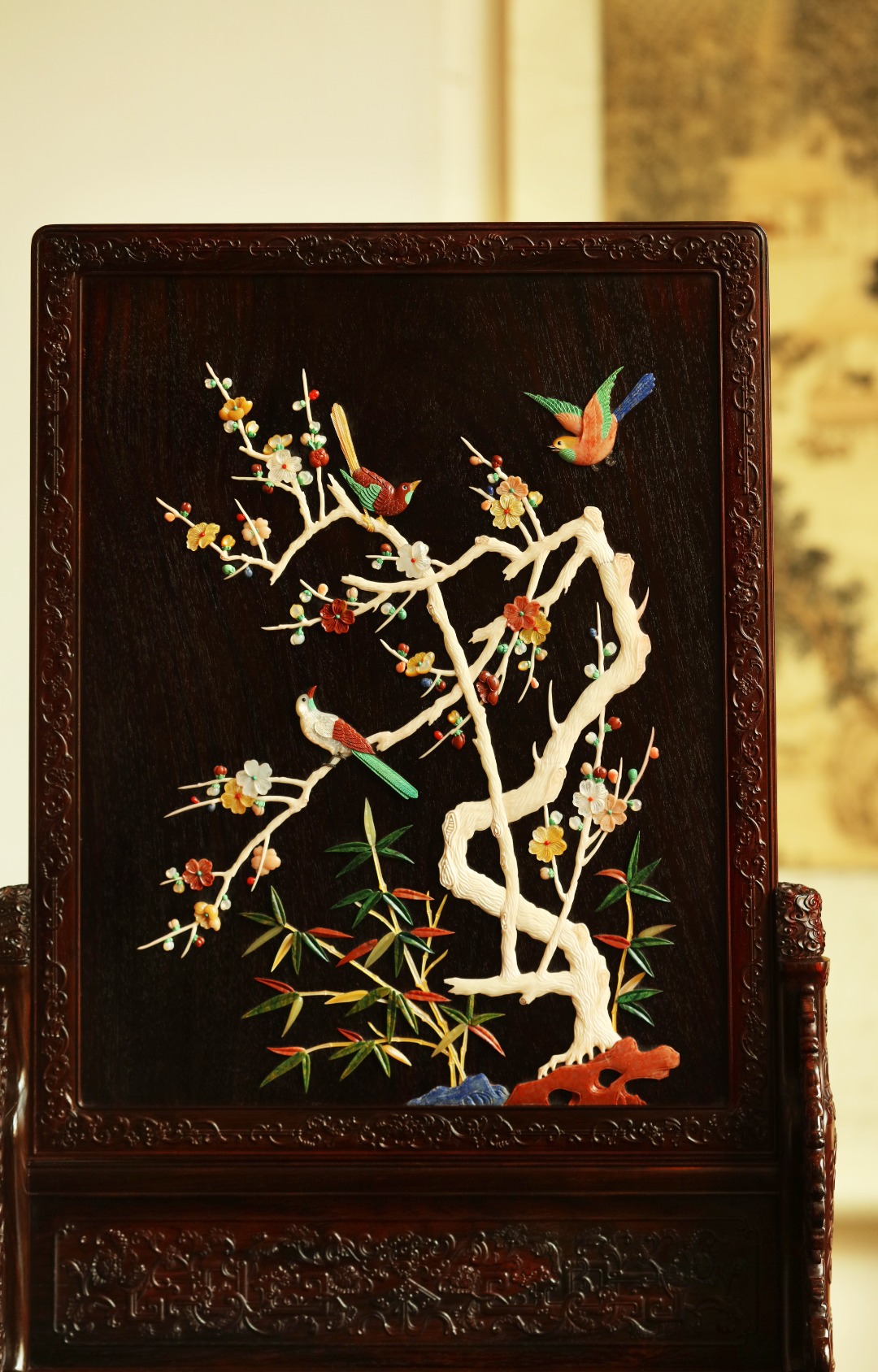 大红酸枝老料制,端庄古雅。满工雕刻纹饰,百宝嵌“花鸟图”,配色清雅,置案清赏,添祥和雅意,为案头造景佳选。
