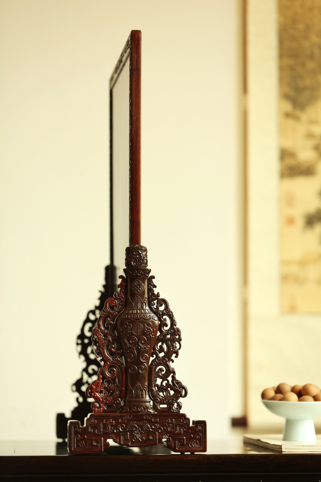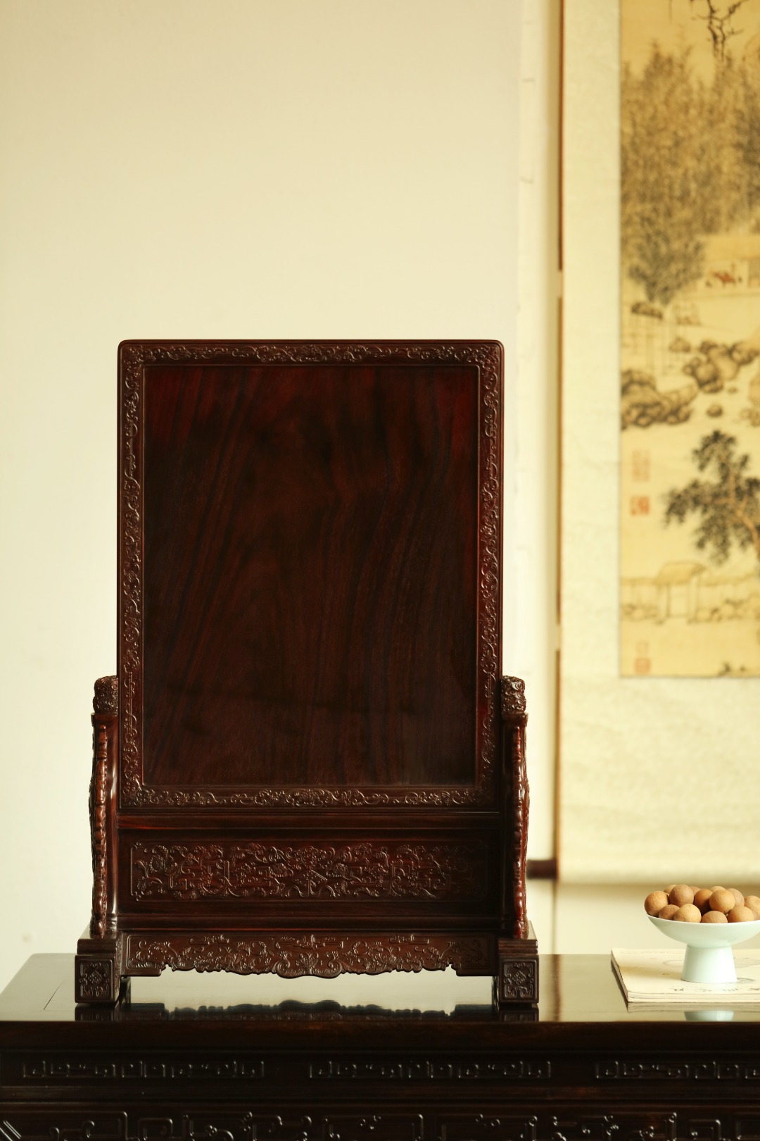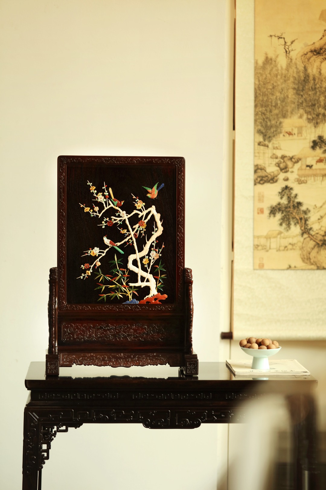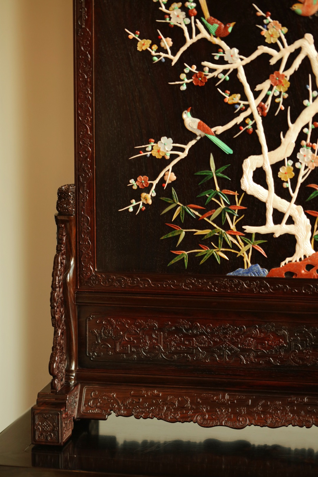 大红酸枝老料制,端庄古雅。满工雕刻纹饰,百宝嵌“花鸟图”,配色清雅,置案清赏,添祥和雅意,为案头造景佳选。