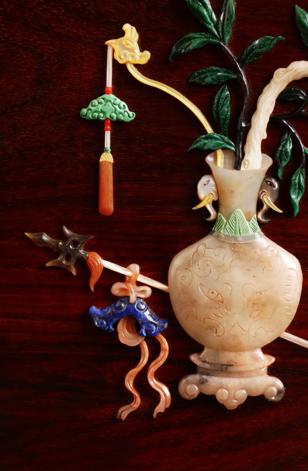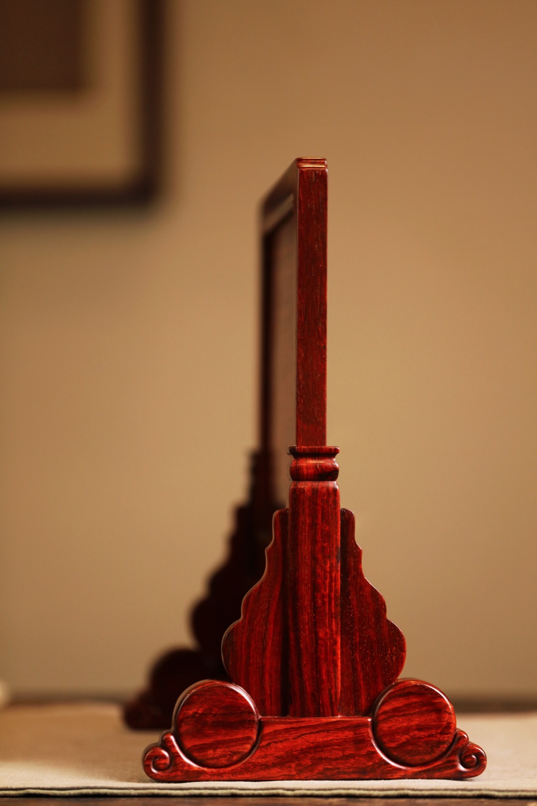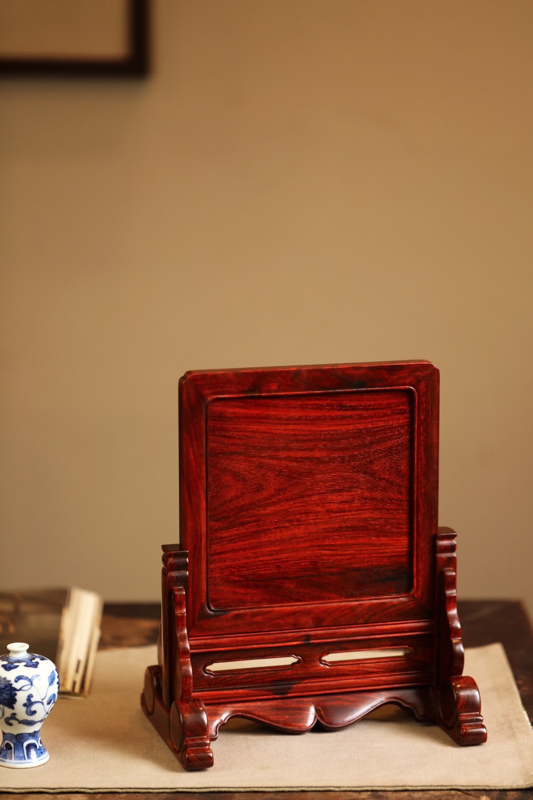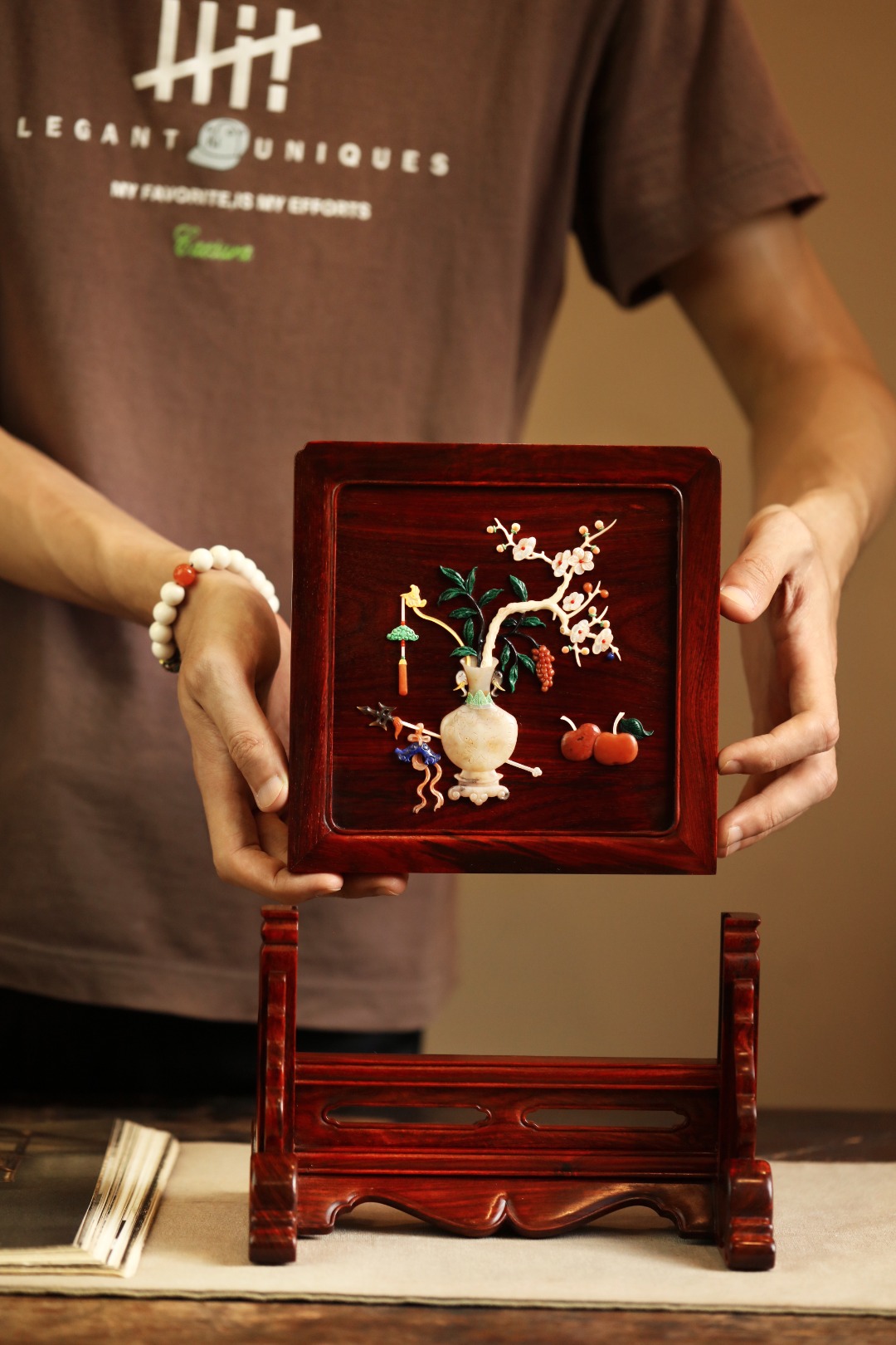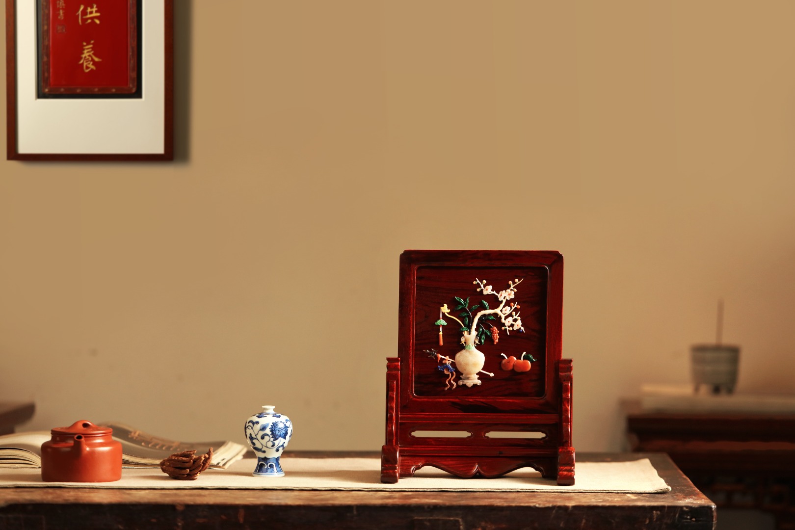 择取紫檀老料制,百宝嵌“清供图”,整器线条优美空灵,配色清雅,置案清赏,添祥和雅意。