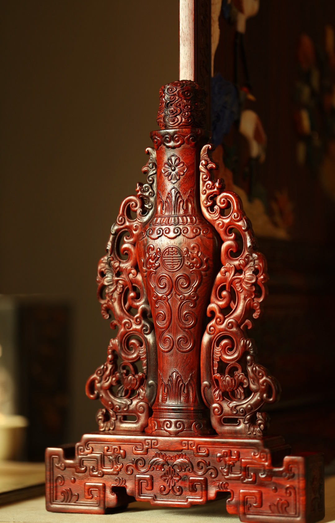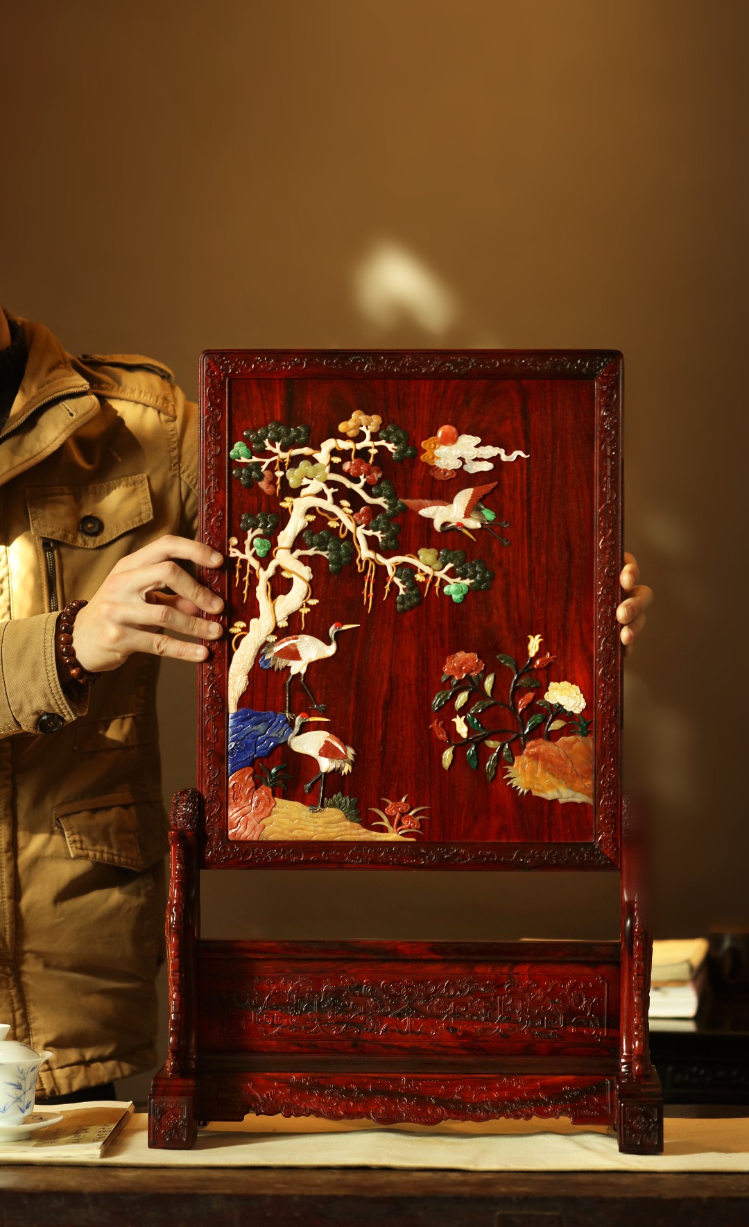 择取紫檀老料,做框于座,屏面嵌入百宝,松鹤延年图,配色清新通透,满工纹饰,雕工精细。颇有古韵,为陈设之佳器。