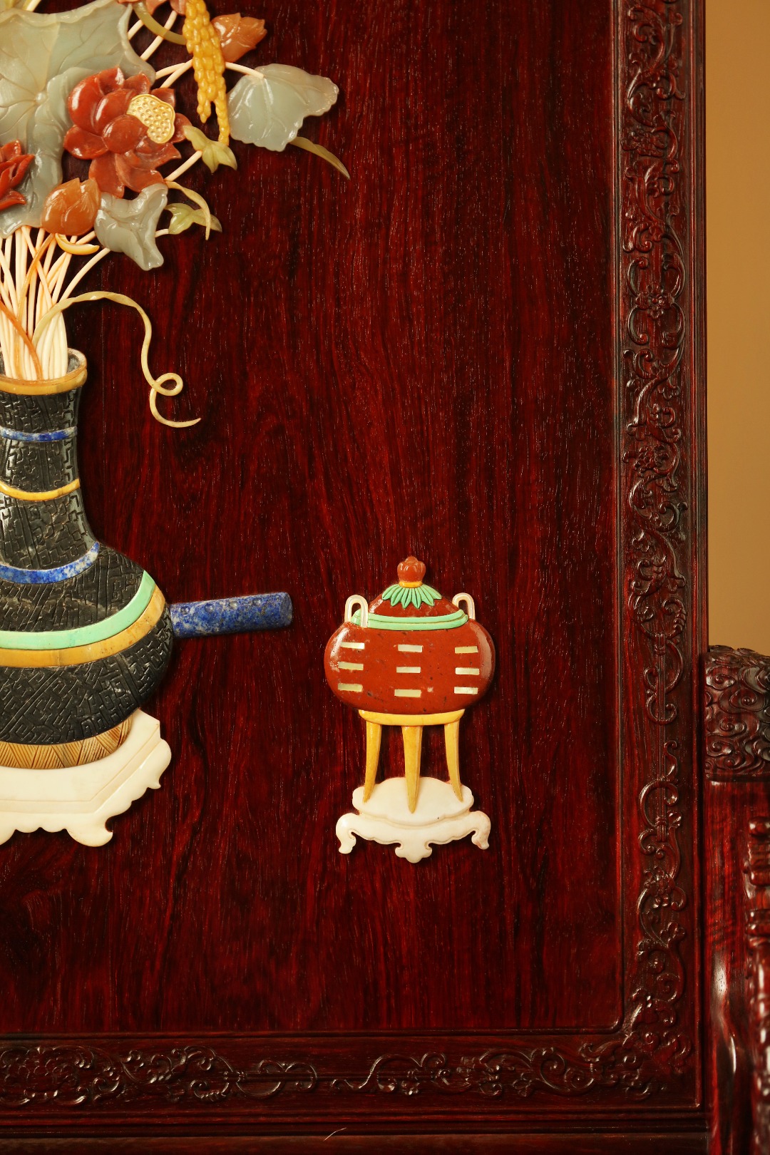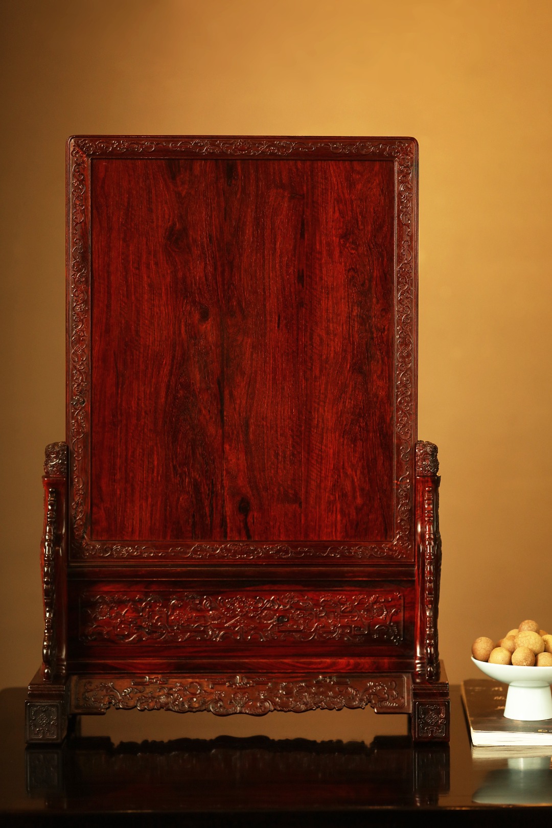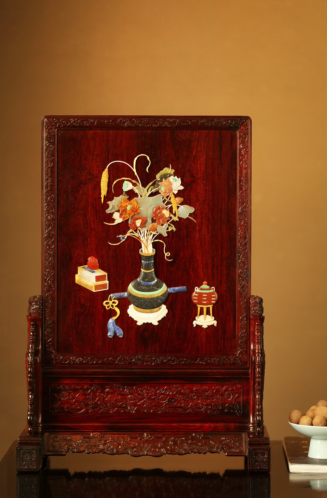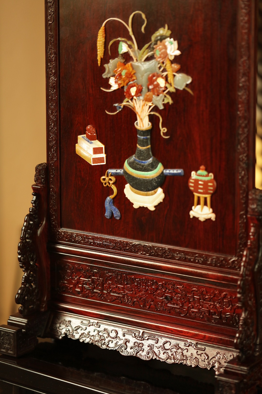 择取紫檀老料,做框于座,屏面嵌入百宝,清供博古图,配色清新通透,满工纹饰,雕工精细。颇有古韵,为陈设之佳器。