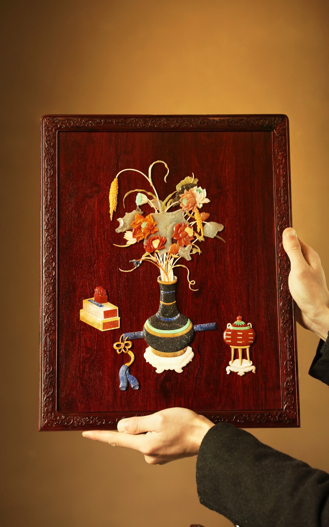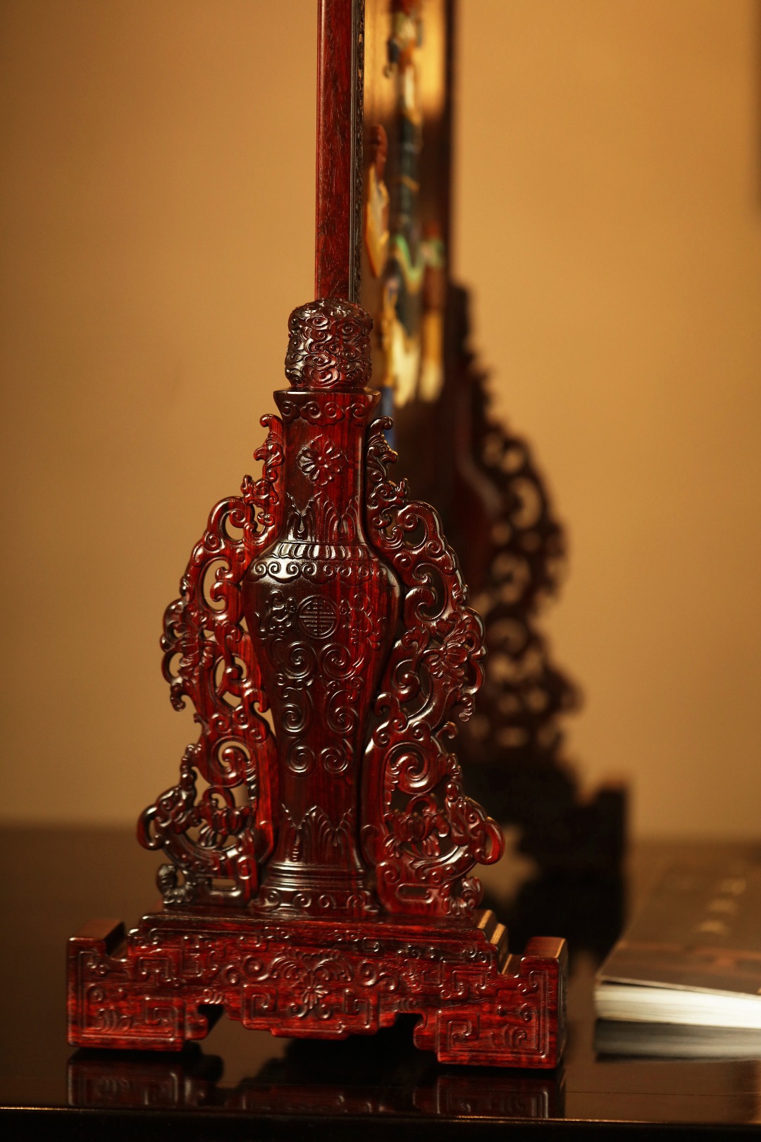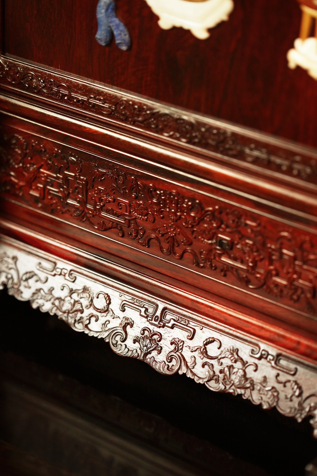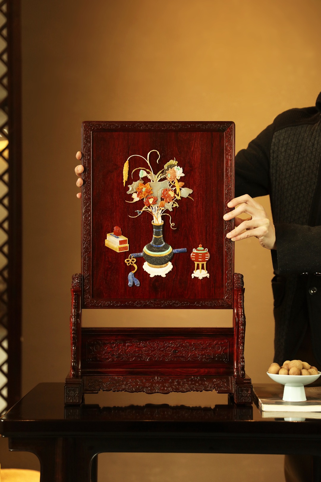 择取紫檀老料,做框于座,屏面嵌入百宝,清供博古图,配色清新通透,满工纹饰,雕工精细。颇有古韵,为陈设之佳器。