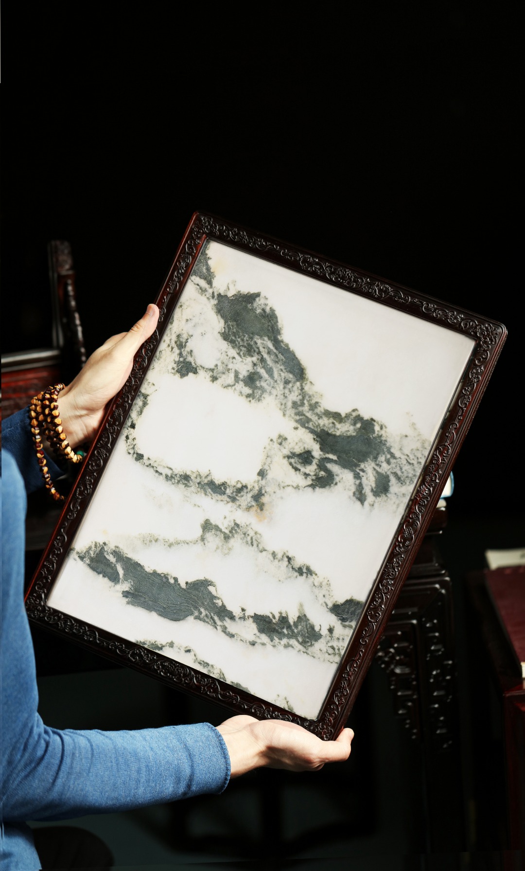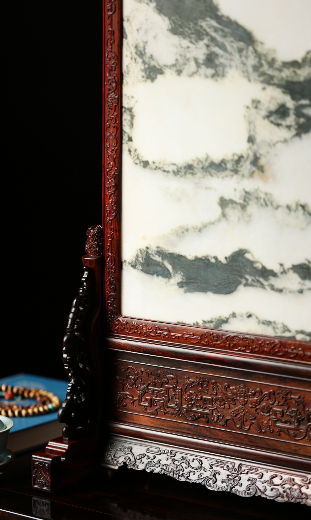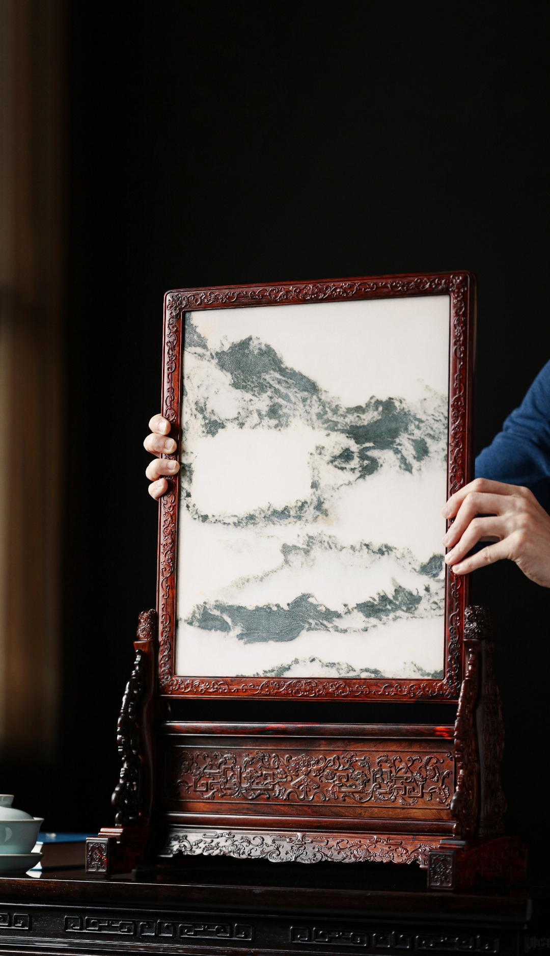 大红酸枝攒框,满工浮雕纹样,屏心为云石,天工造化,云山气势磅礴,此屏高古脱俗,画面动静相生,别有一番意趣。寓意祥瑞,值得收藏。