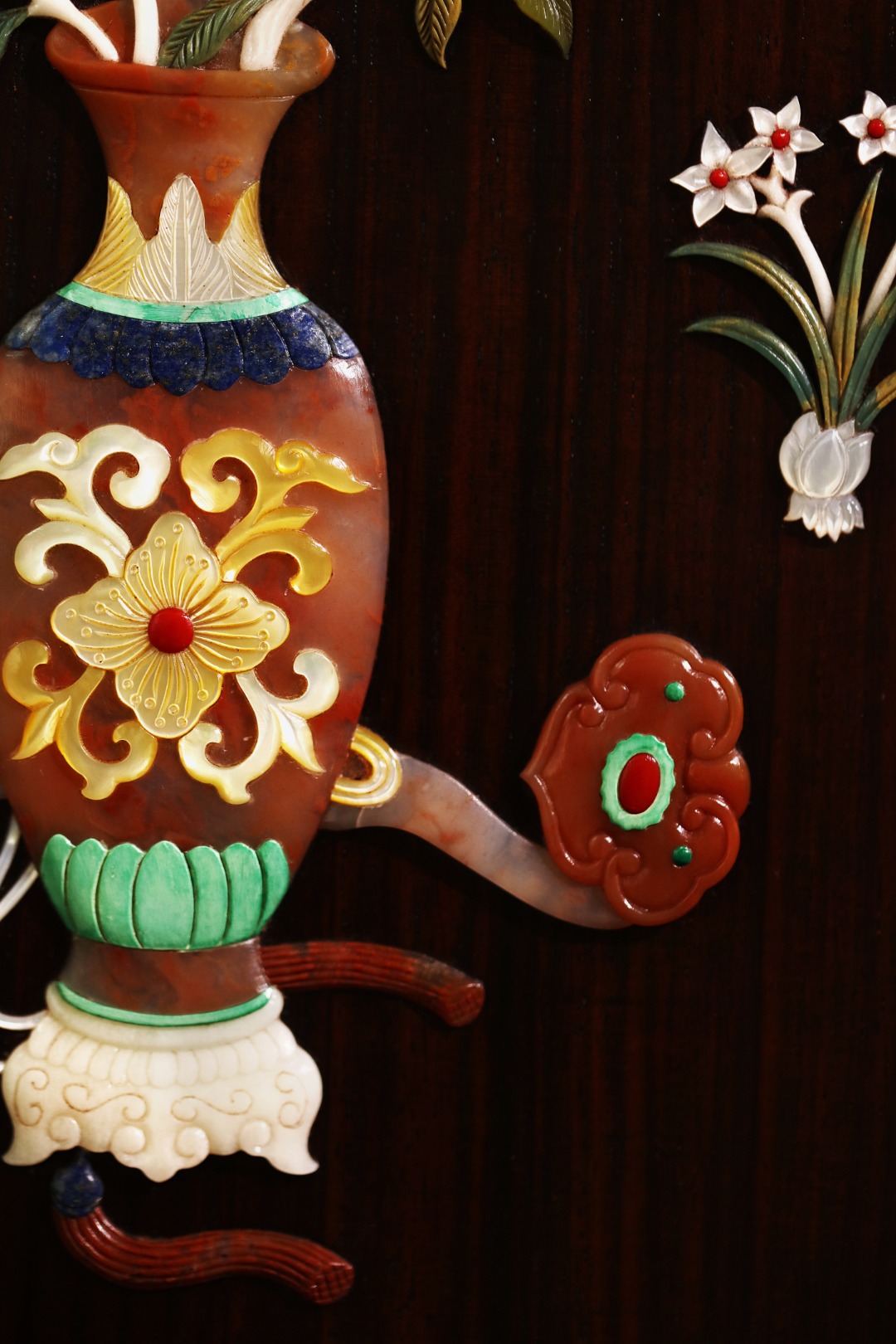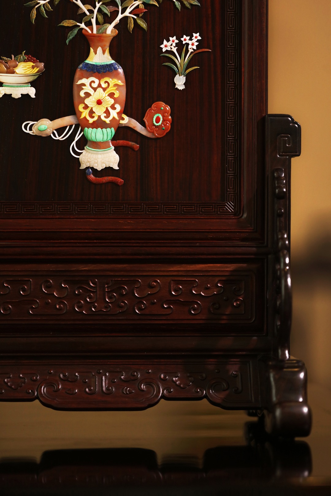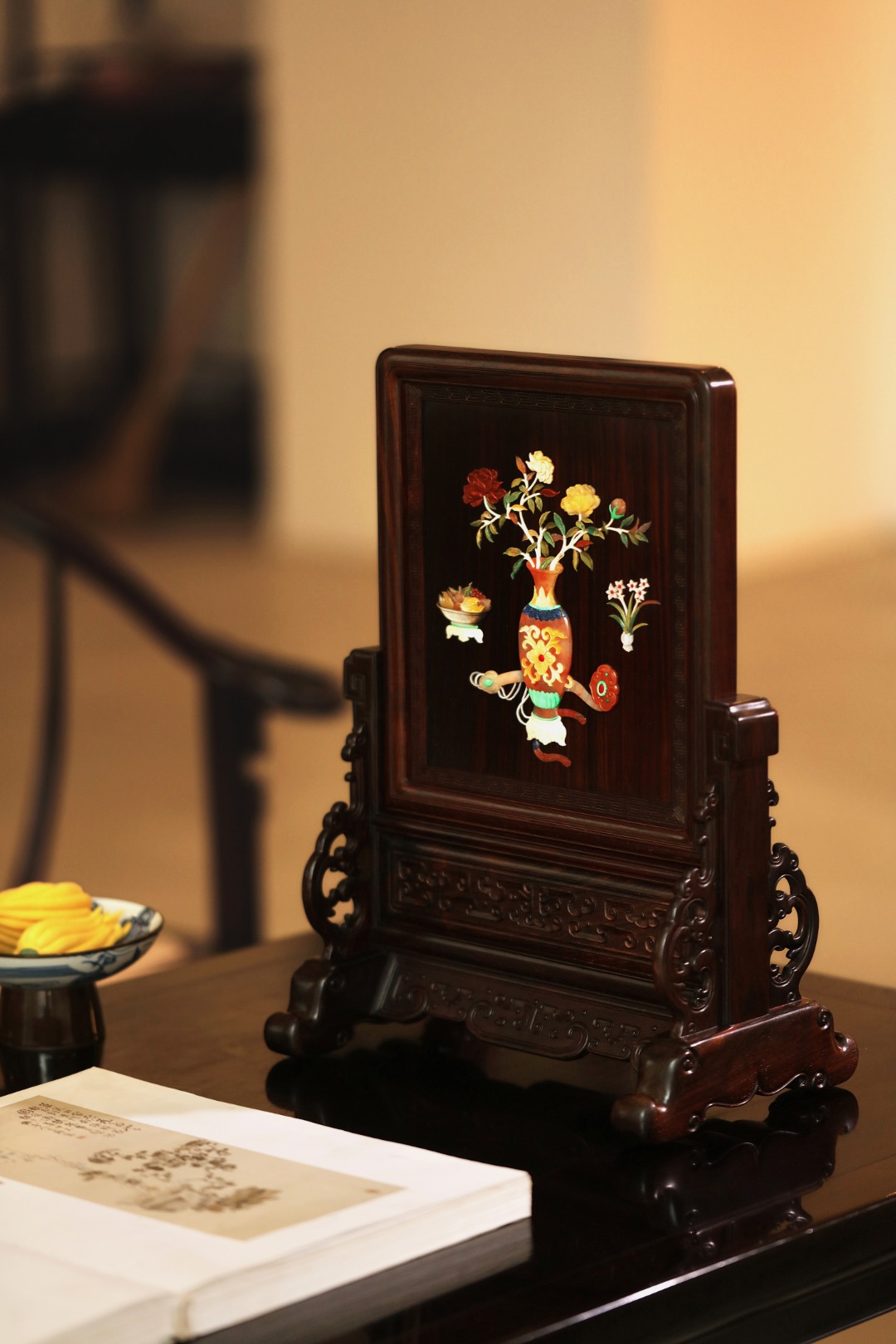 酸枝镶嵌百宝嵌博古图,屏座浮雕纹饰立体饱满,整器端庄古雅,置案清赏,添祥和雅意。