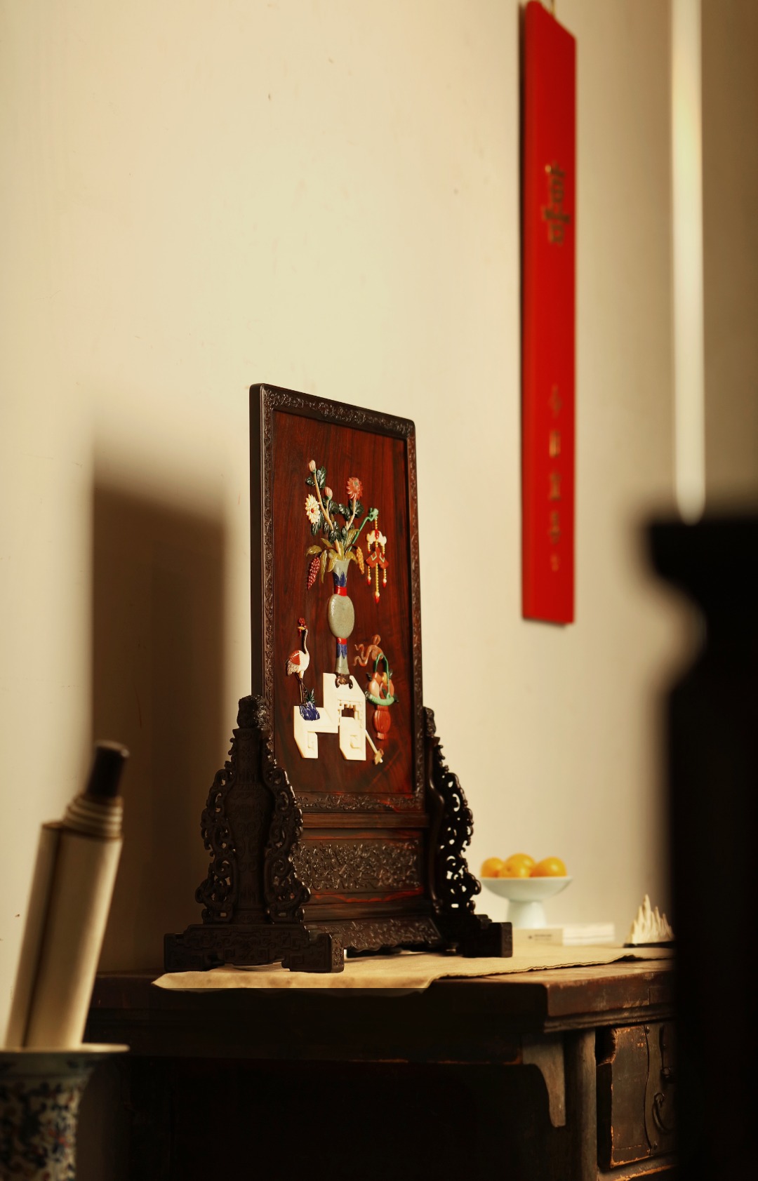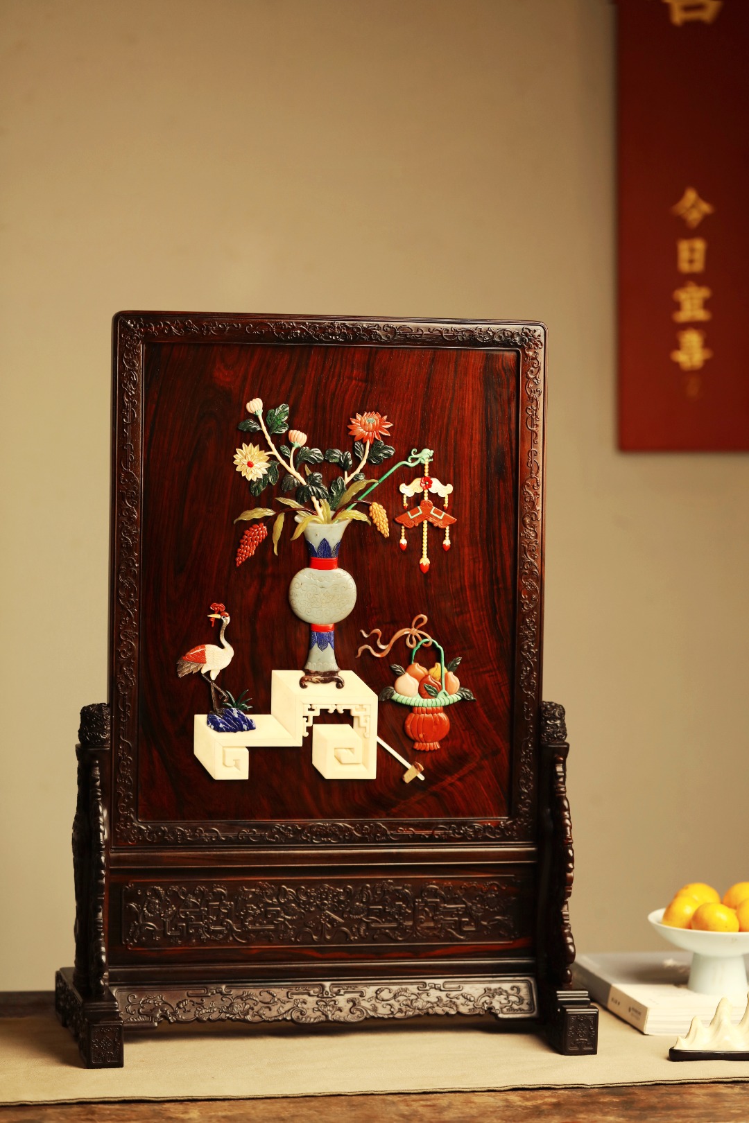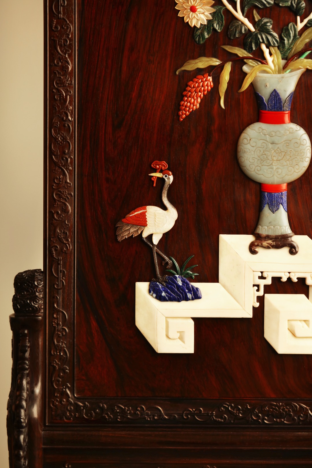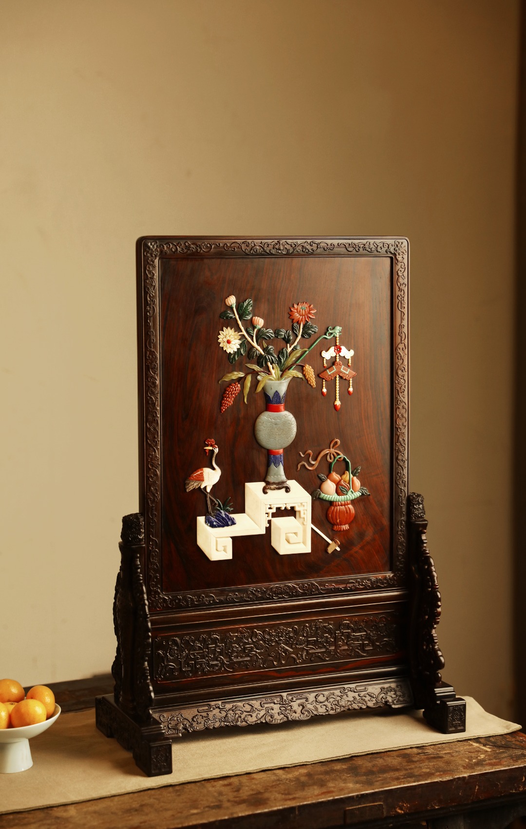 大红酸枝满水波老料,全独板制,满工雕刻纹饰,屏心宫廷百宝镶嵌博古图,琢刻精细入微,构图清和。此屏置厅堂案头,富贵典雅、妙不可言。