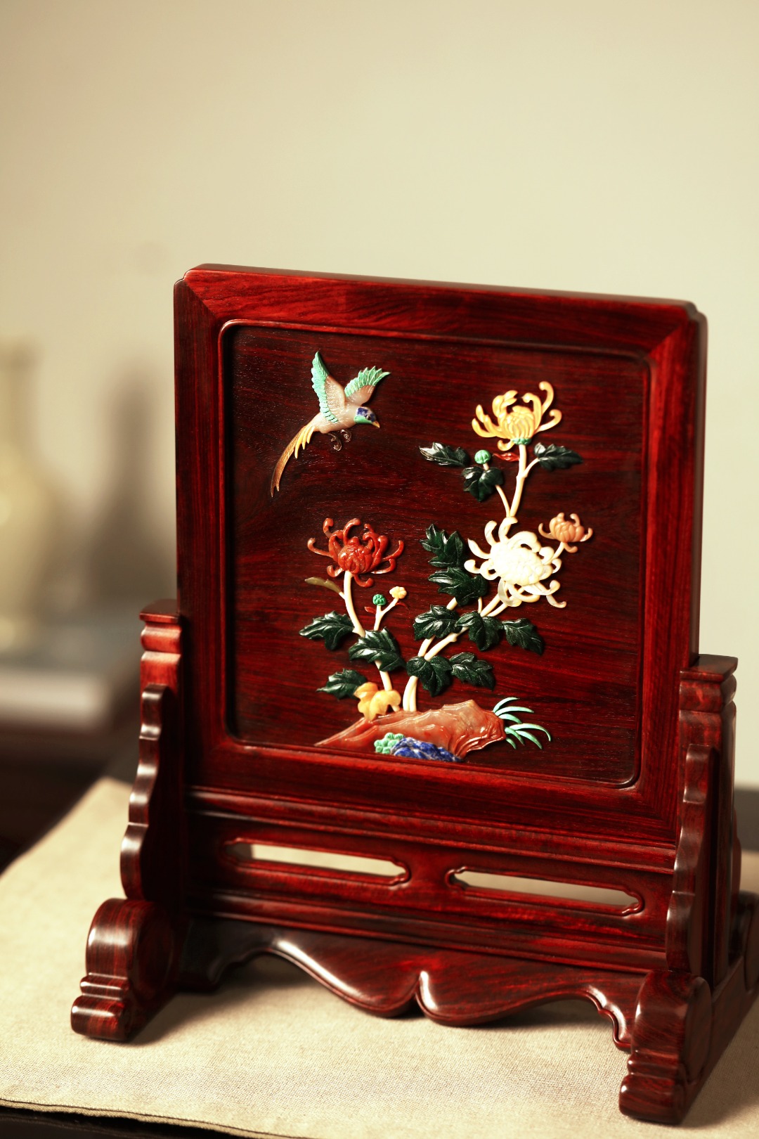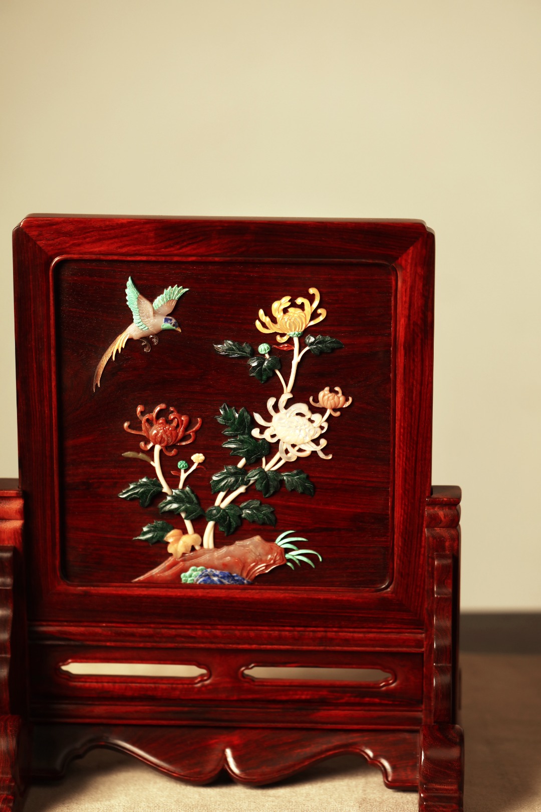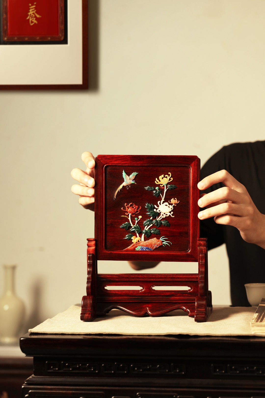 择取紫檀老料制,百宝嵌“花鸟图”,整器线条优美空灵,配色清雅,置案清赏,添祥和雅意。