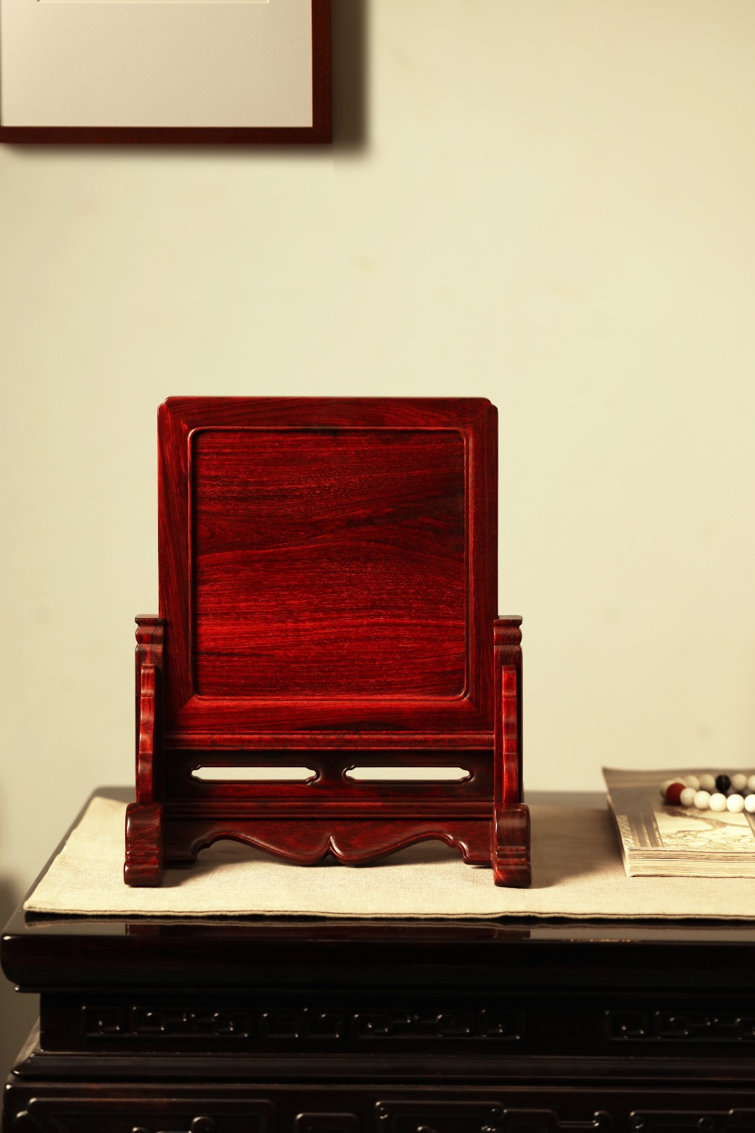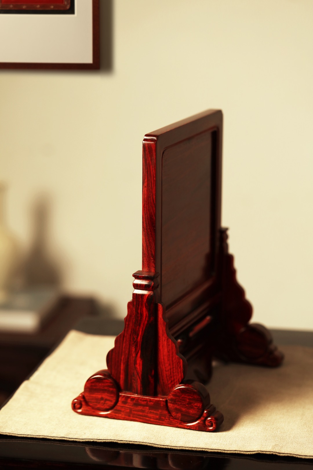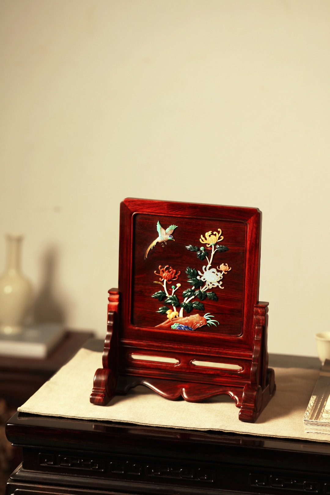 择取紫檀老料制,百宝嵌“花鸟图”,整器线条优美空灵,配色清雅,置案清赏,添祥和雅意。