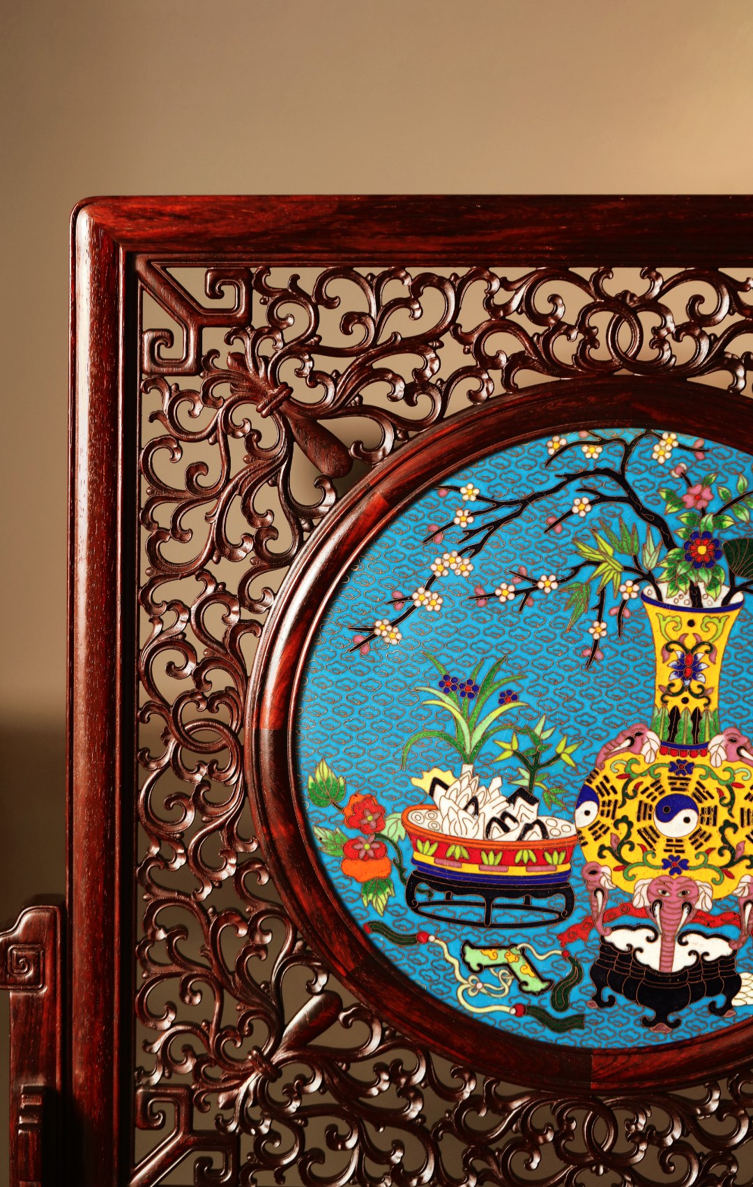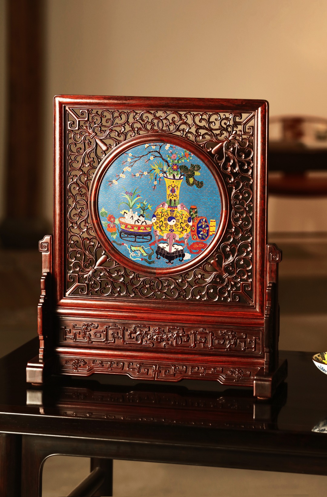 屏框透雕缠枝莲纹,屏心景泰蓝饰清供图,屏座雕福寿纹,