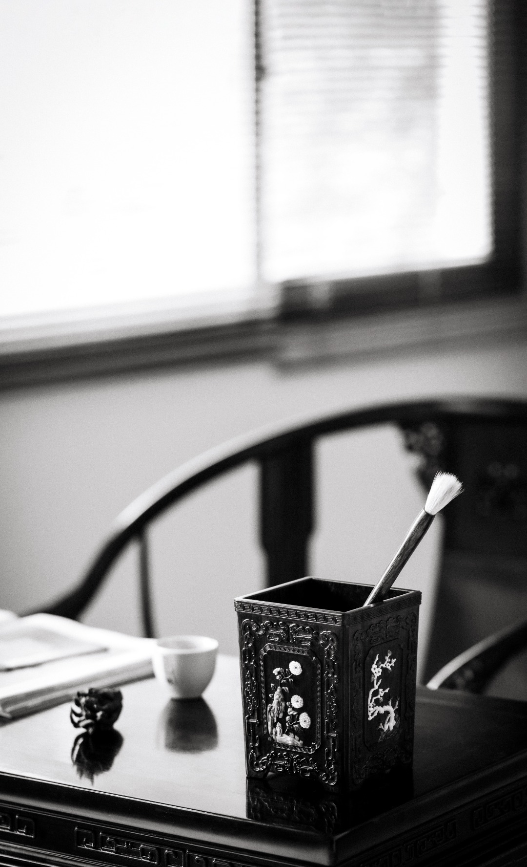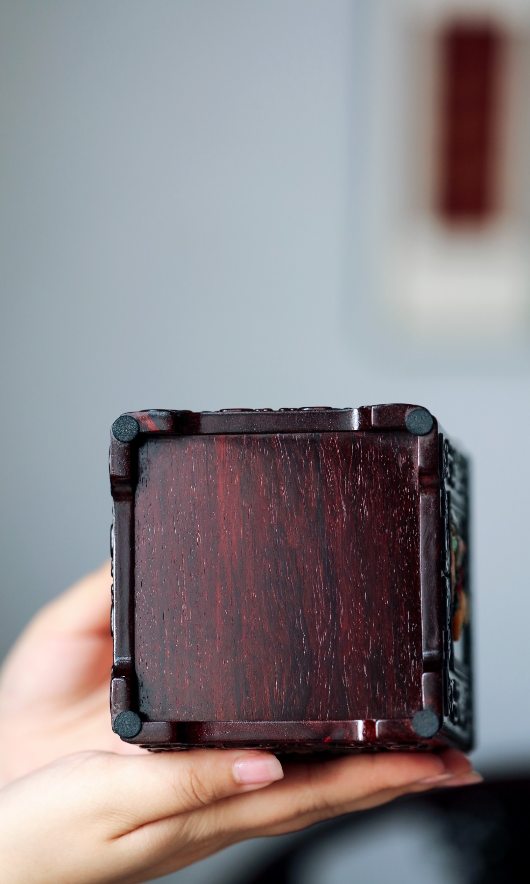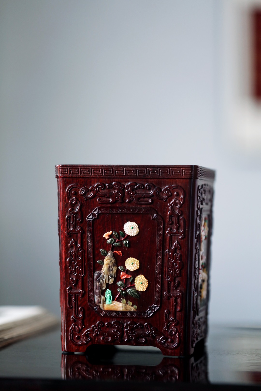臻选高油性老料,满工浮雕拐子龙纹,制作细致讲究,起线通达流畅,百宝镶嵌戗梅兰竹菊,各具风姿,满含书卷气。