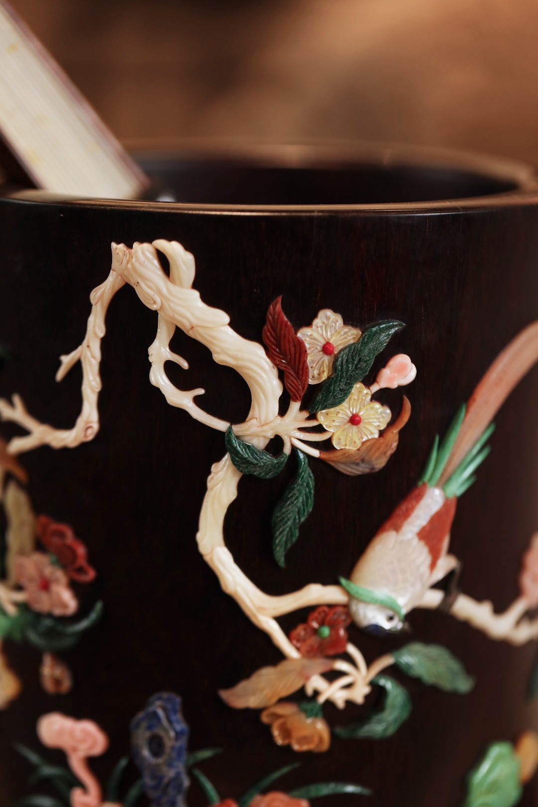 筒壁施以宫廷百宝镶嵌花鸟图,