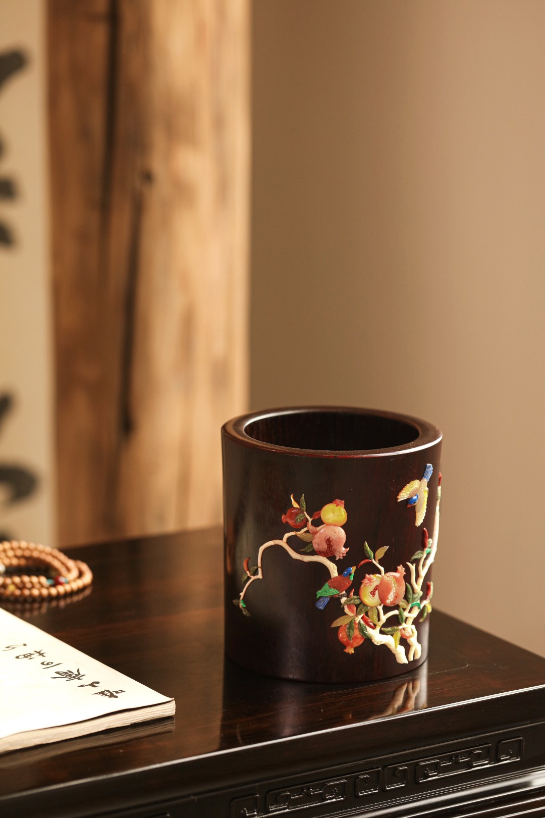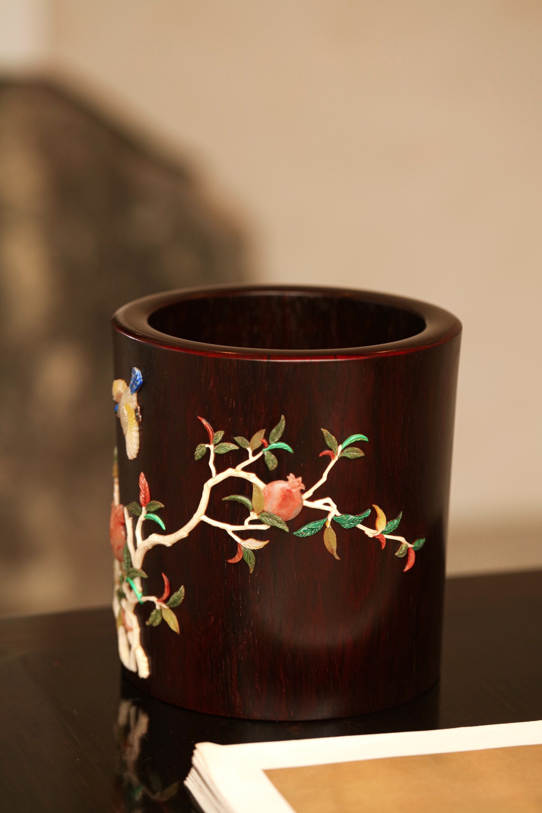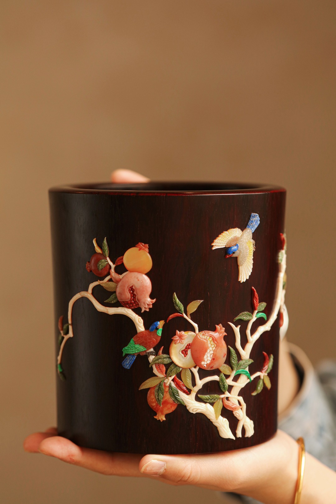 紫檀高油密一木挖制,料质温润,筒身百宝镶嵌,石榴枝上喜鹊嬉戏,寓意双喜多福、可添文房画意,赏心悦目。