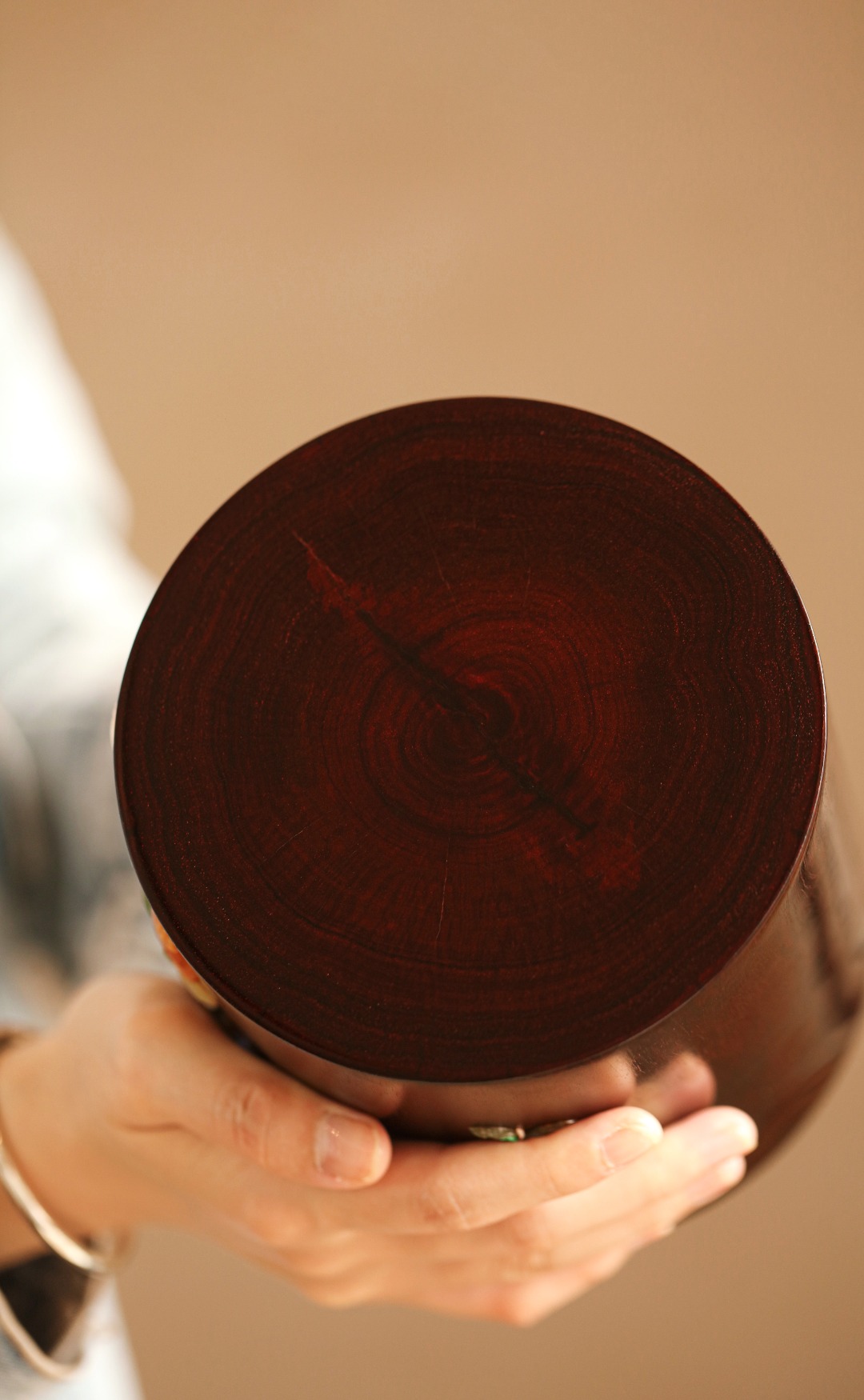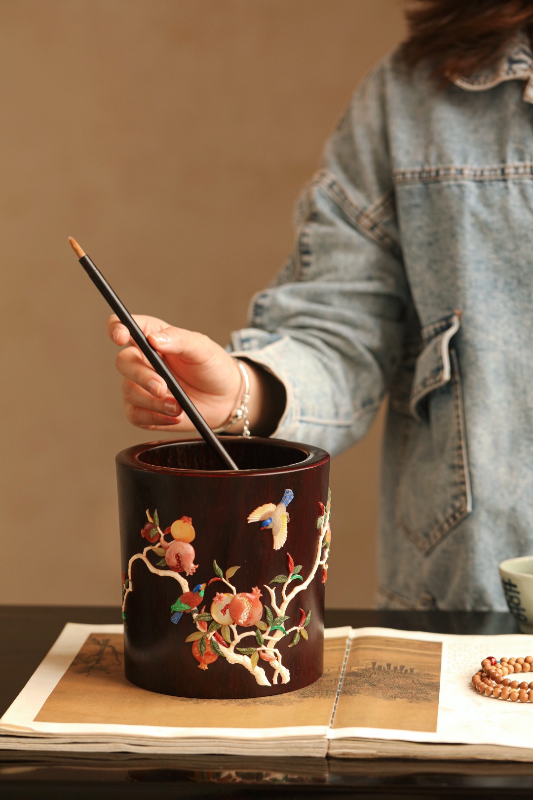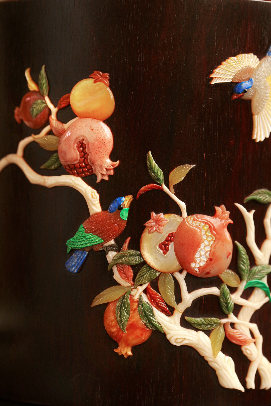 紫檀高油密一木挖制,料质温润,筒身百宝镶嵌,石榴枝上喜鹊嬉戏,寓意双喜多福、可添文房画意,赏心悦目。