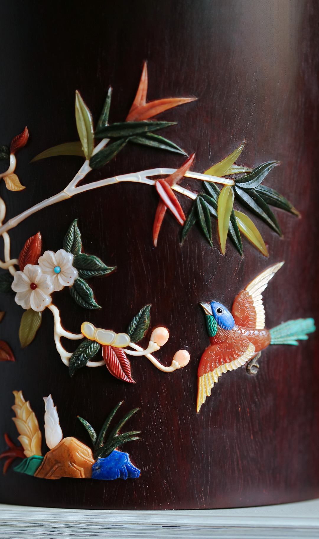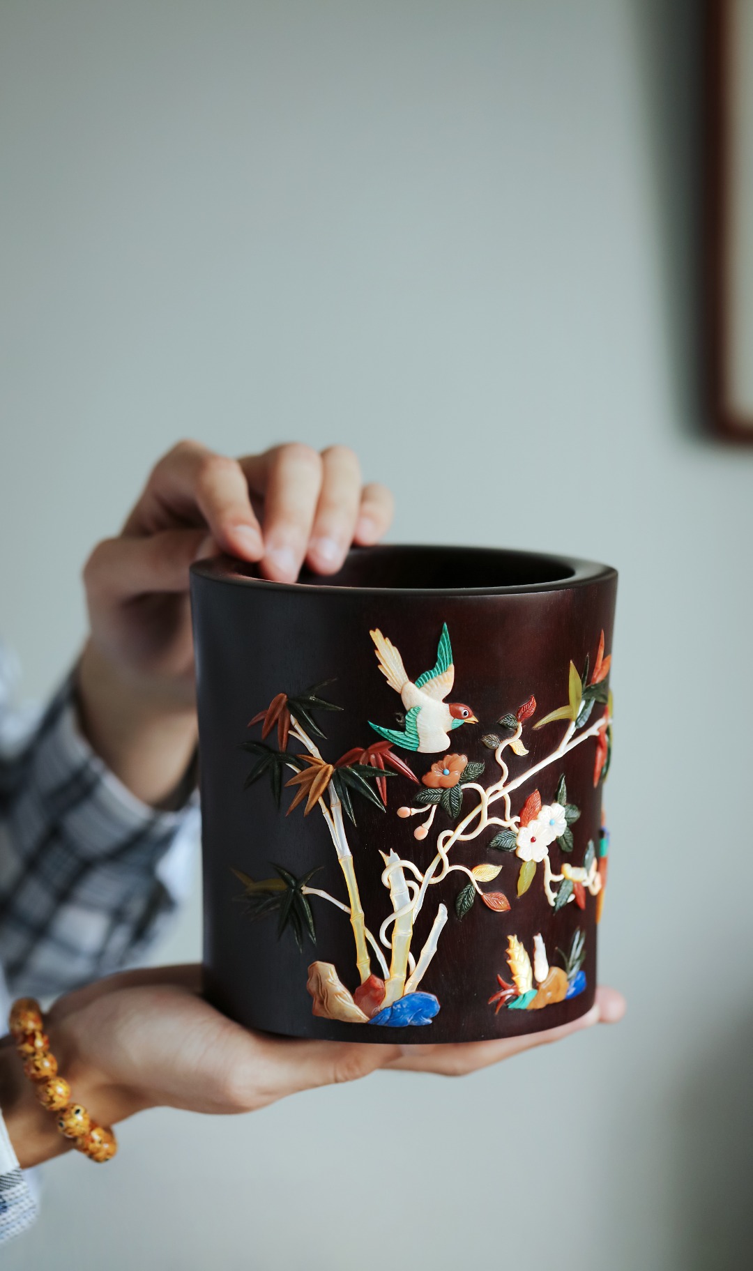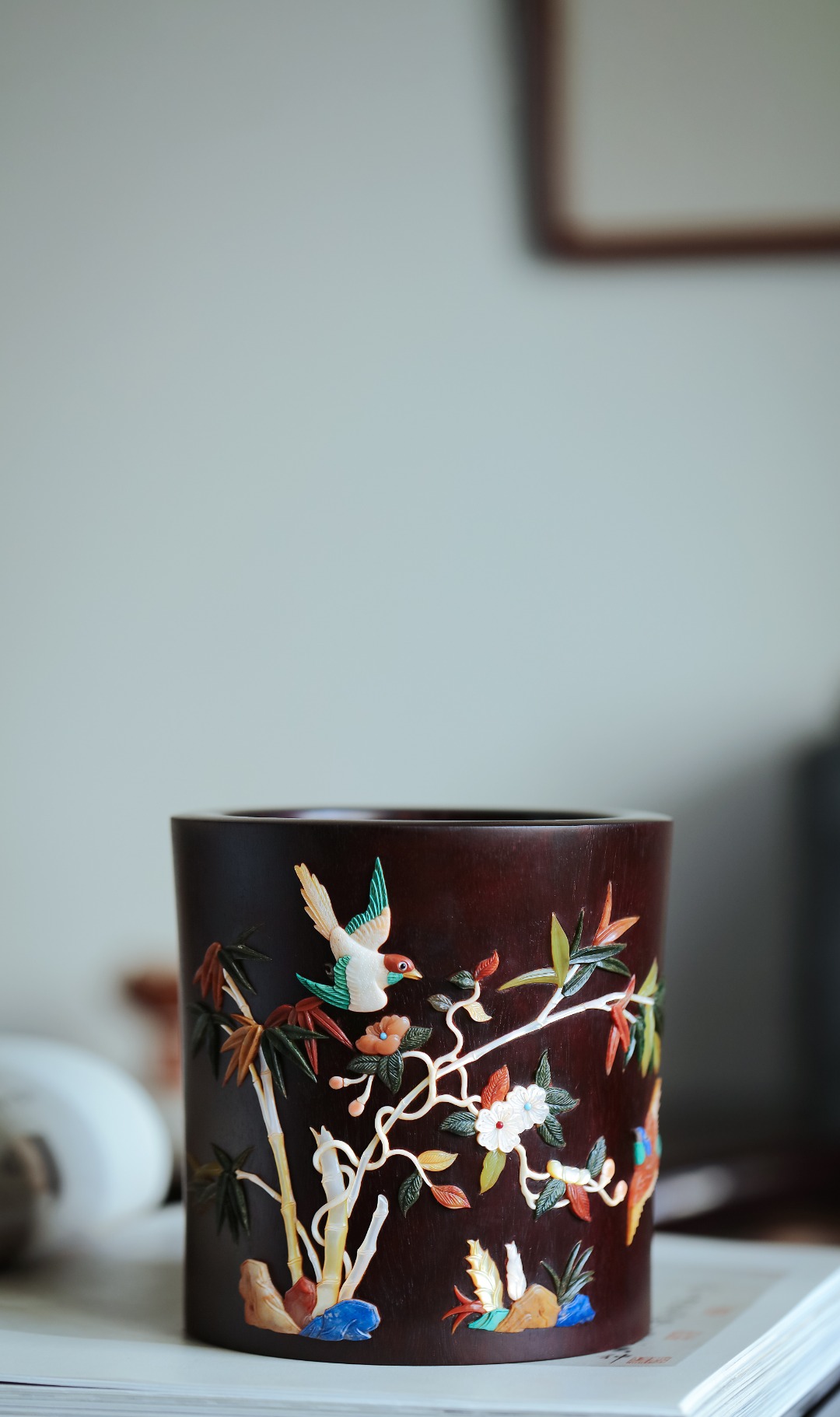 筒壁百宝嵌画,画面清新有致;