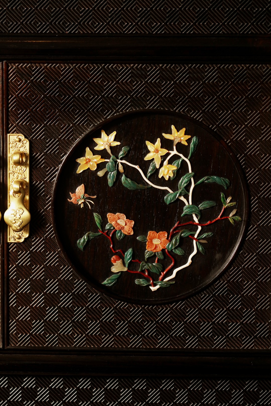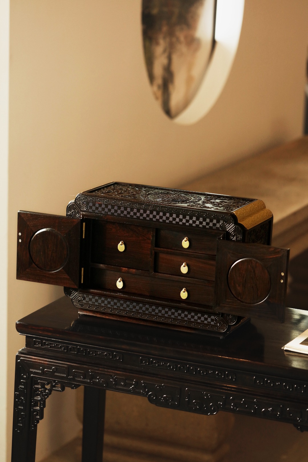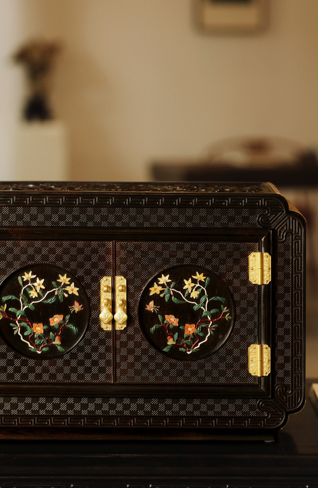 择紫光檀制, 色泽均匀纯正,满工精雕,铜件镀金,柜门百宝嵌蝶恋花图,配色清雅,整体画面浑然一体,严丝合。内设多层收纳,可藏珠宝珍玩,藏用皆宜。