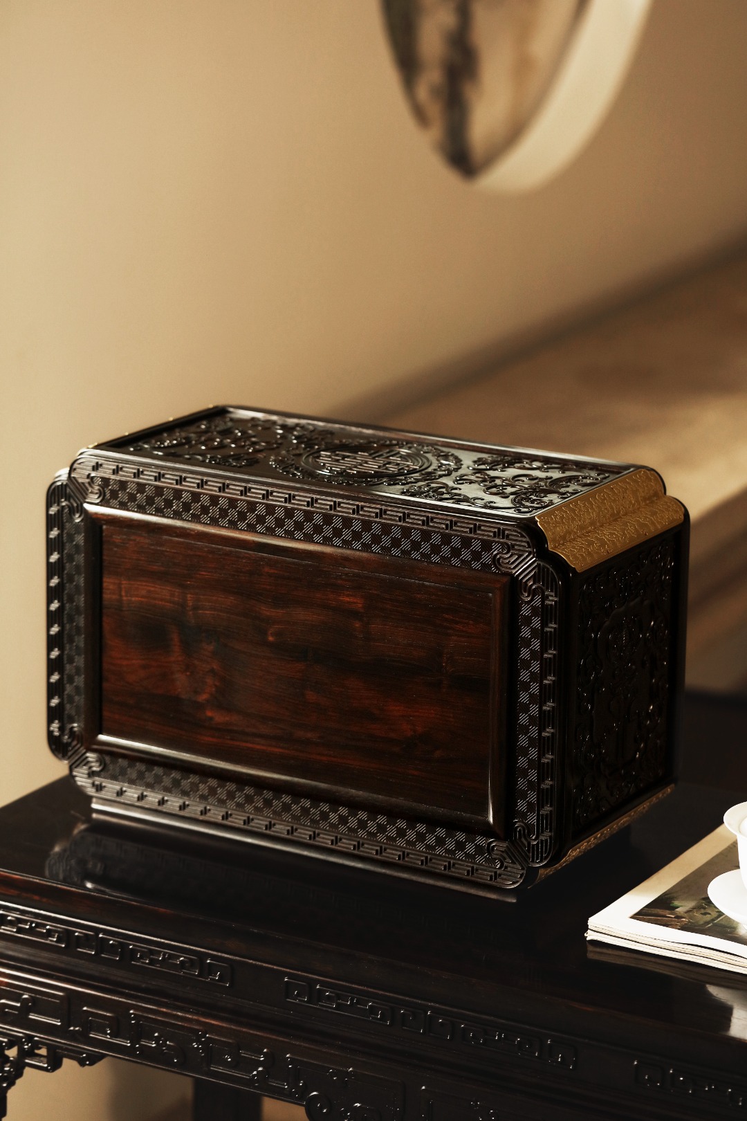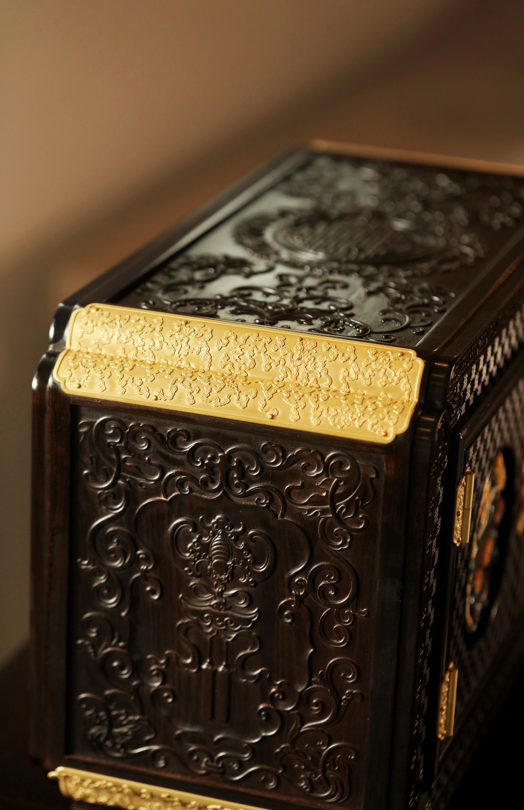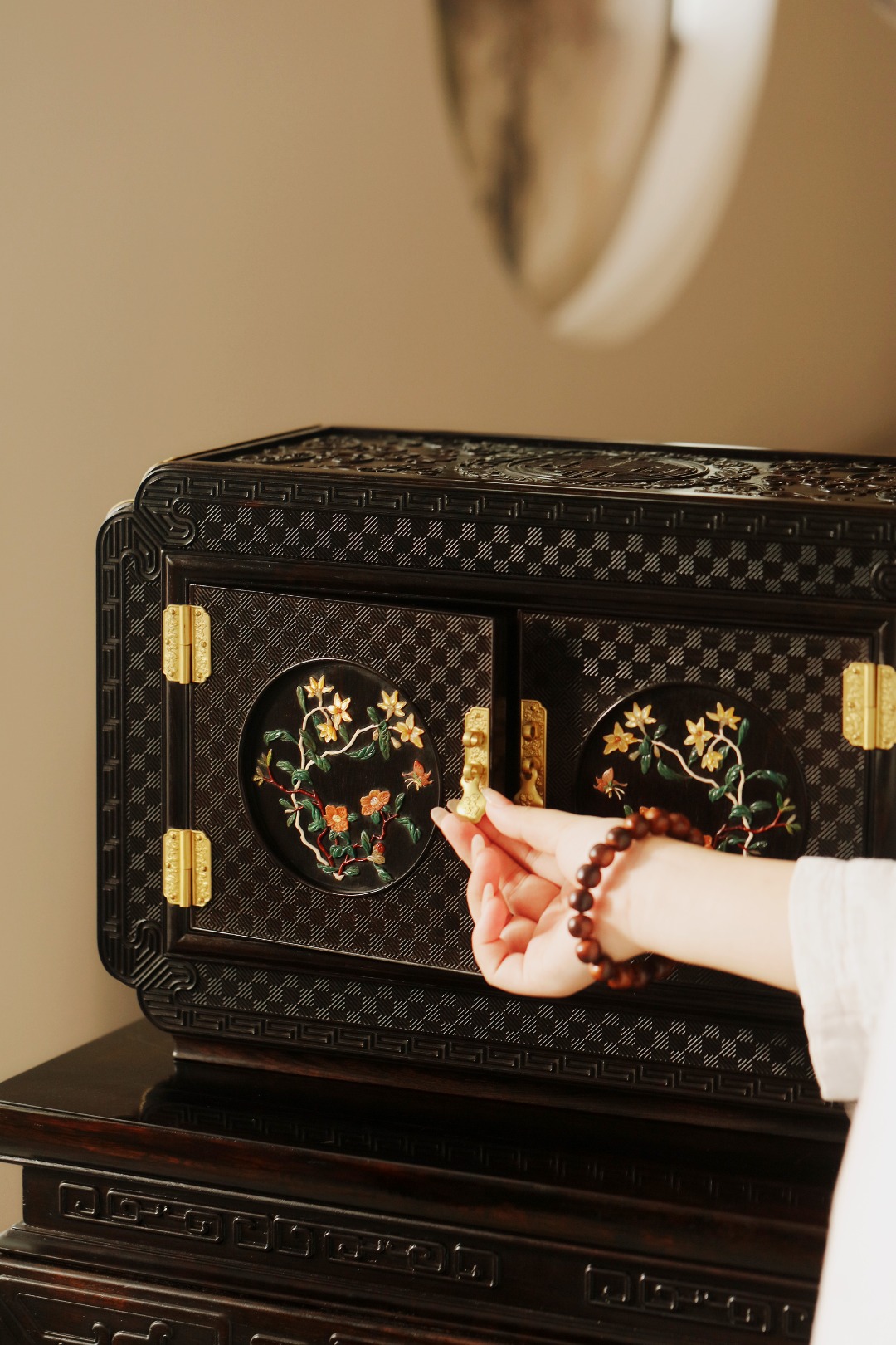 择紫光檀制, 色泽均匀纯正,满工精雕,铜件镀金,柜门百宝嵌蝶恋花图,配色清雅,整体画面浑然一体,严丝合。内设多层收纳,可藏珠宝珍玩,藏用皆宜。