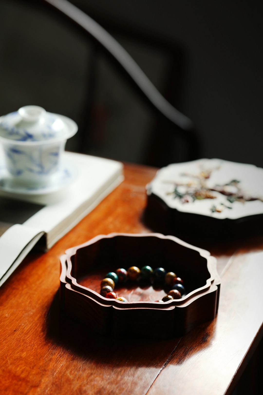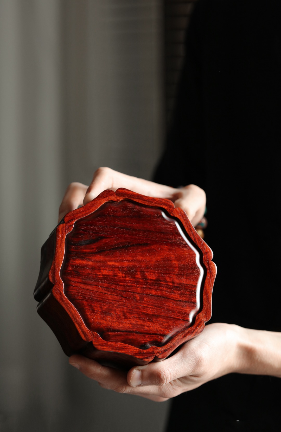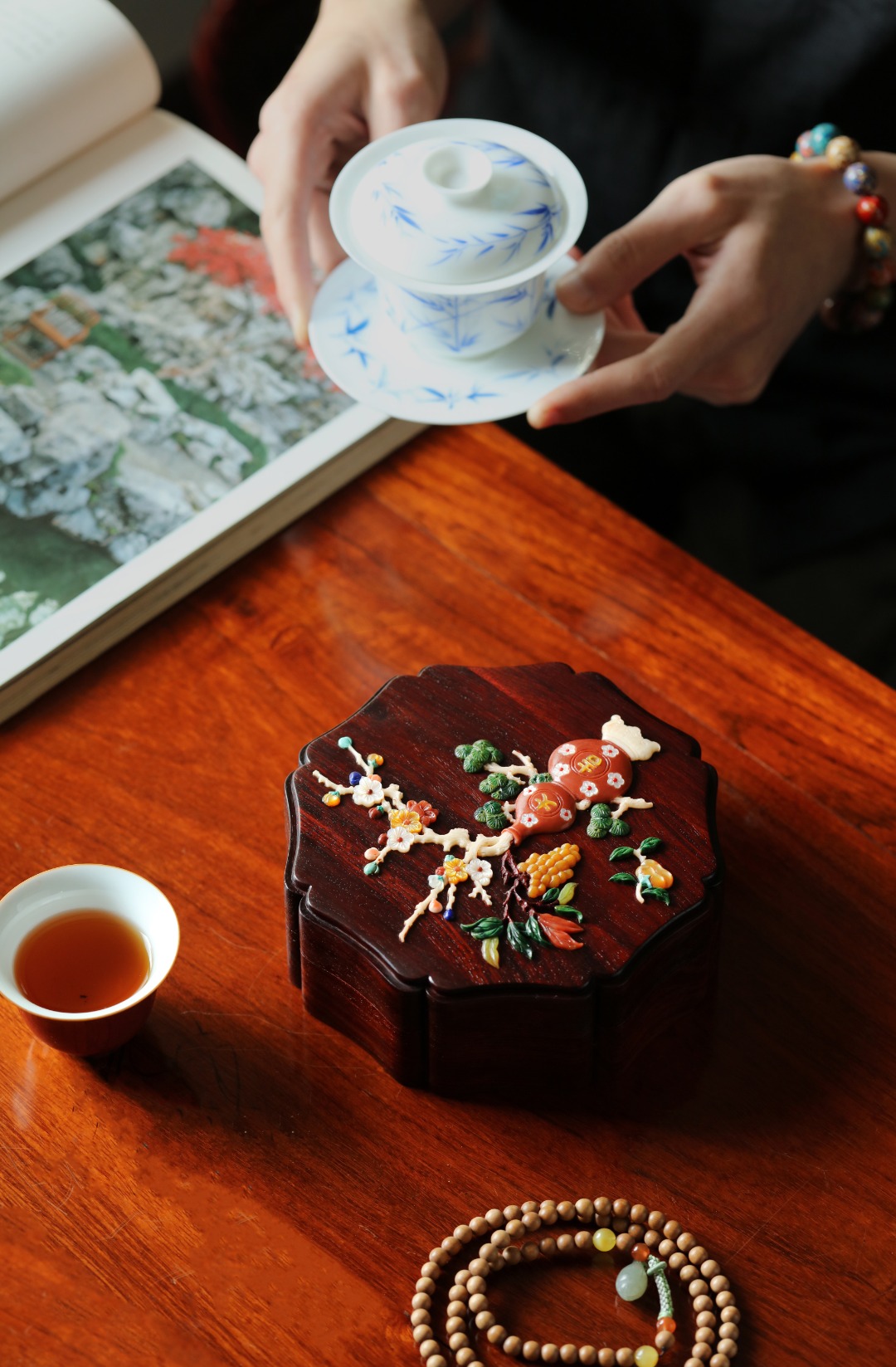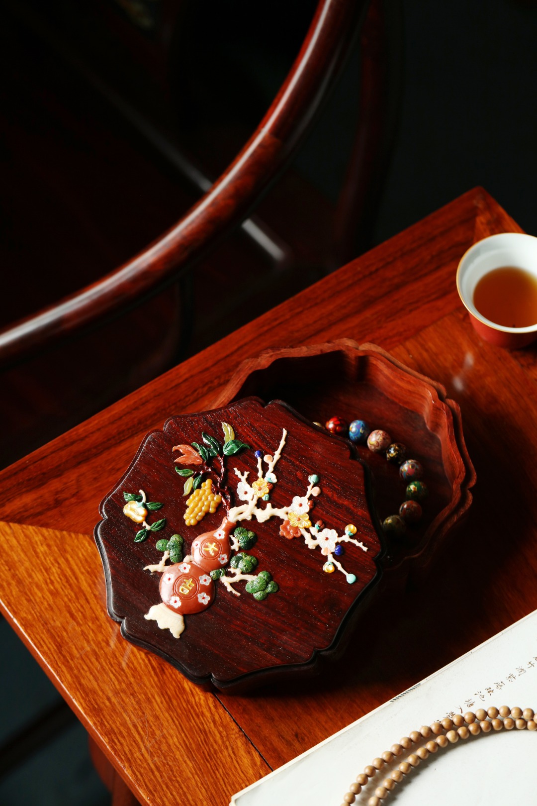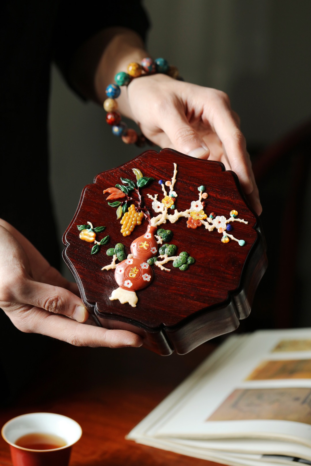 紫檀老料制,榫卯精工,细节考究,盖面百宝镶嵌清供图,配色清雅,存纳章石珠玉,精美古雅。
