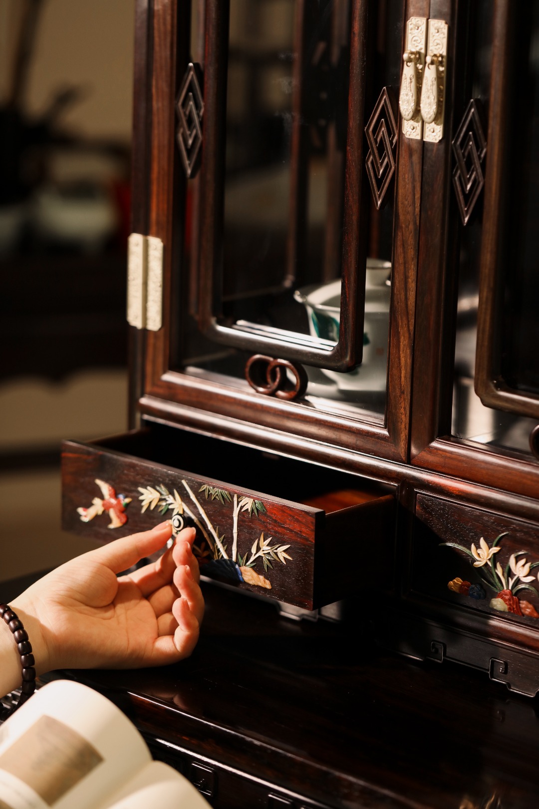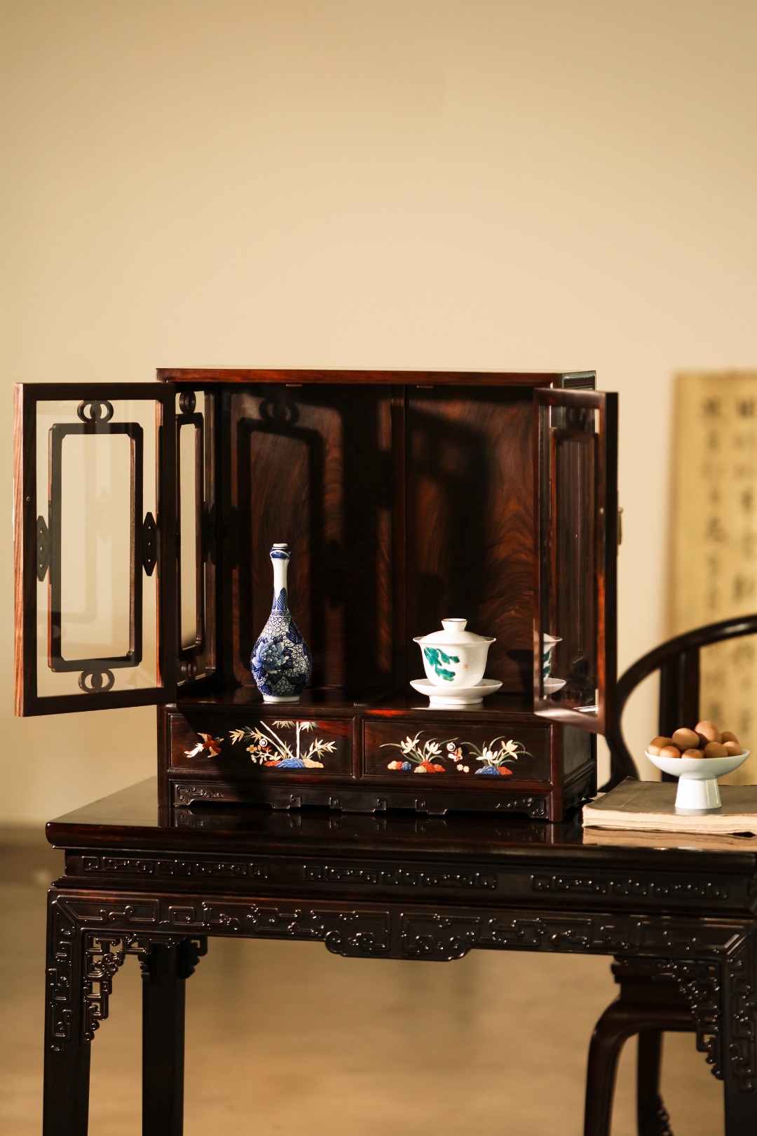 择取大红酸枝老料制,榫卯精工,三面玻璃透窗,抽屉面饰百宝嵌,琳琅满目。收纳有致,可陈设茶具、雅玩、章石等,案几陈置、收纳,素雅高级。