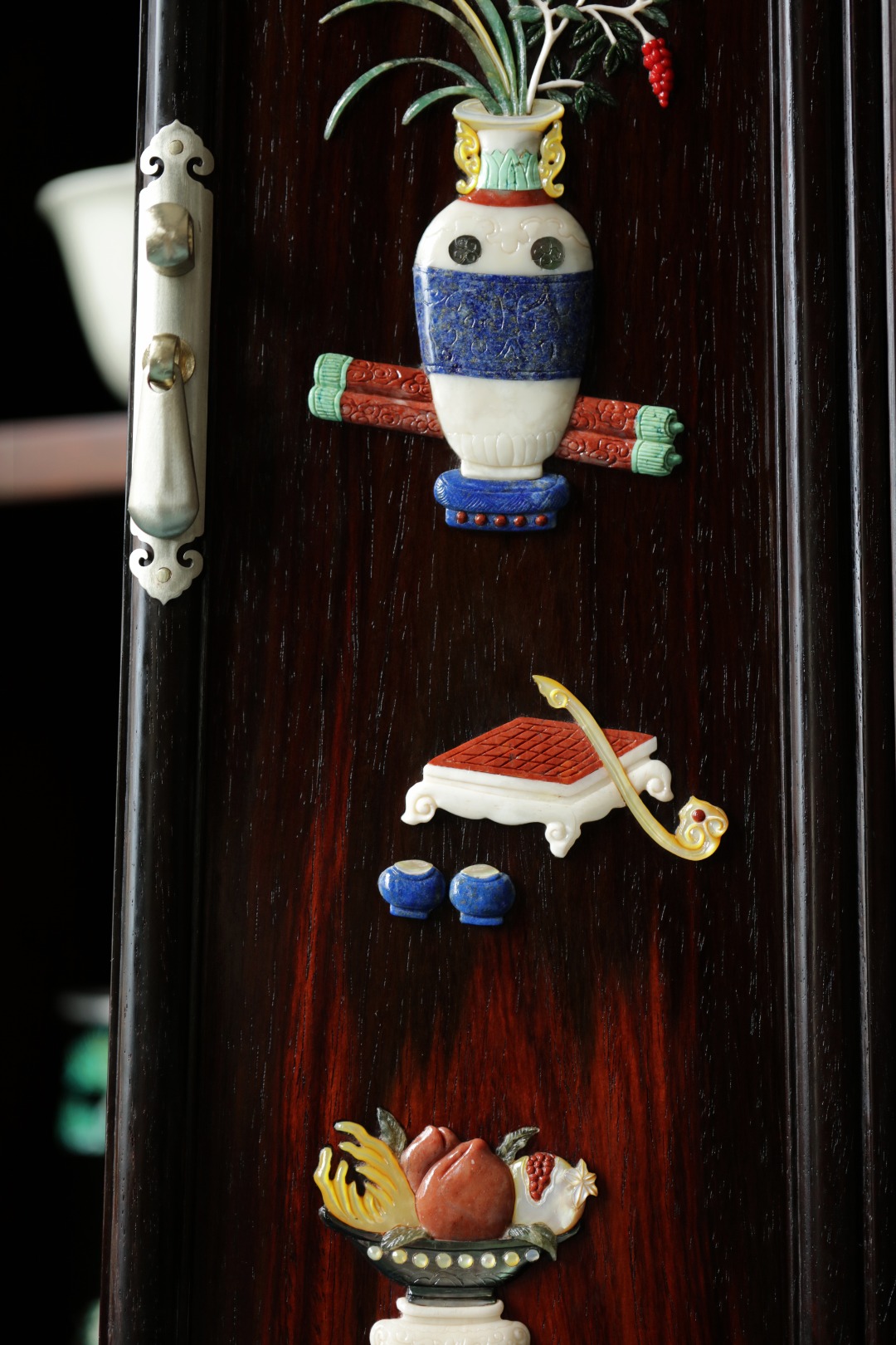 柜门百宝嵌清供博古图,缤纷琳琅。