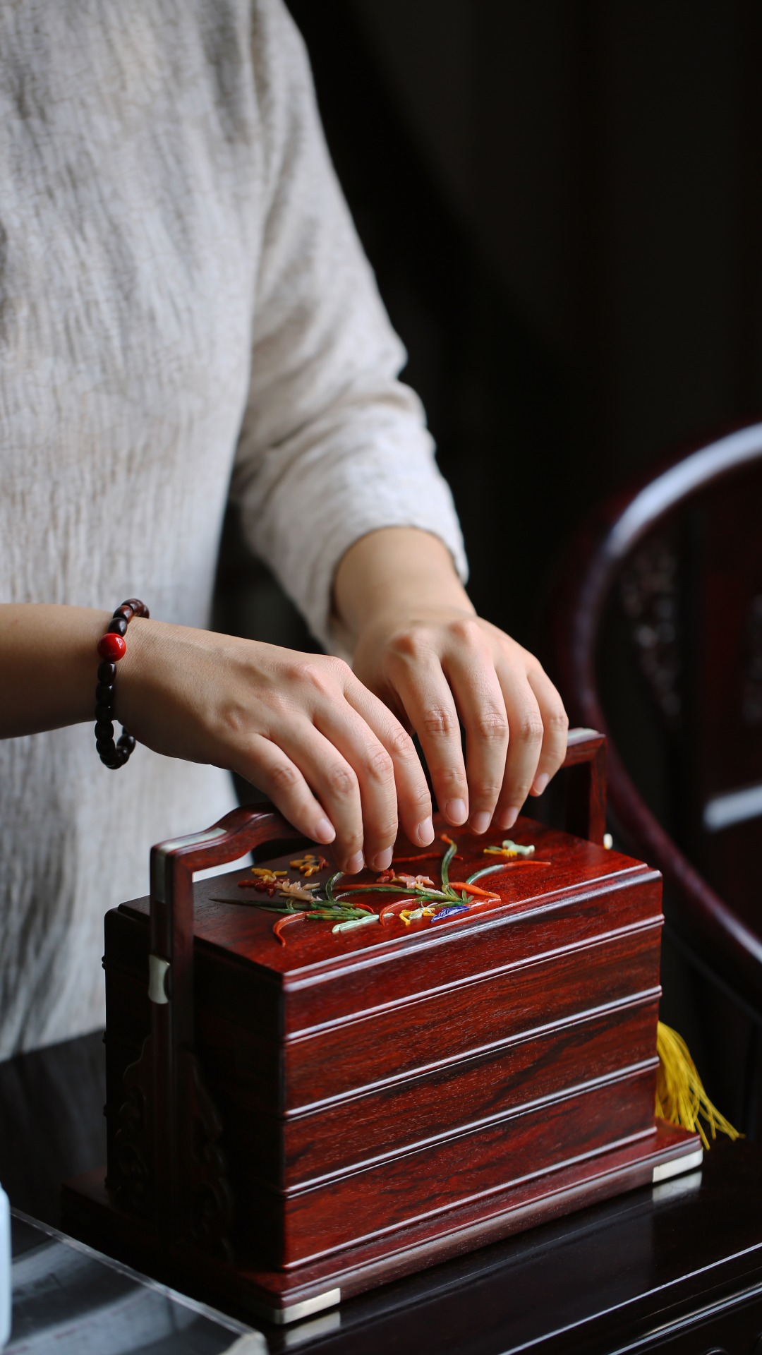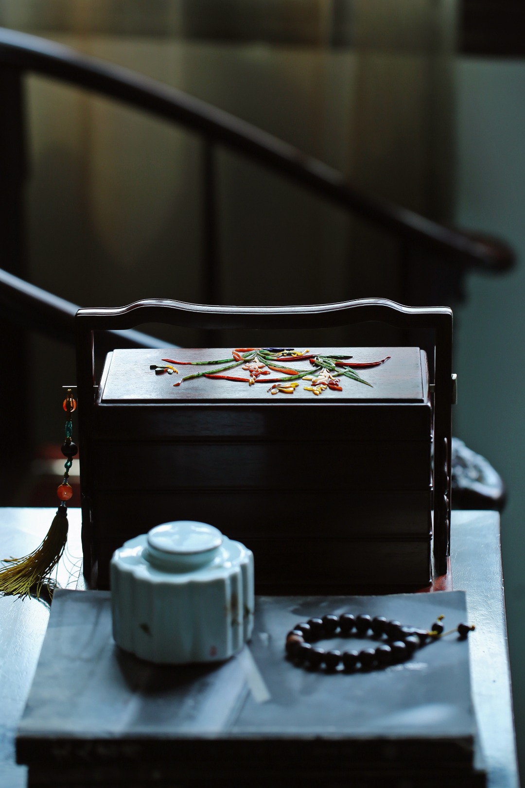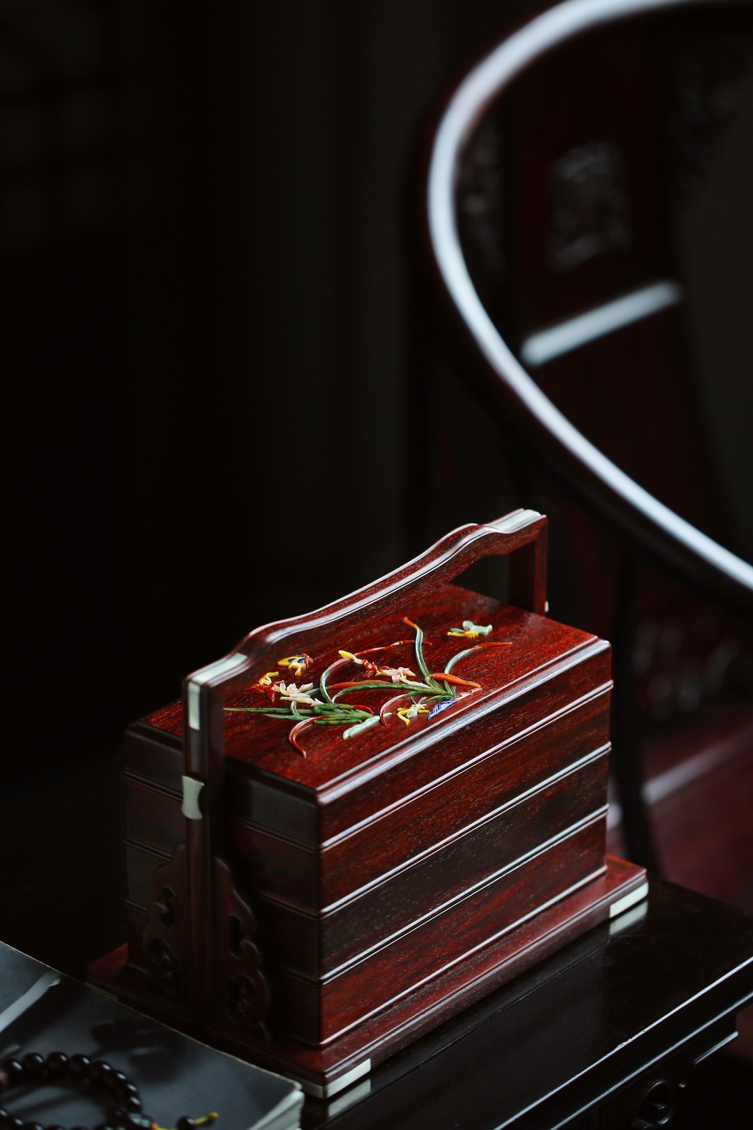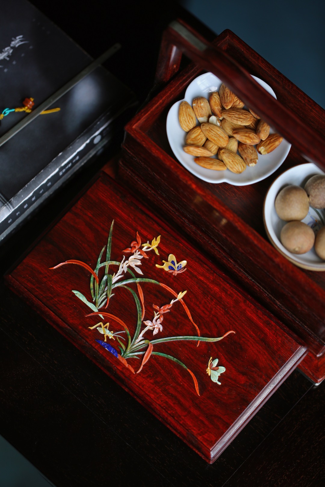 盒盖百宝嵌饰兰花纹,清新雅致;