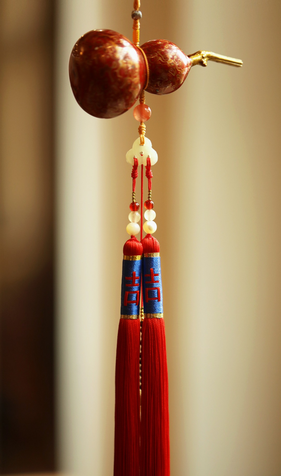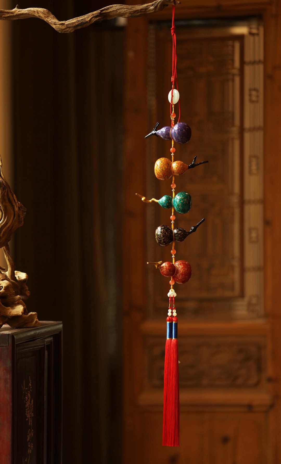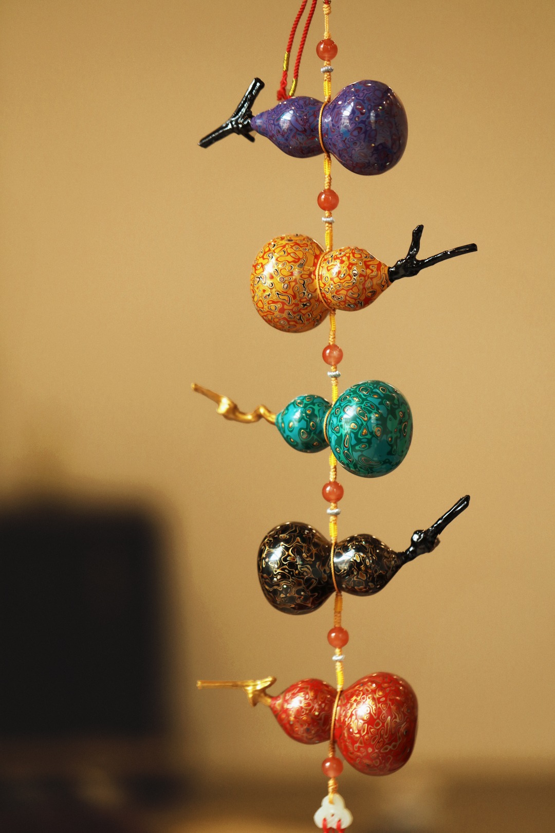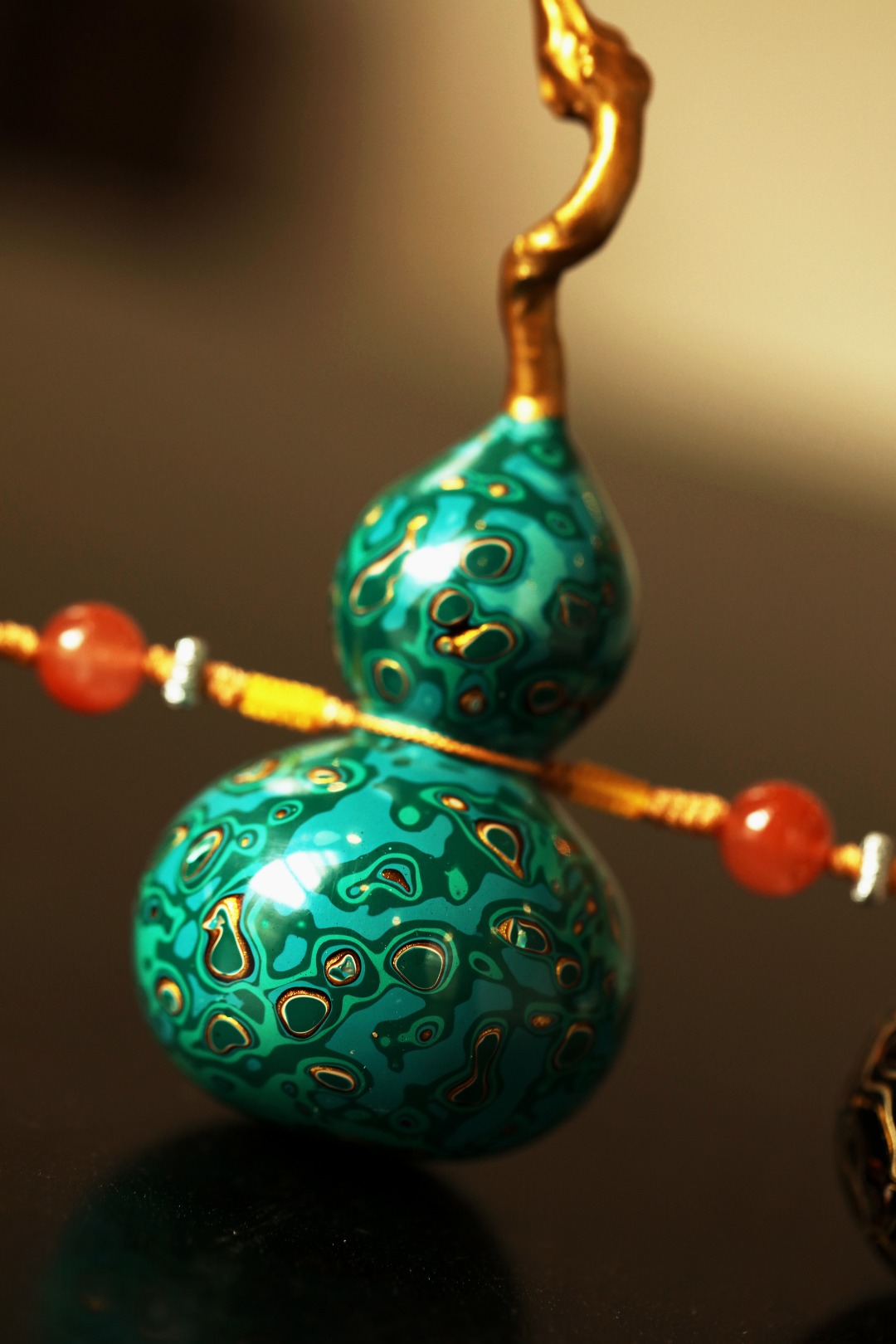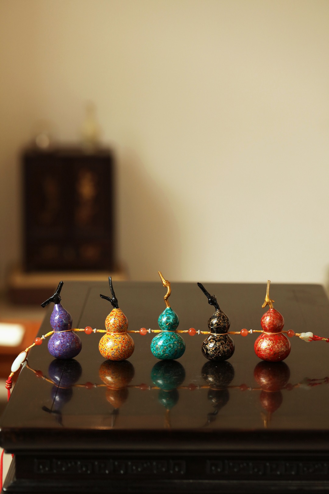 选取天然大葫芦,手工髹漆,镶嵌螺钿,反复打磨,色泽灿烂,复古绚丽。