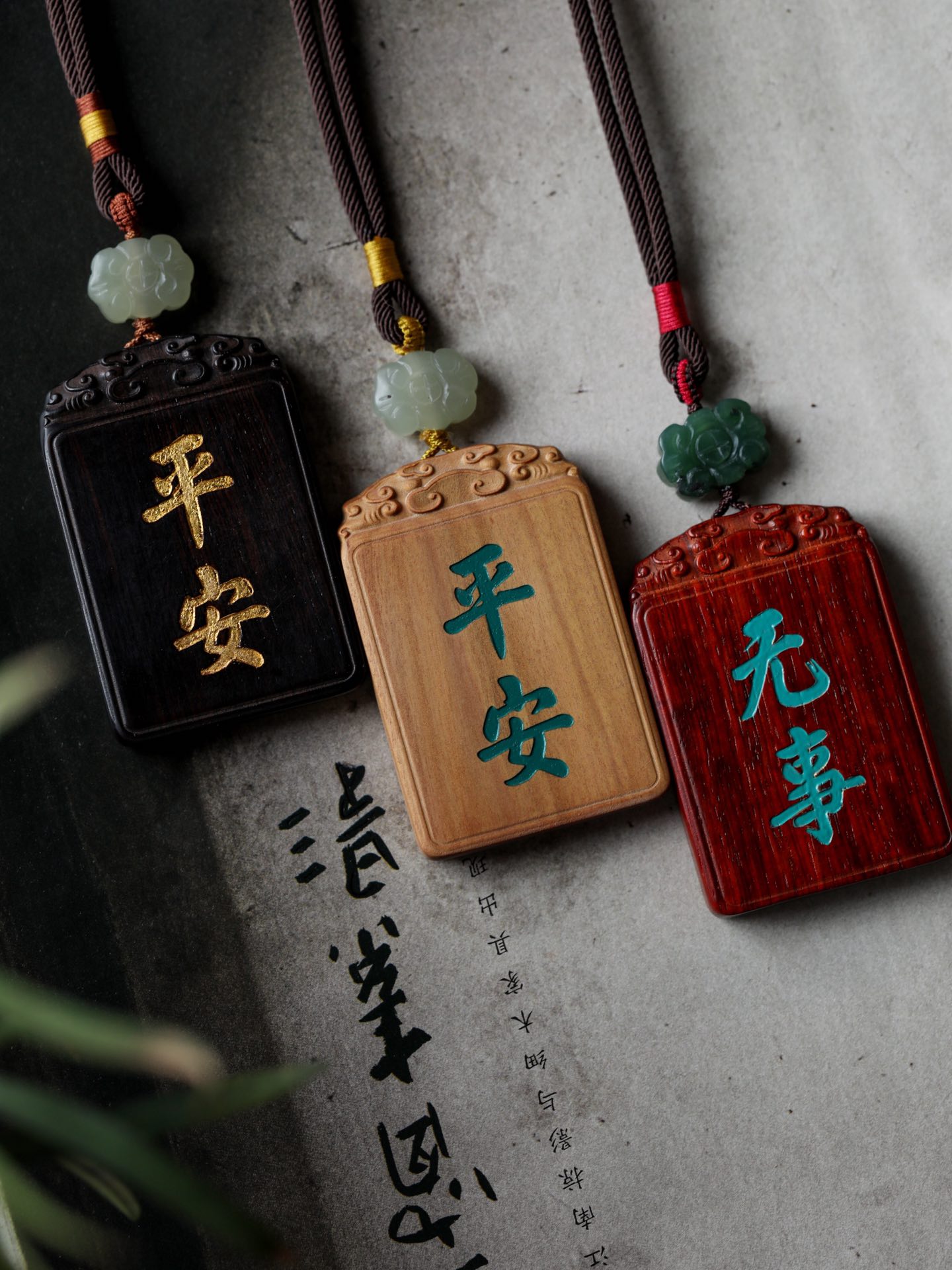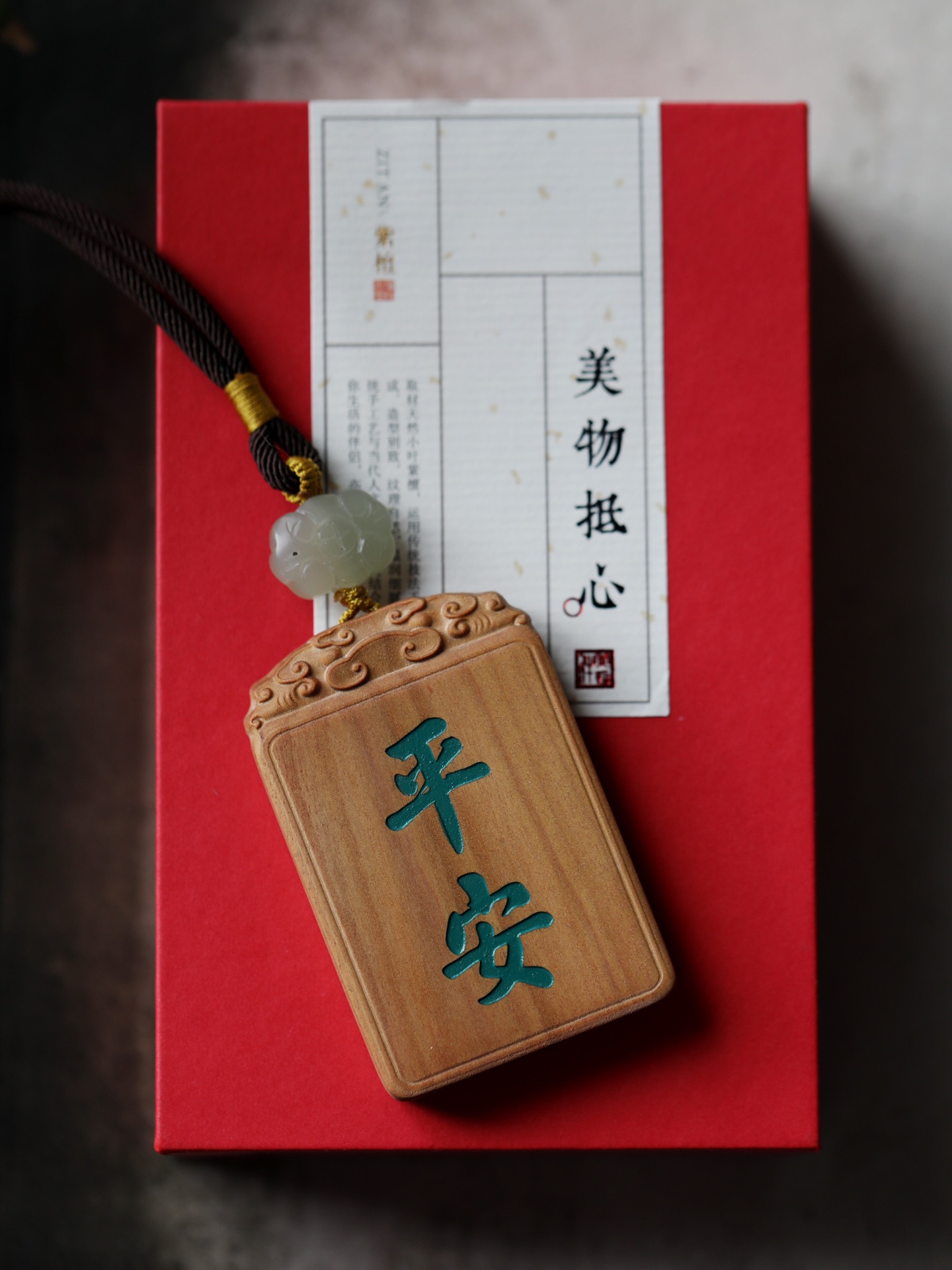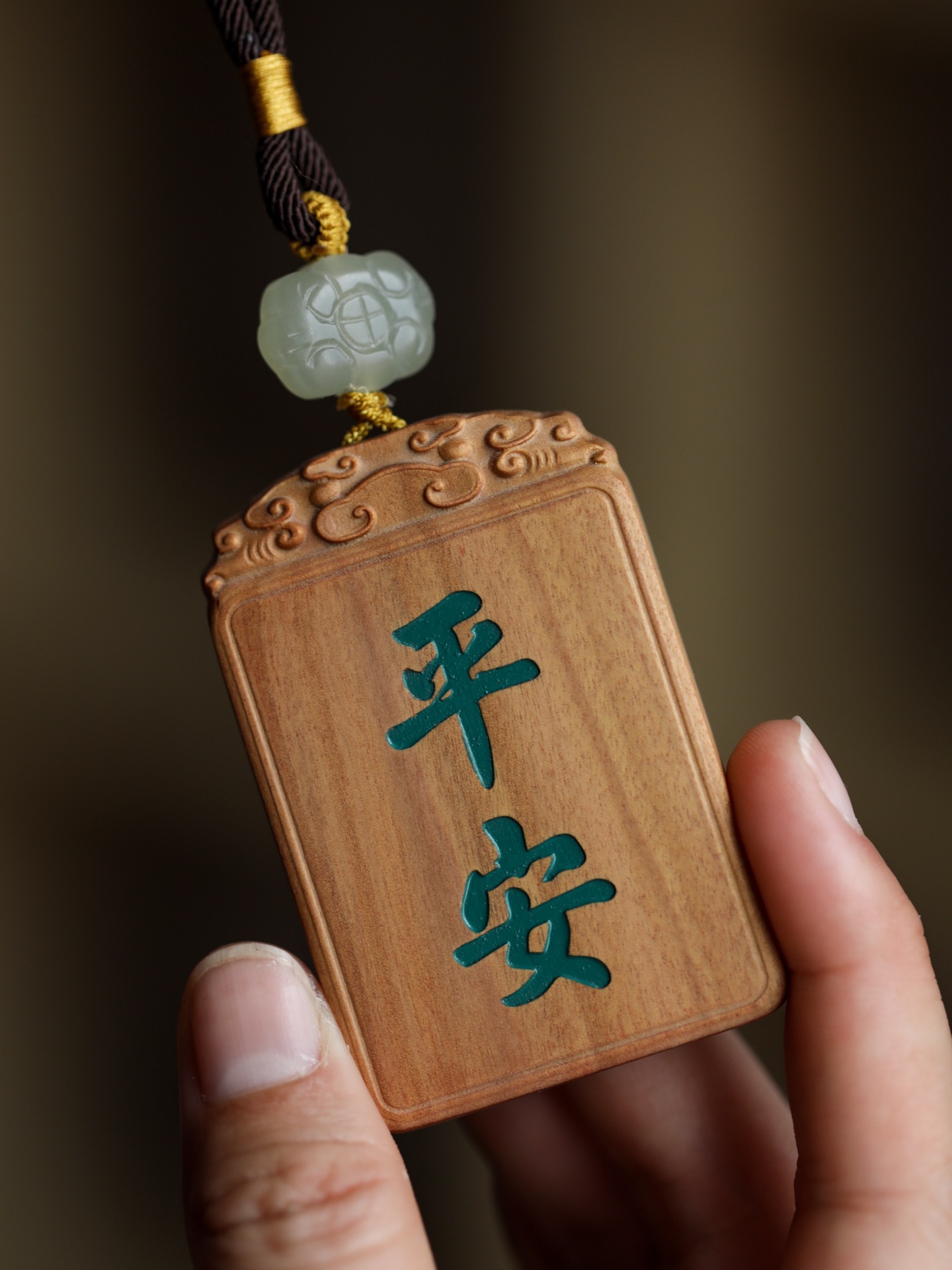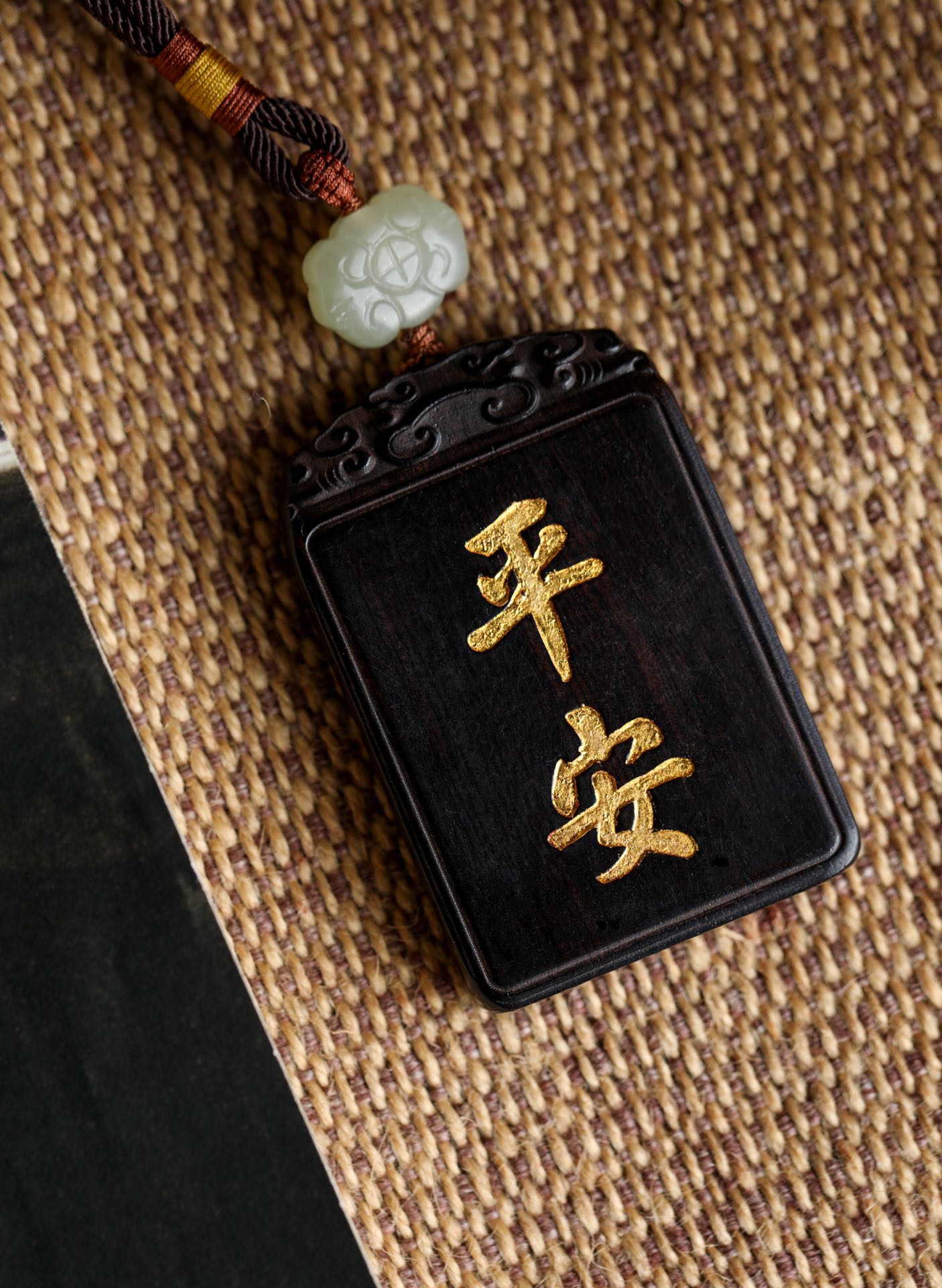 祥云如意牌正反面分别以大漆、金粉手绘平安、无事,祈愿美好。