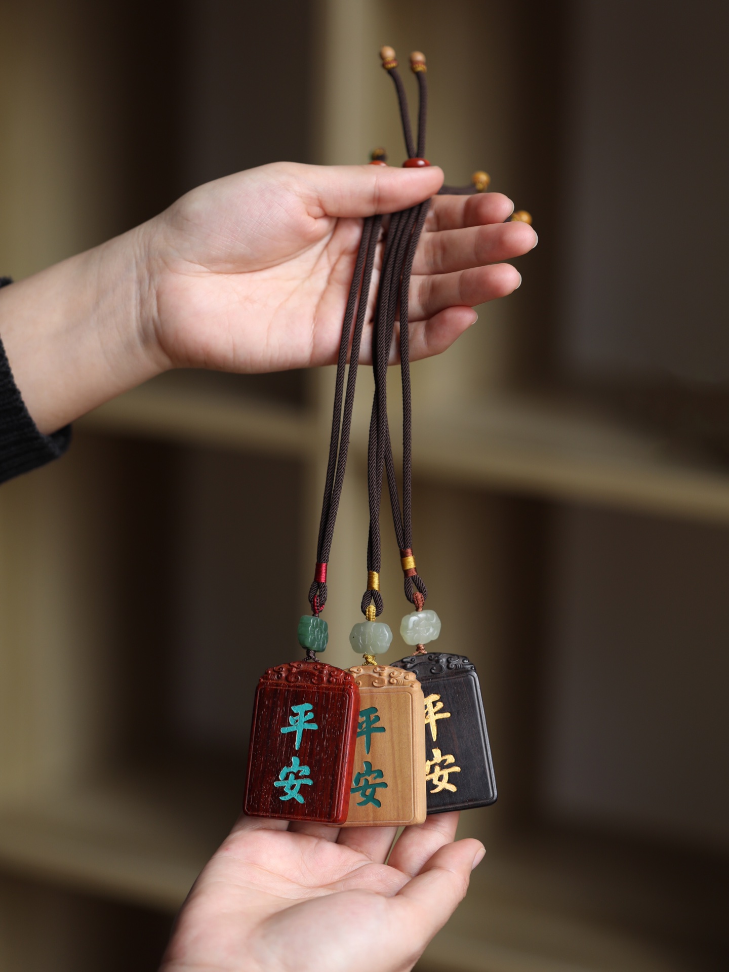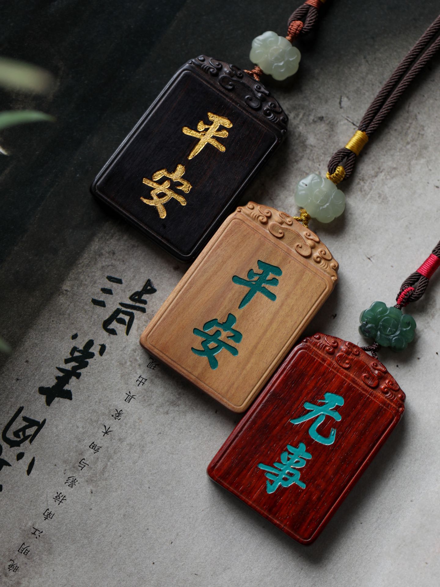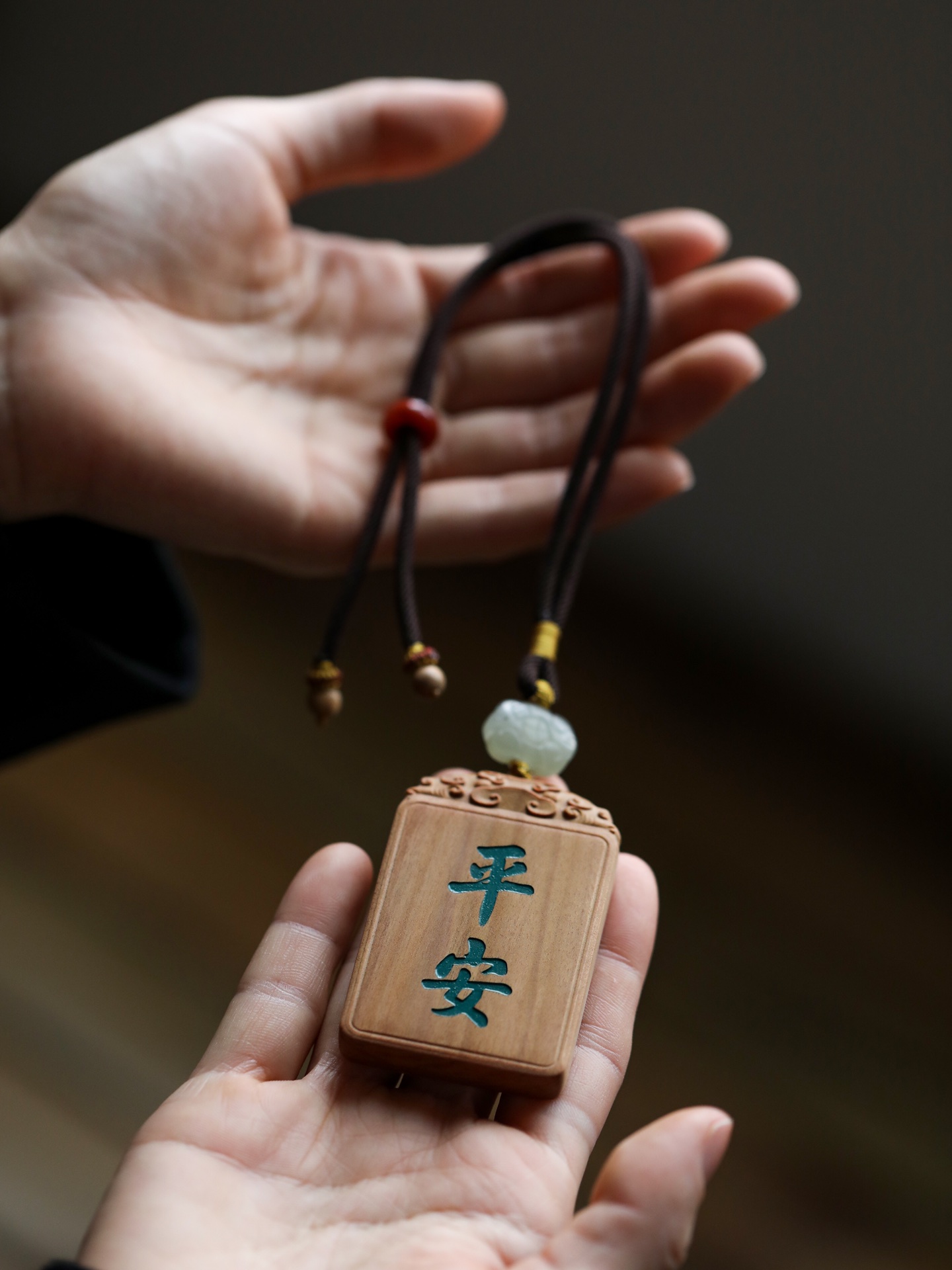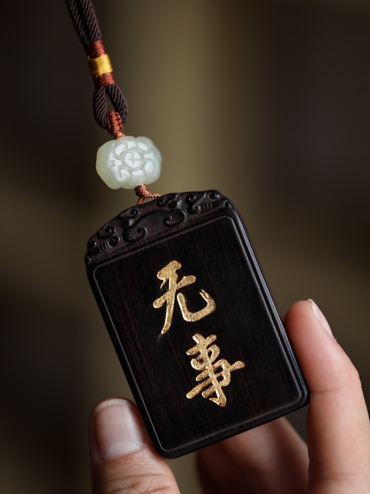 祥云如意牌正反面分别以大漆、金粉手绘平安、无事,祈愿美好。