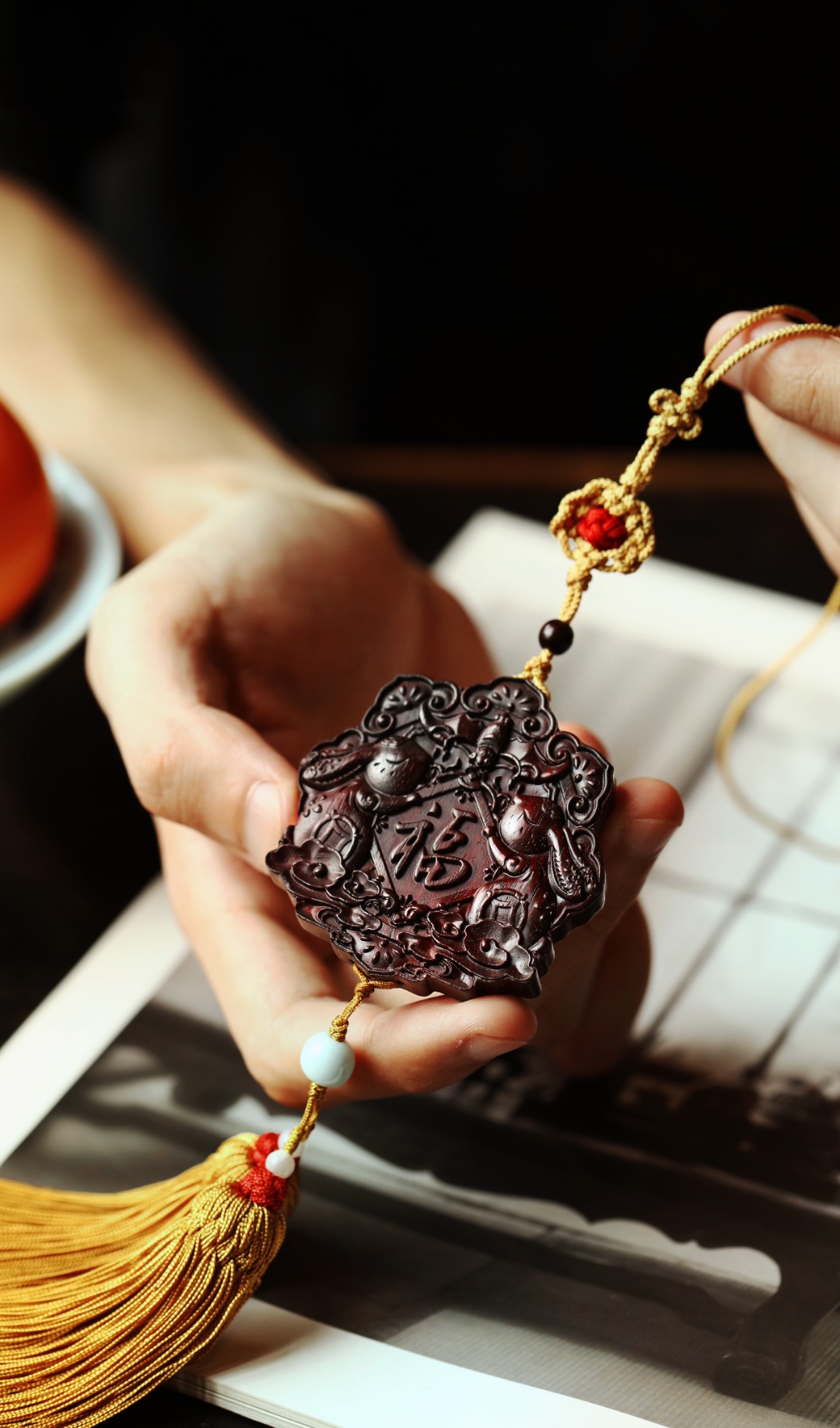 以紫檀为材,手工雕刻制作,