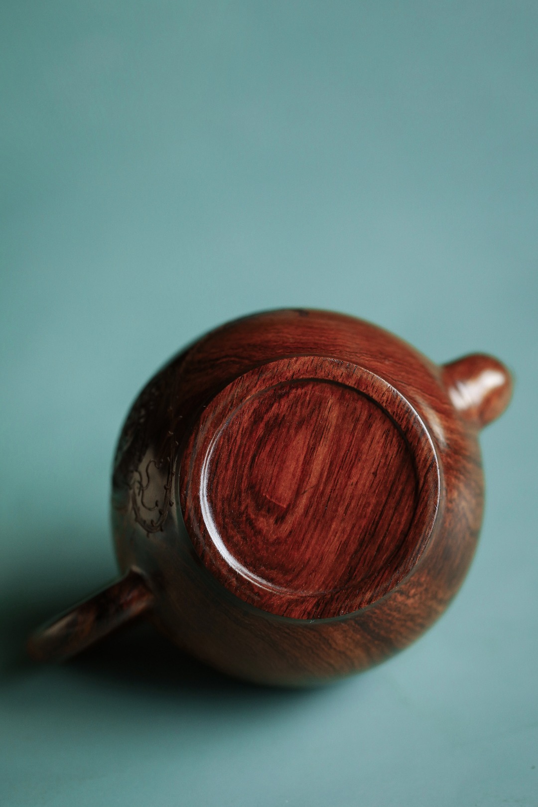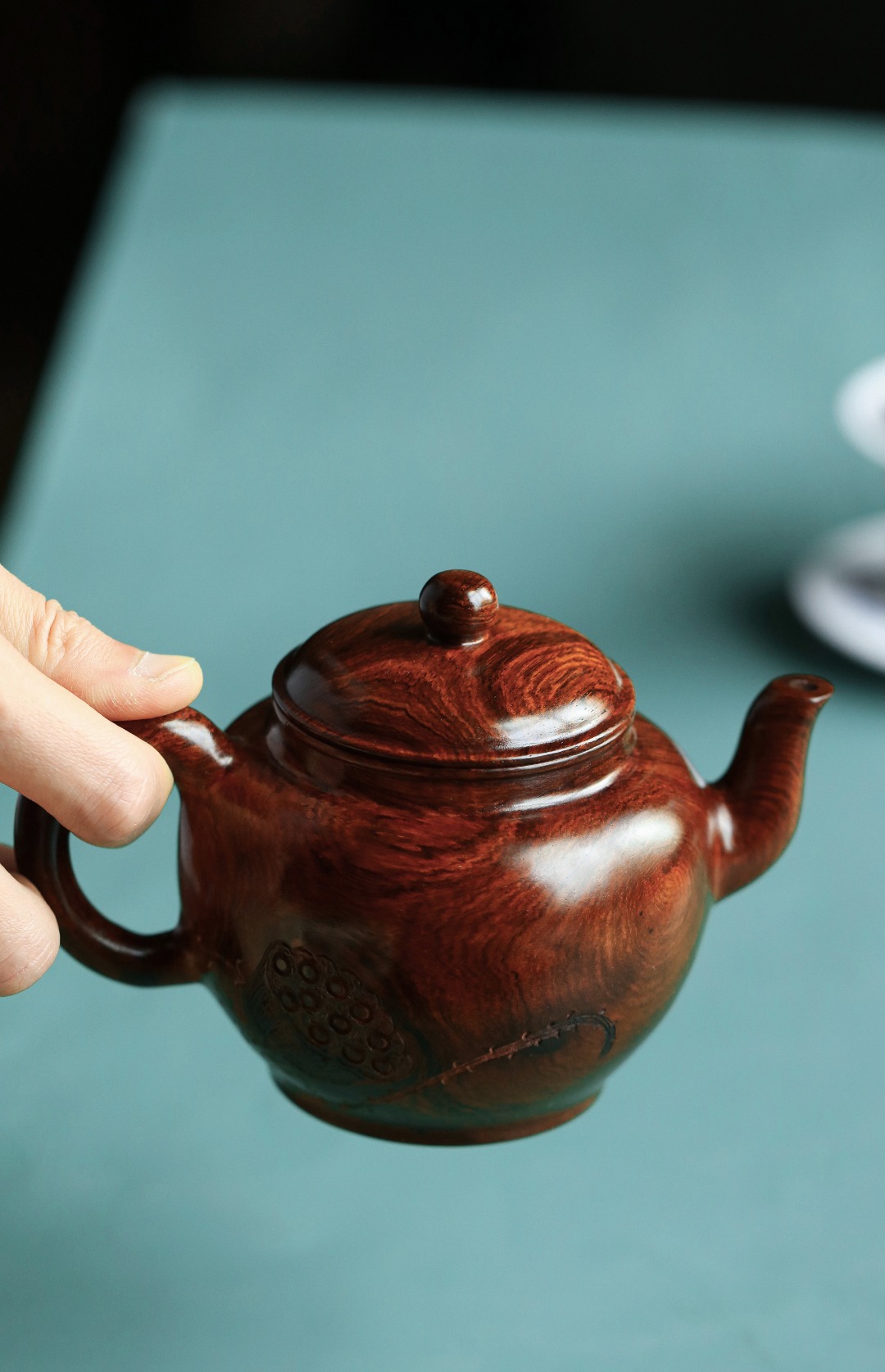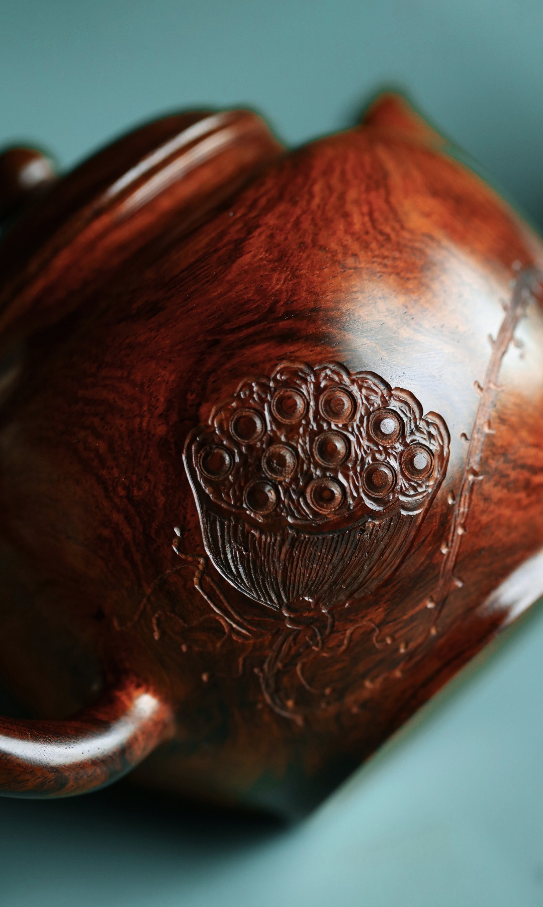 取材紫油梨老料,质感细腻。雕饰荷花古雅端正,一气呵成,壶体硕大,品工料俱佳,把玩陈设藏级精品。