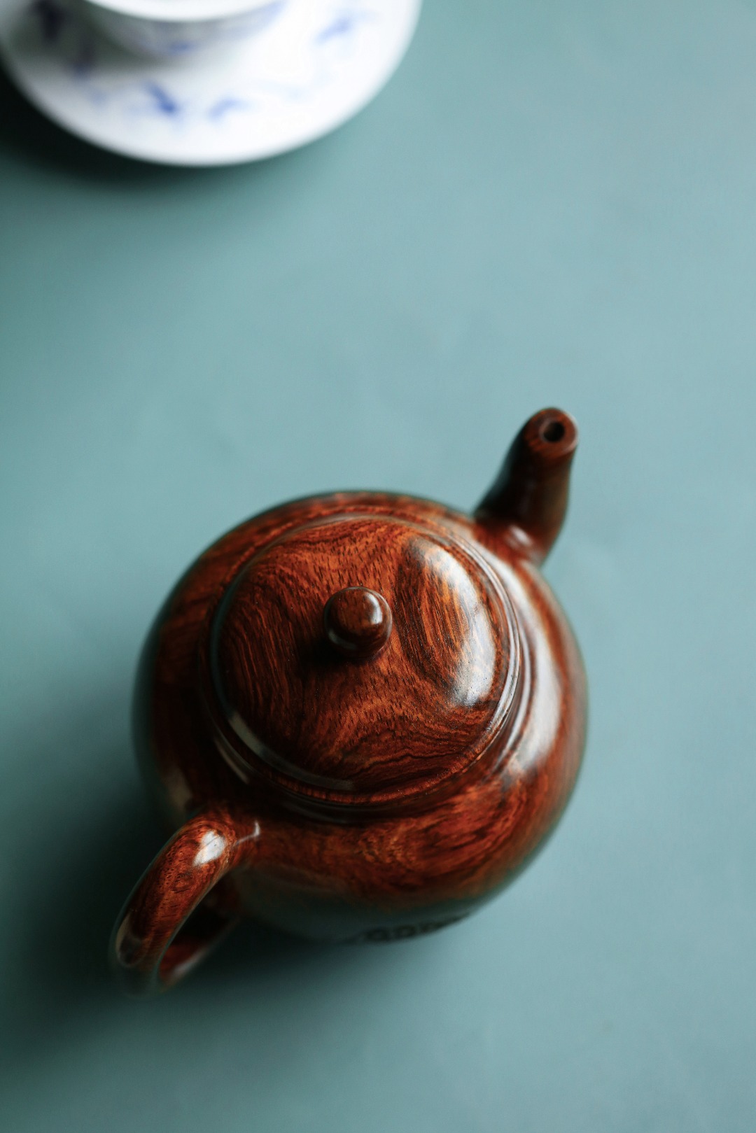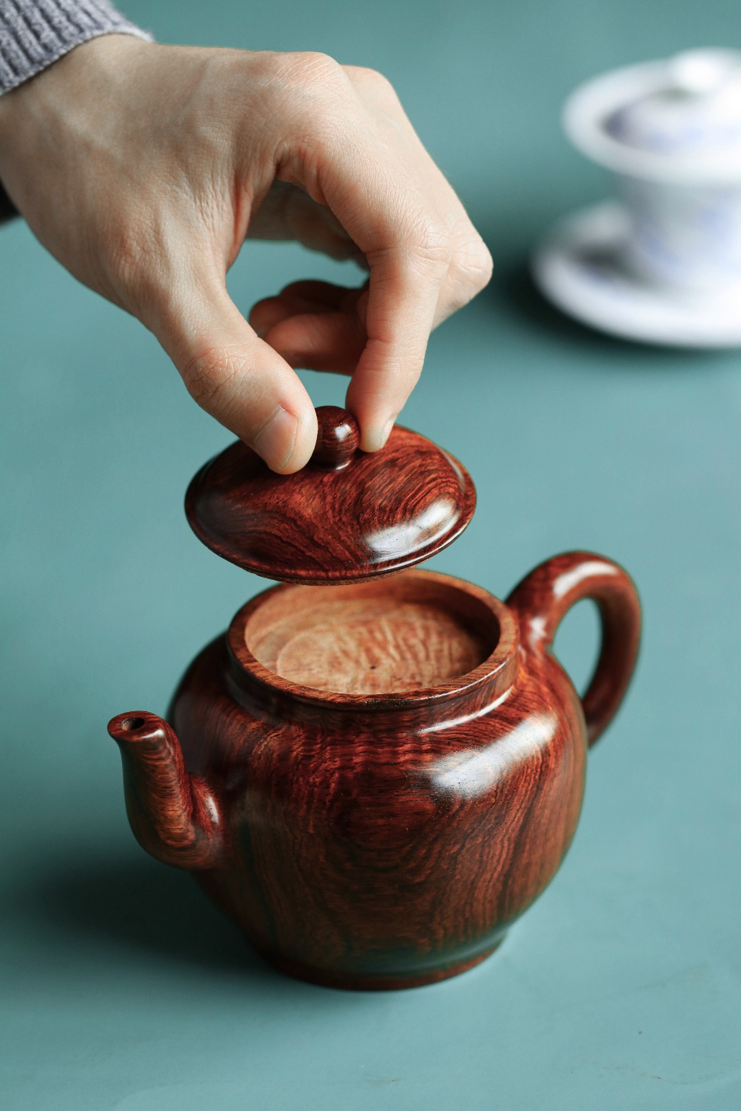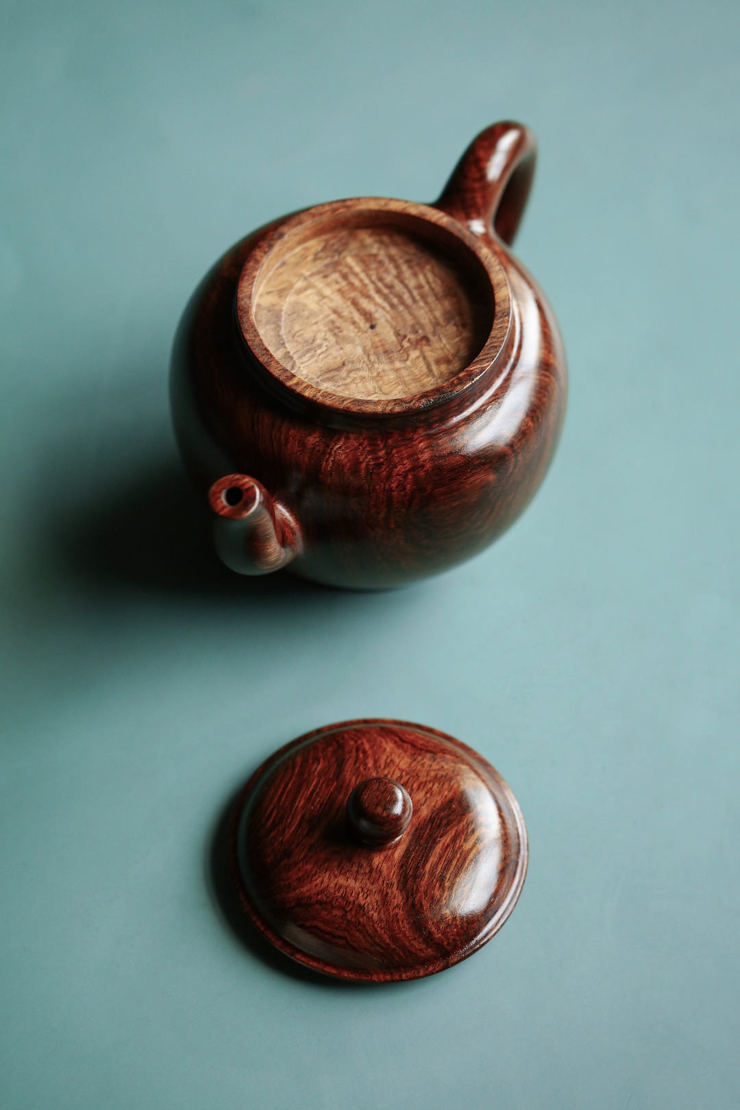 取材紫油梨老料,质感细腻。雕饰荷花古雅端正,一气呵成,壶体硕大,品工料俱佳,把玩陈设藏级精品。