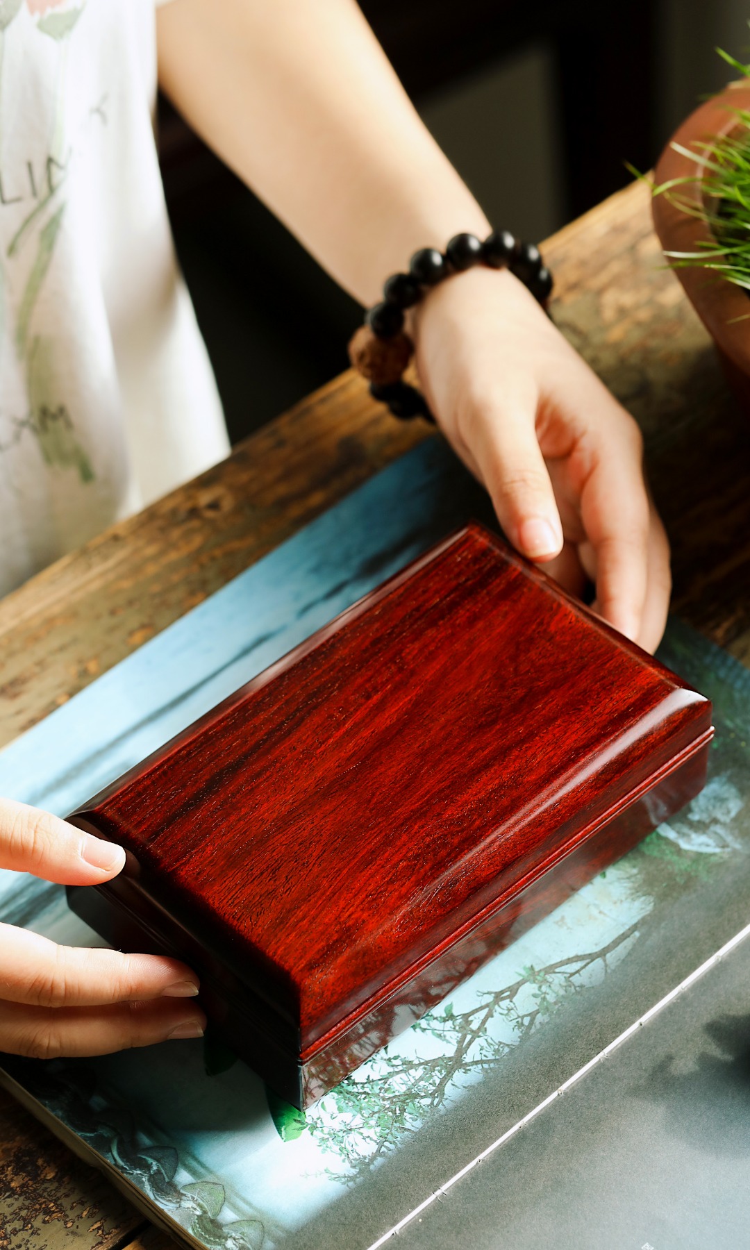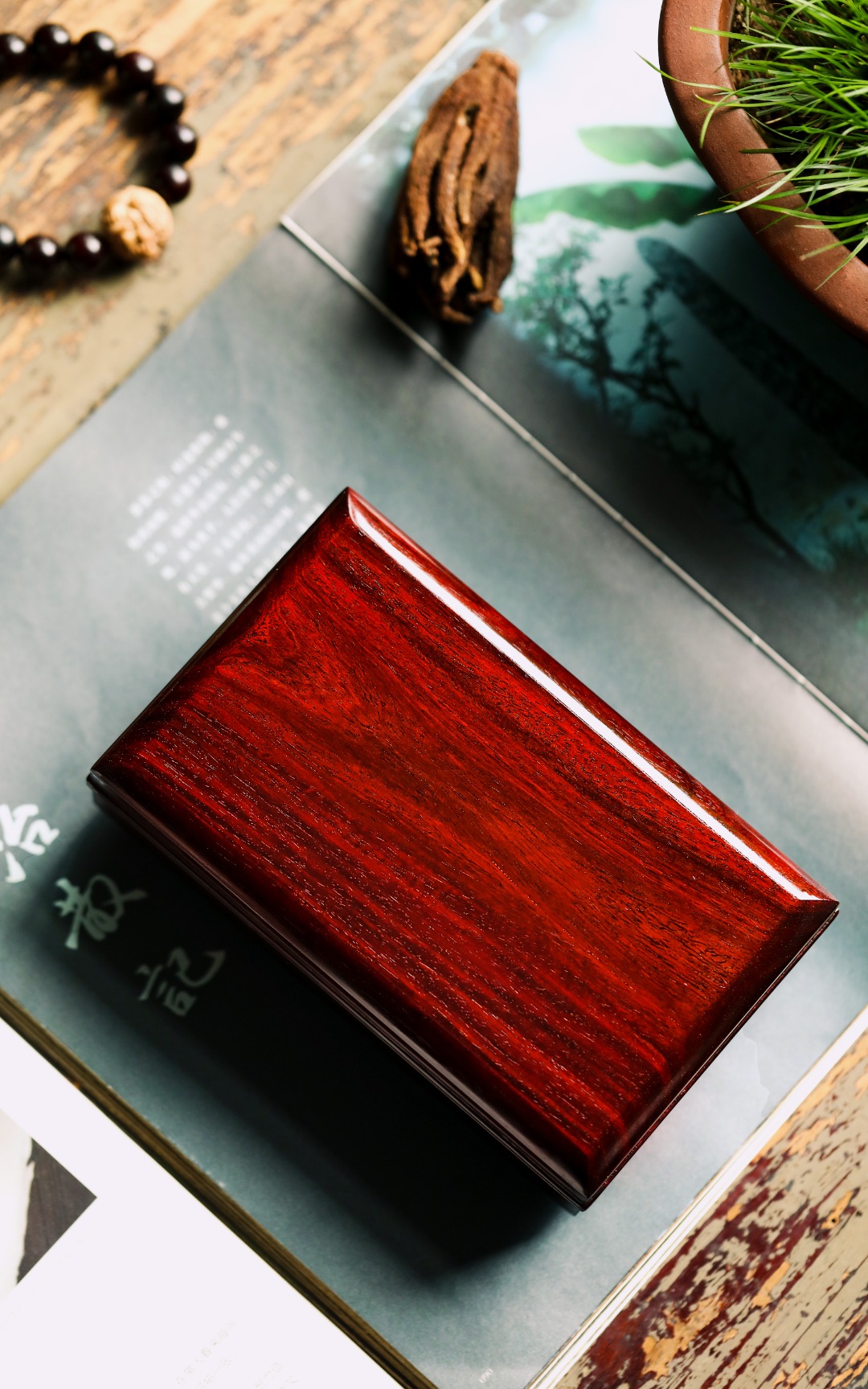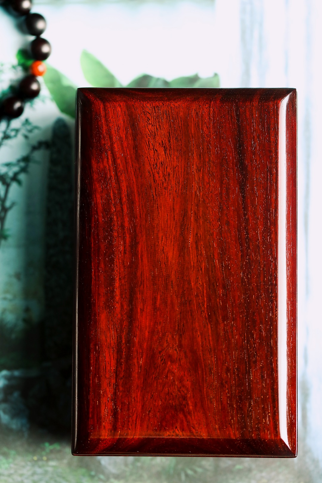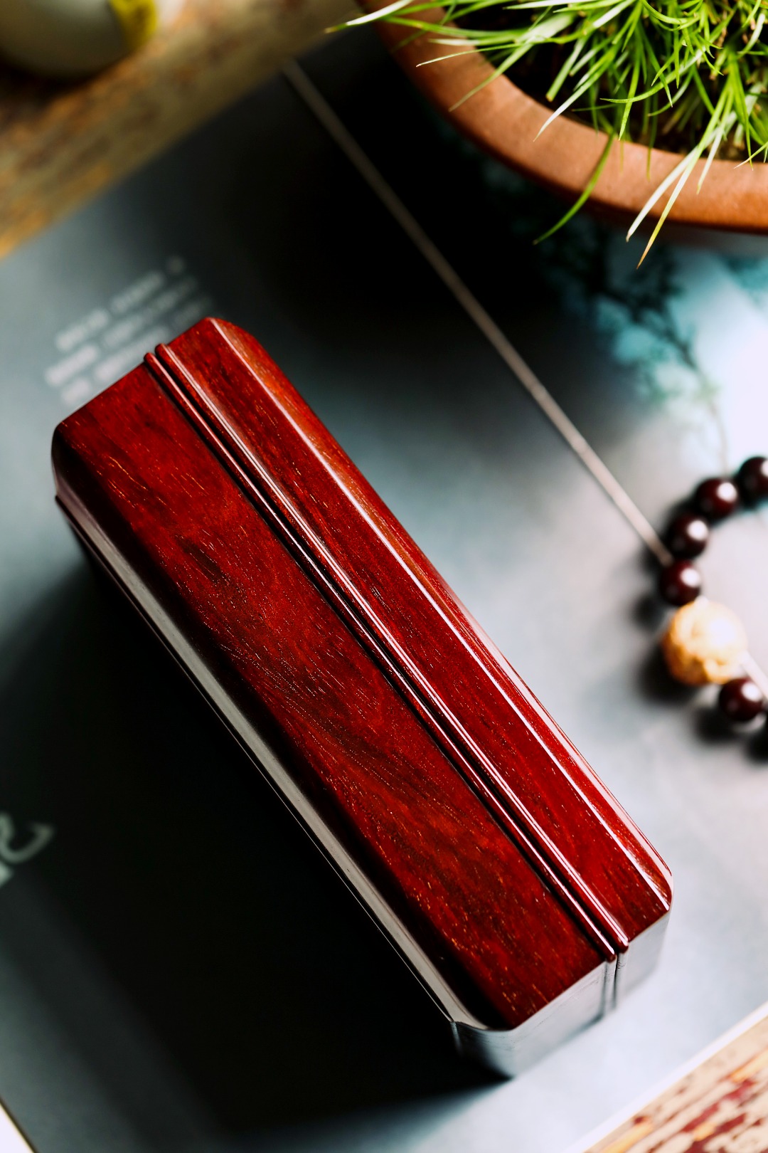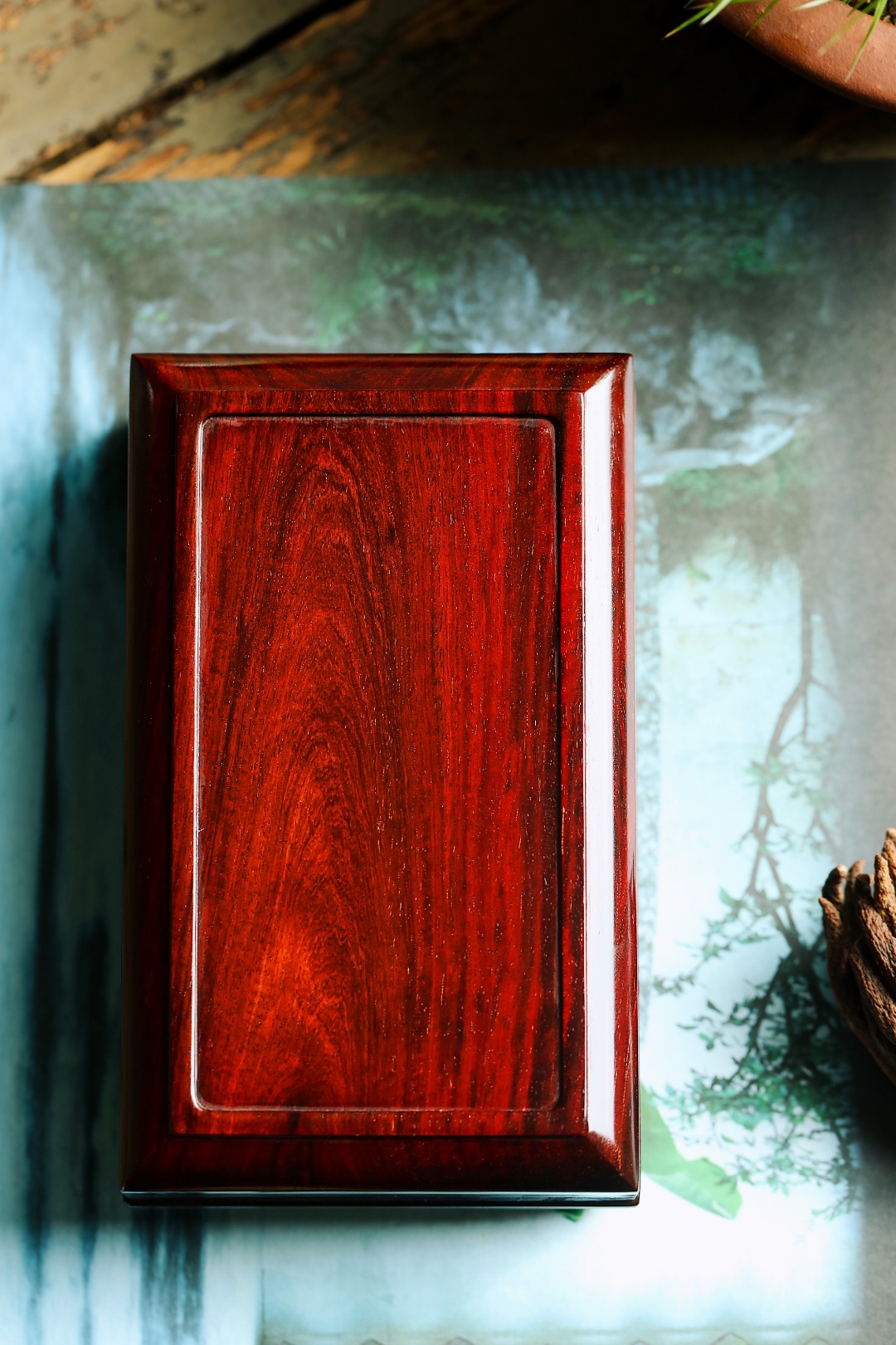 印度小叶紫檀一木整挖,料质细腻打磨光润,纹理美观,纹集金星鱼鳞底,细节做工考究,收纳章石,隽永雅致。