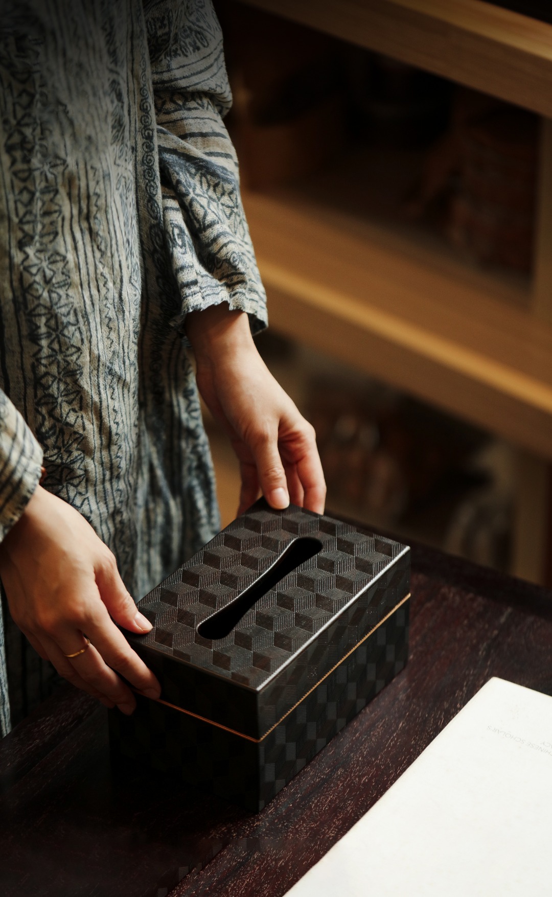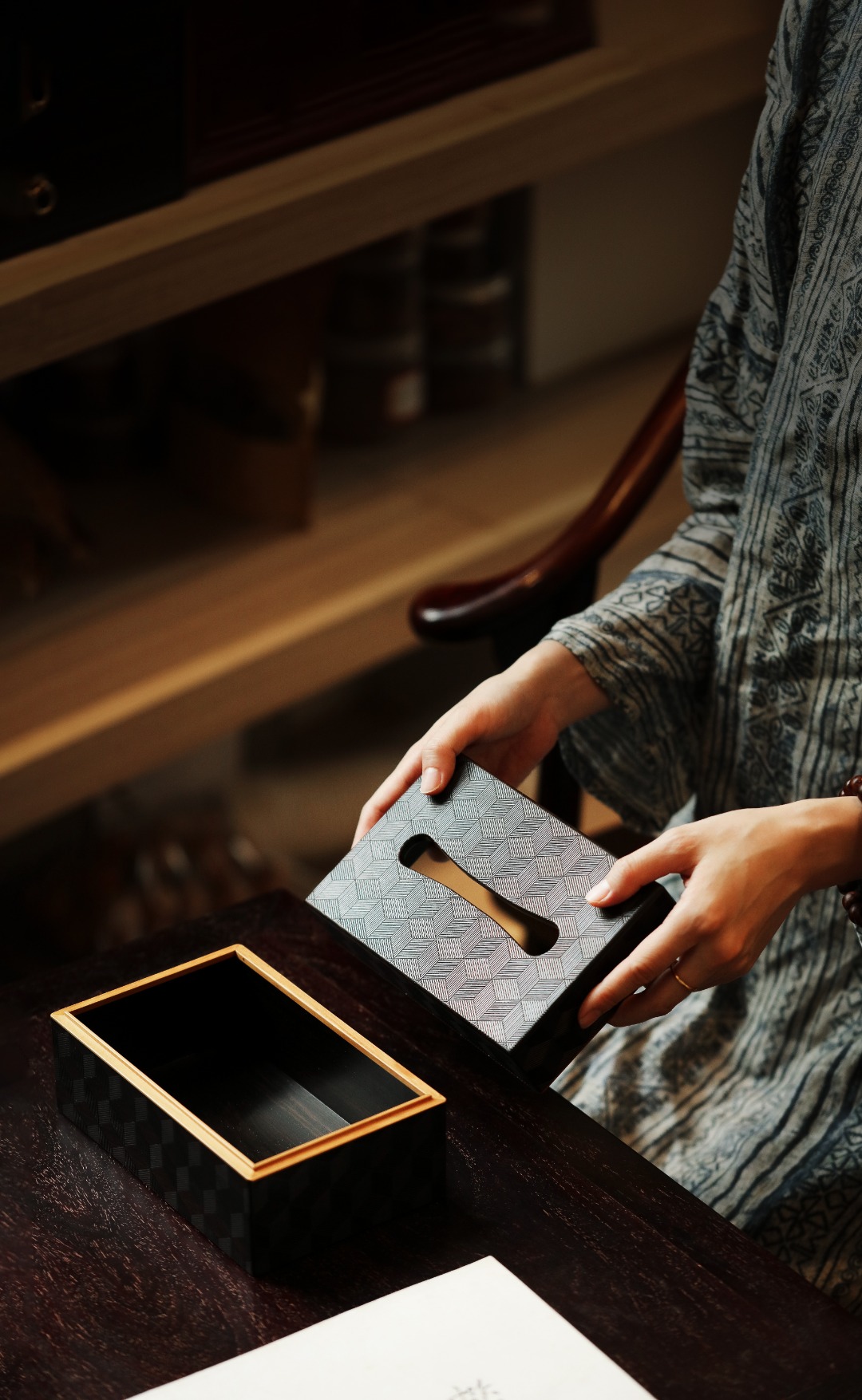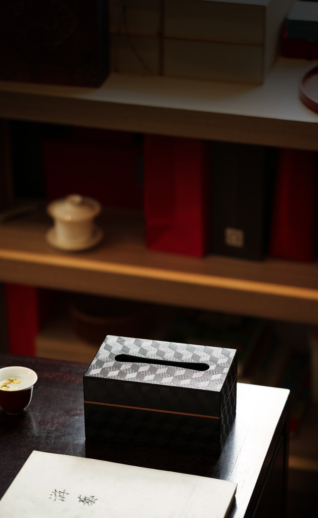紫檀老料榫卯制盒,精致小巧,面镶百宝玉石,腰身银丝回纹,以作装饰,明艳夺目,颇显精制奢华。