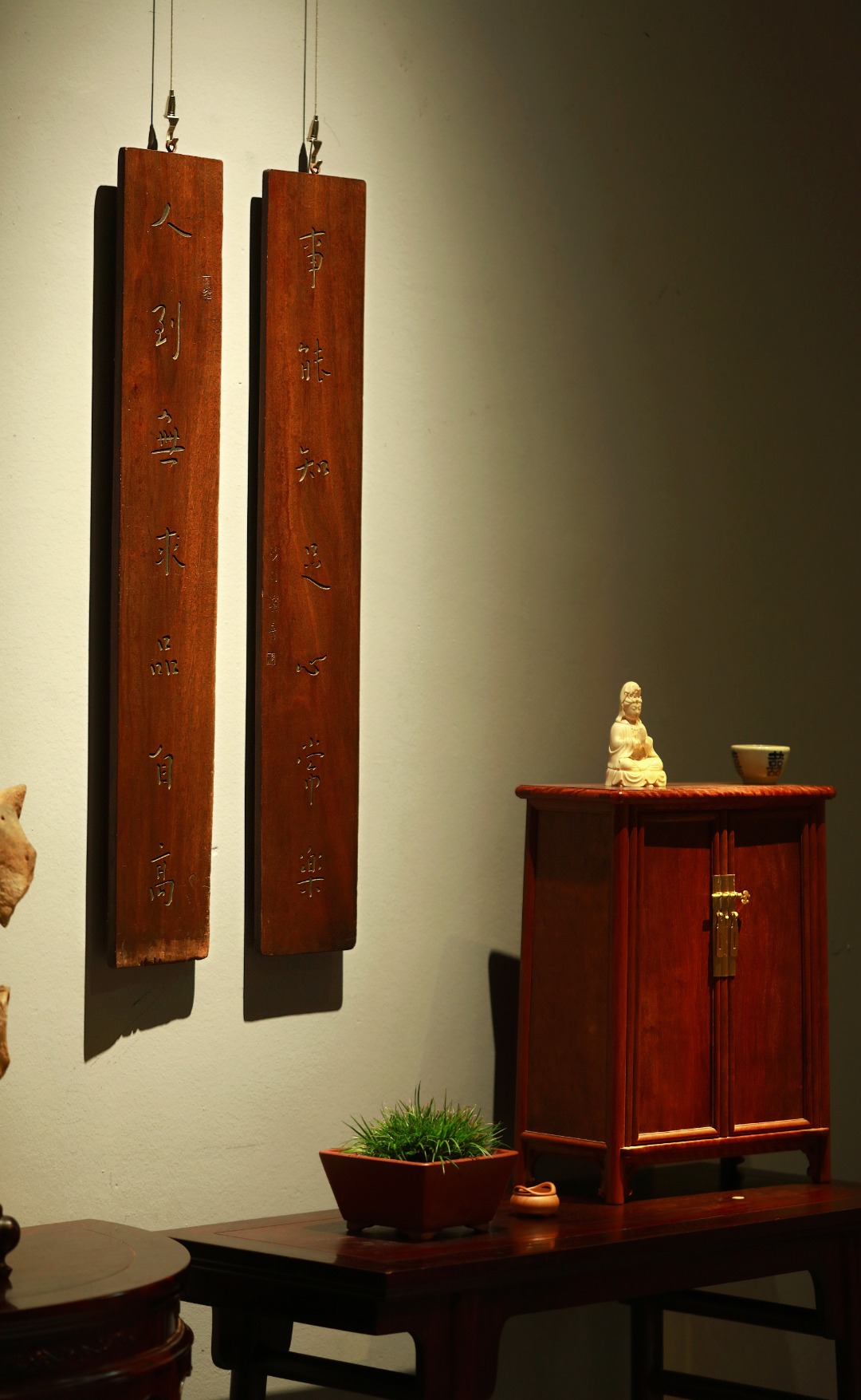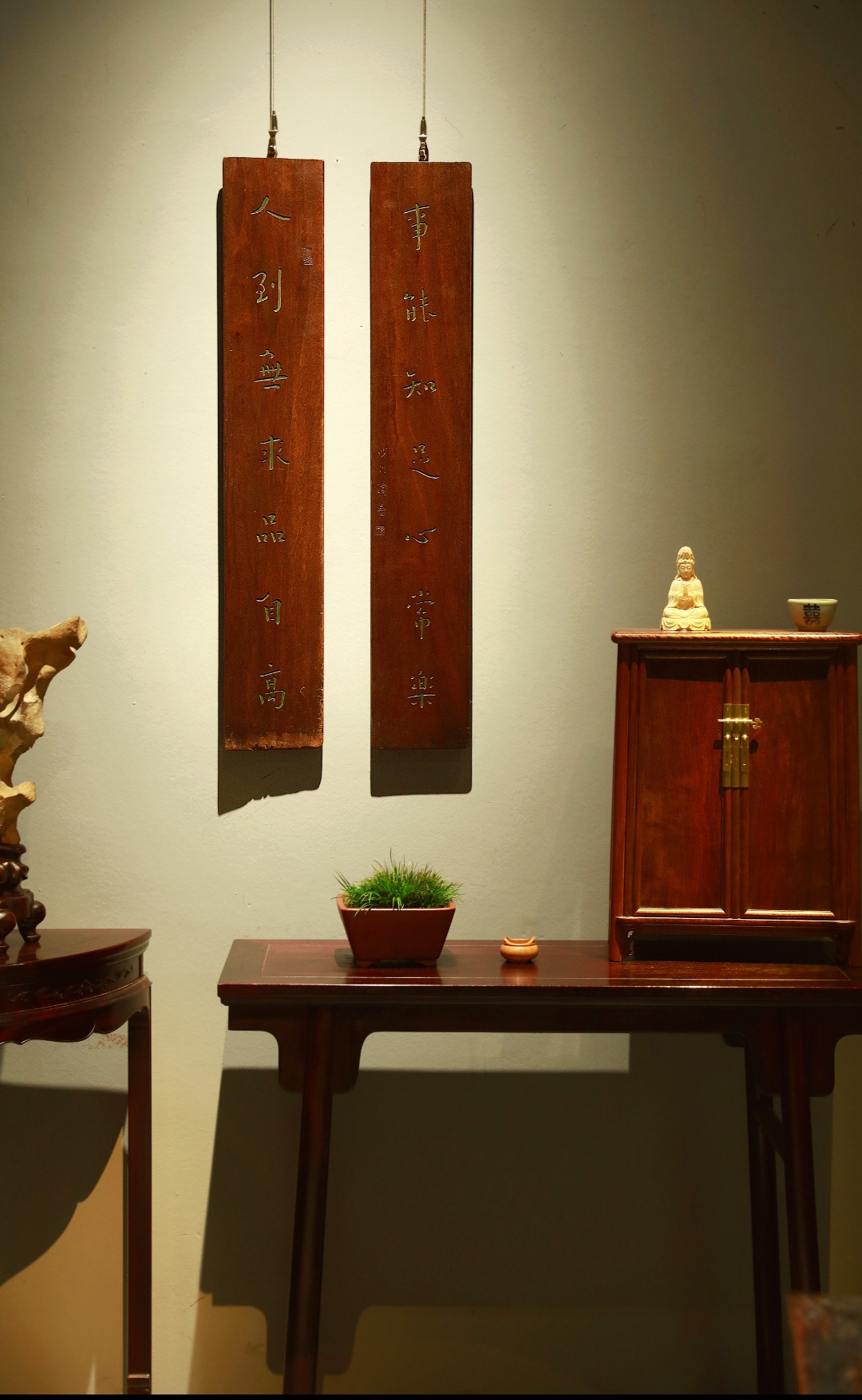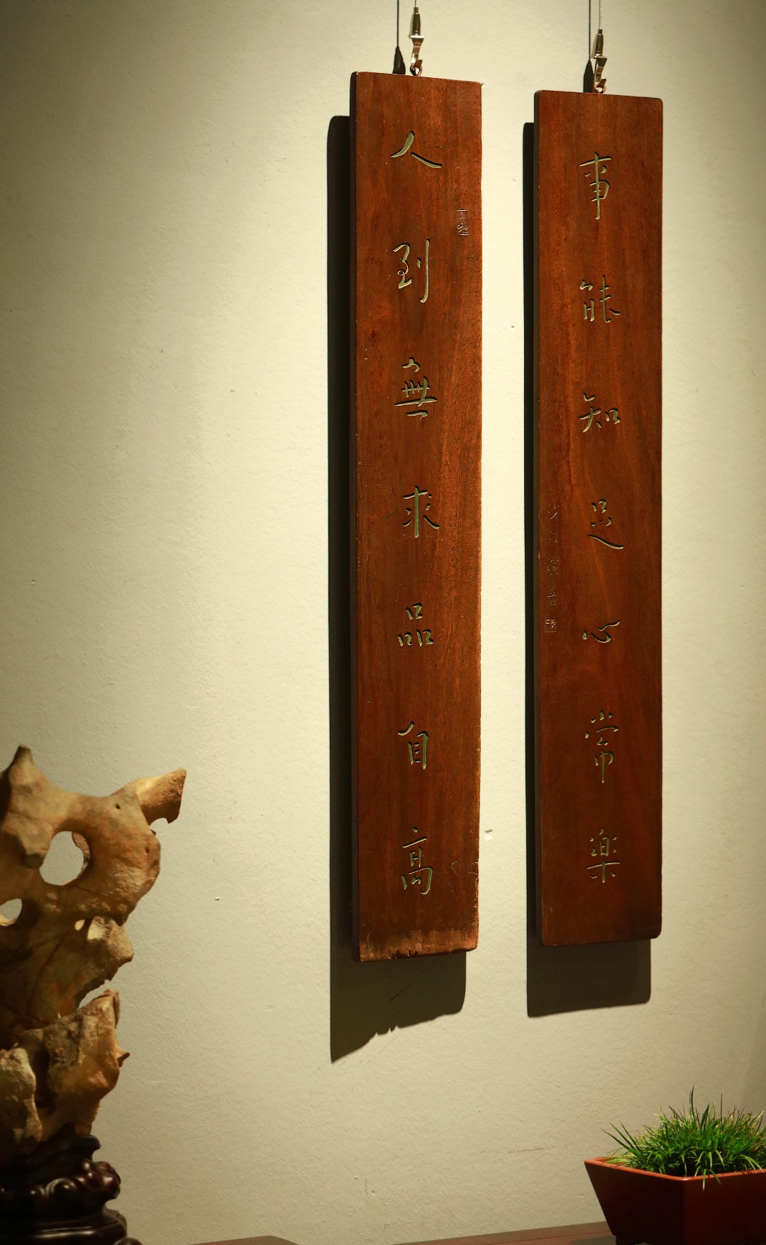 取旧时老板料,手刻对联,矿彩漆绘,原皮壳沉着古朴,悬于茶室、空间,深得意象真趣,人生理趣,为文房雅室佳选。