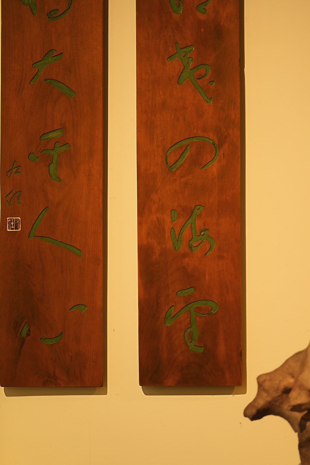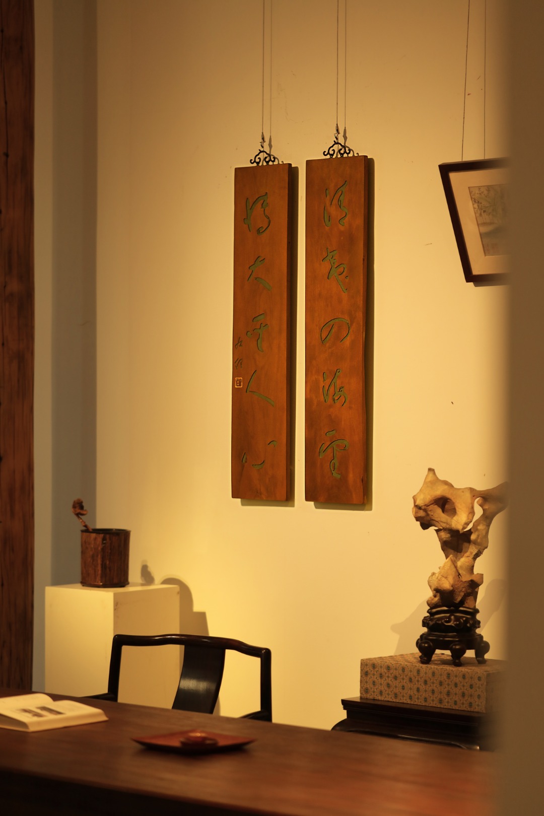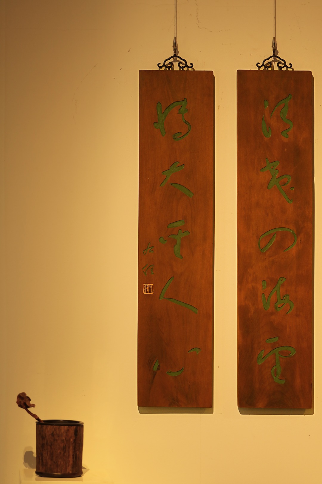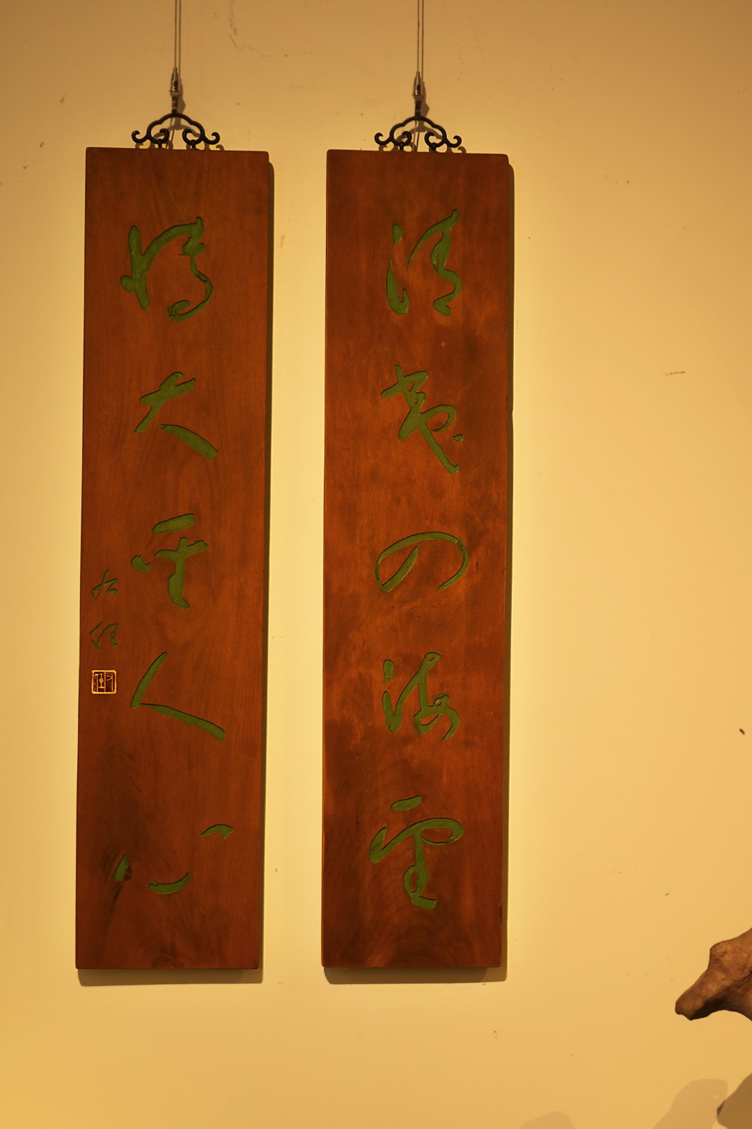 取旧时老板料,手刻对联,大漆描绘,原皮壳沉着古朴,悬于空间,深得意象真趣,人生理趣,为文房雅室佳选。